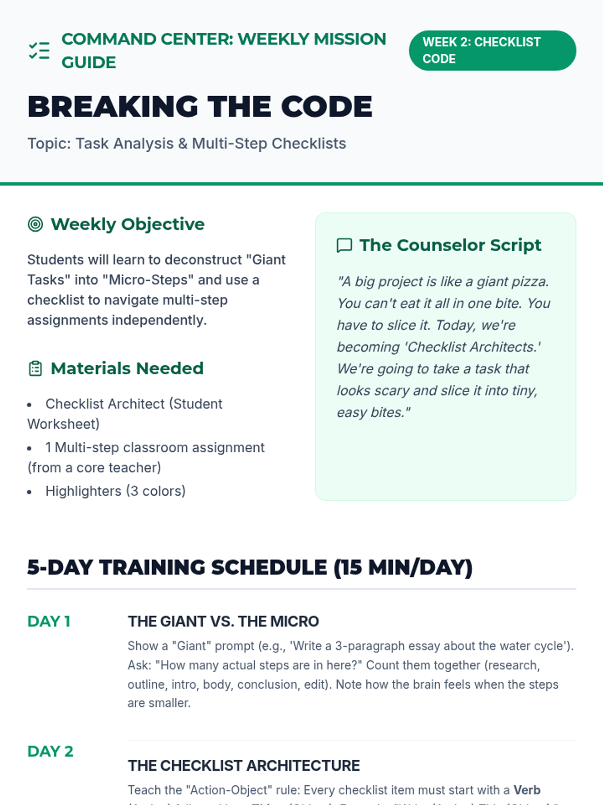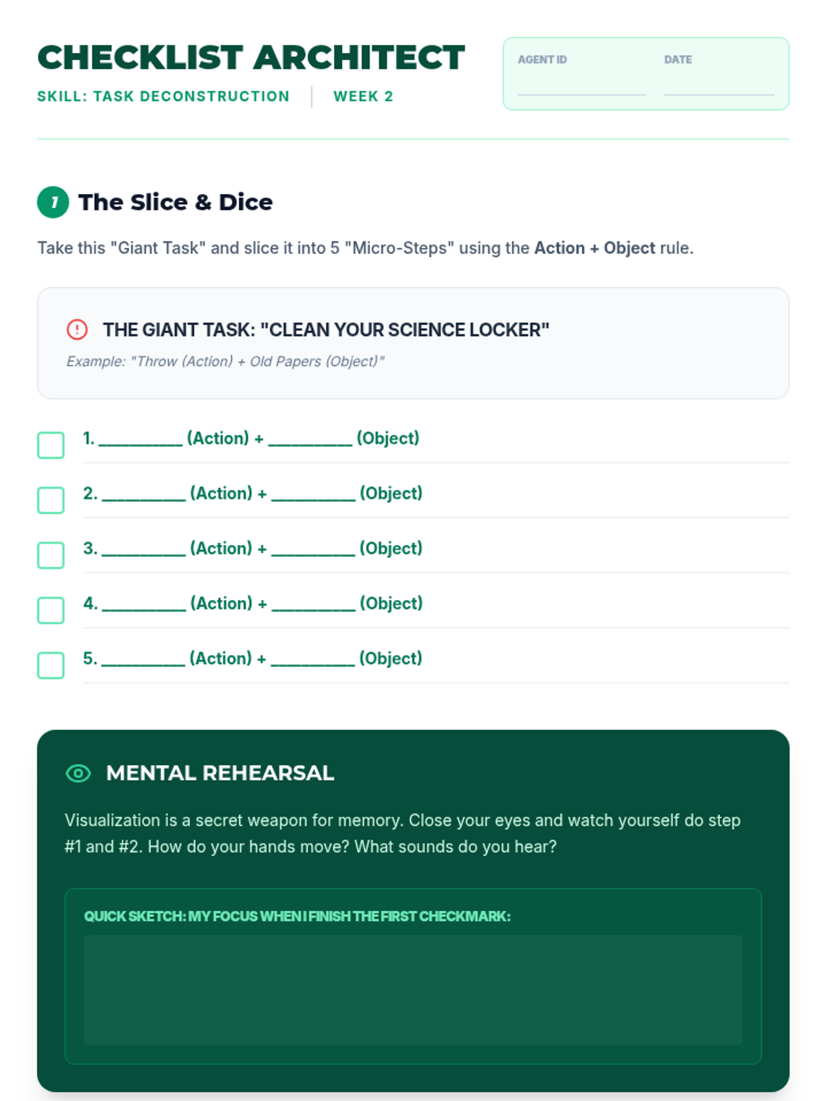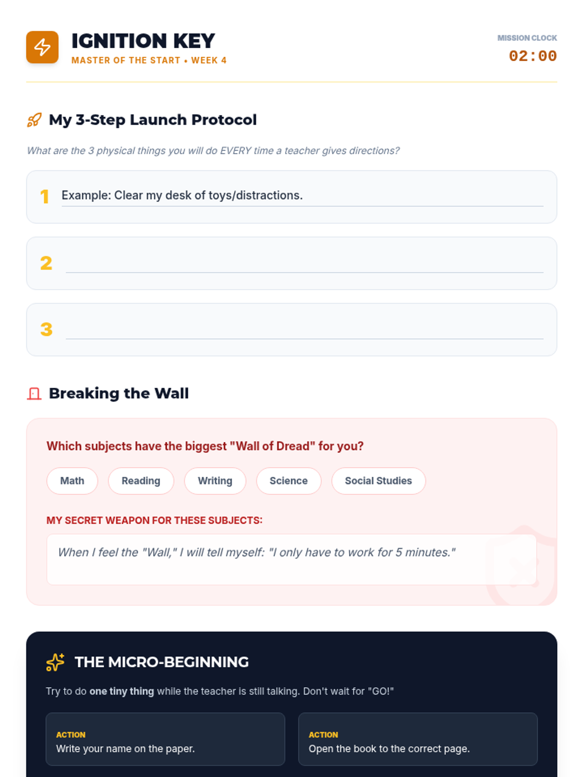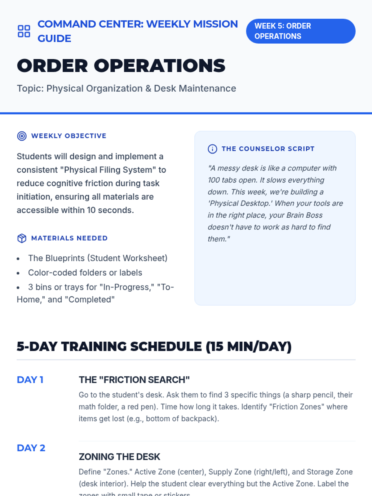 A 9-week executive functioning intervention program designed for 5th-grade students. It focuses on task initiation (the 2-minute rule), checklist usage, working memory through visualization, and self-monitoring strategies to improve academic organization and independence.