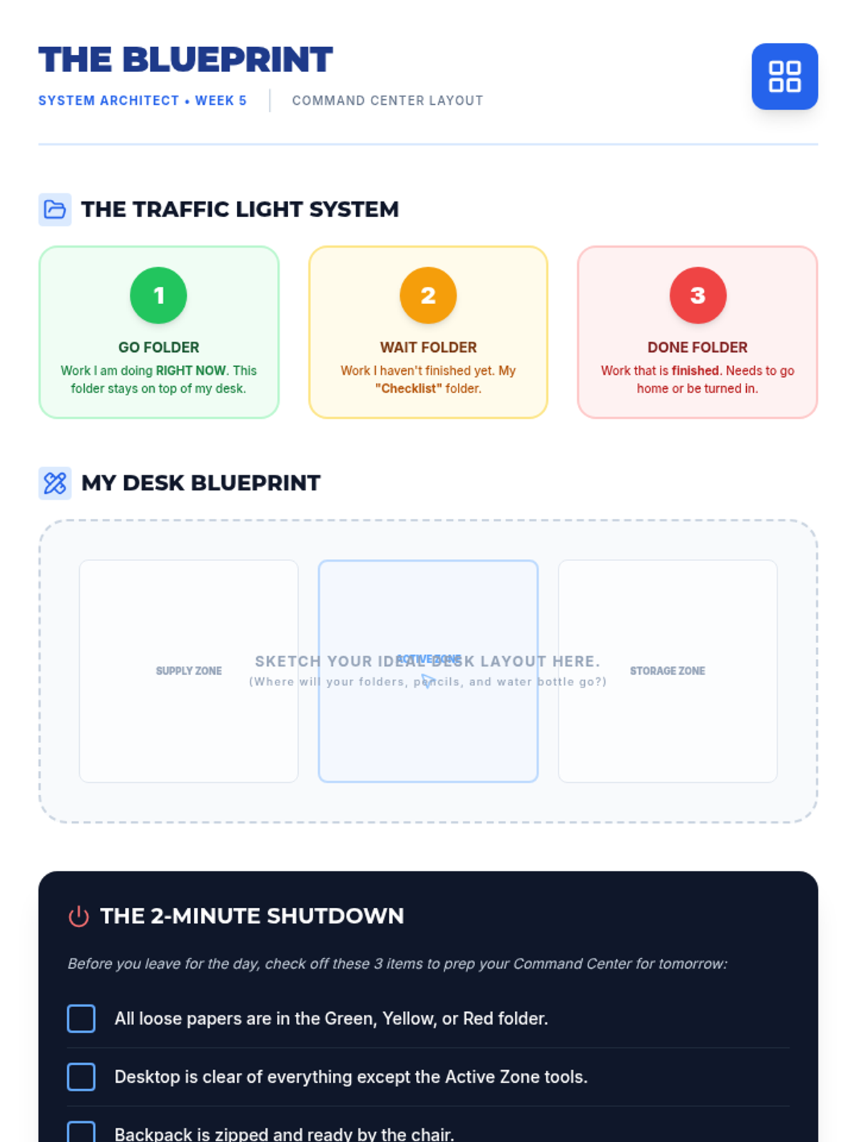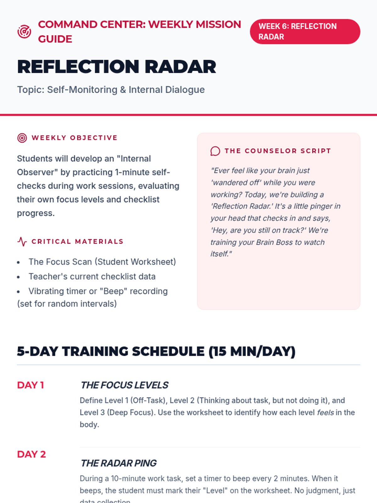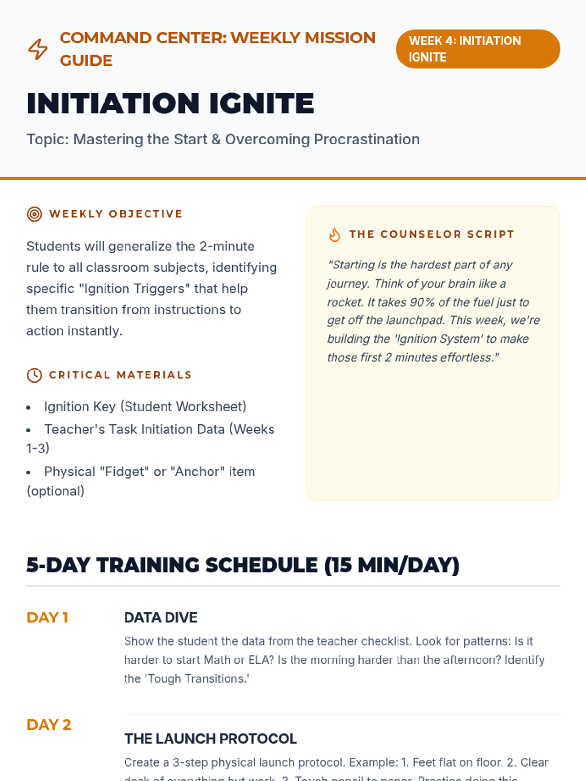 A 9-week executive functioning intervention program designed for 5th-grade students. It focuses on task initiation (the 2-minute rule), checklist usage, working memory through visualization, and self-monitoring strategies to improve academic organization and independence.
