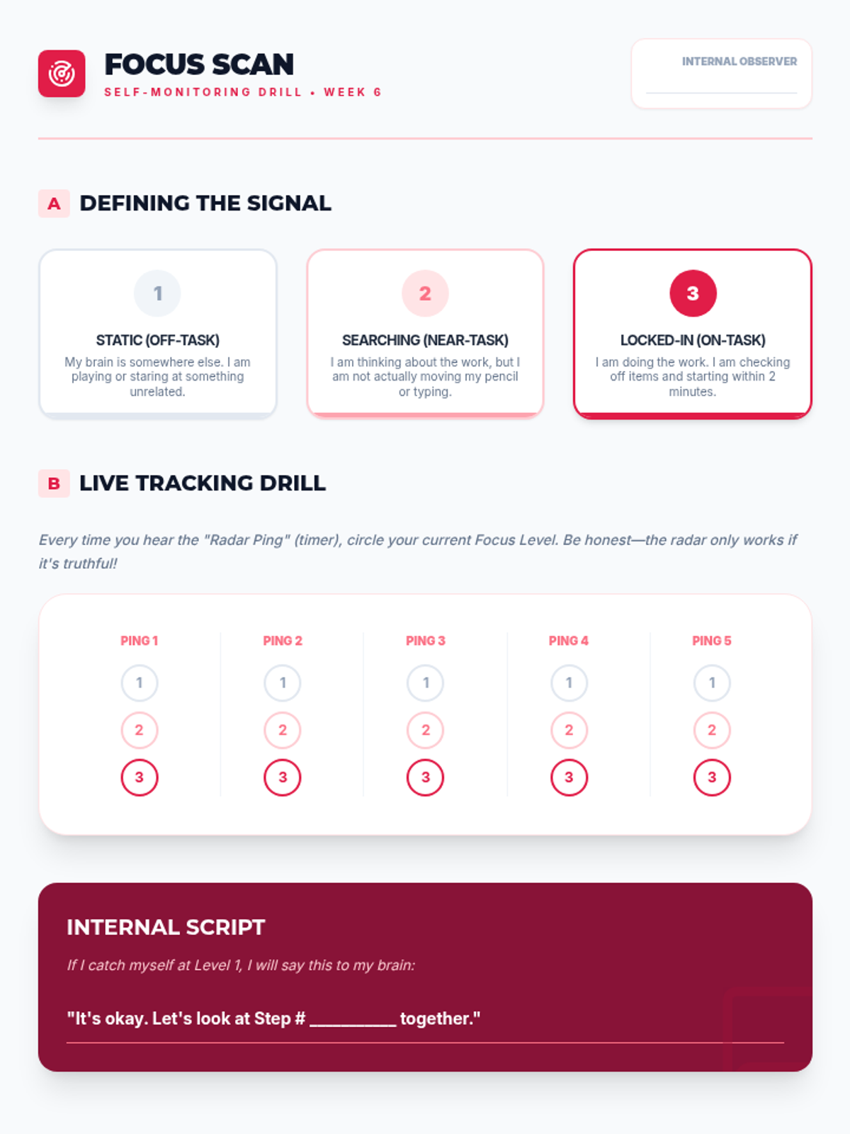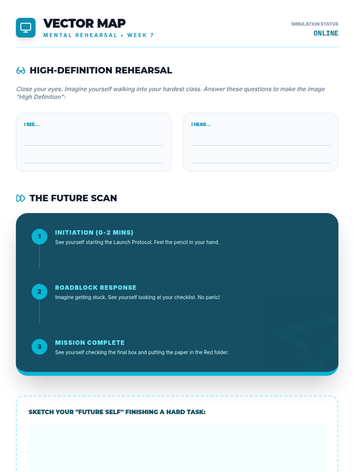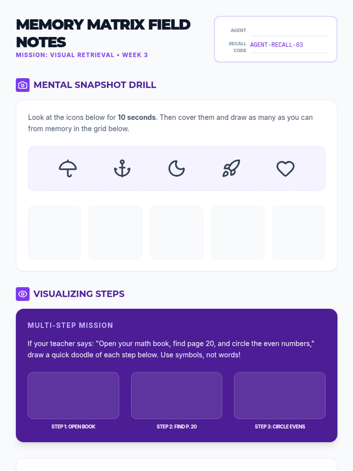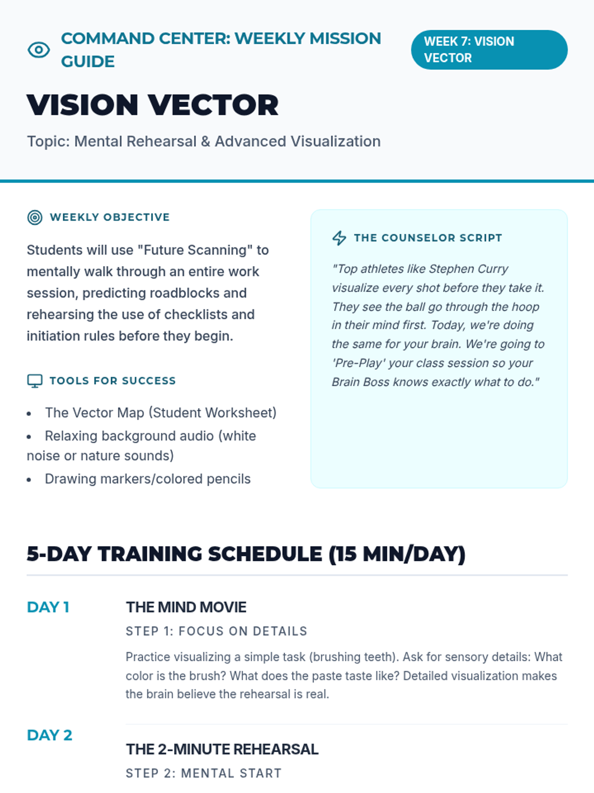 A 9-week executive functioning intervention program designed for 5th-grade students. It focuses on task initiation (the 2-minute rule), checklist usage, working memory through visualization, and self-monitoring strategies to improve academic organization and independence.