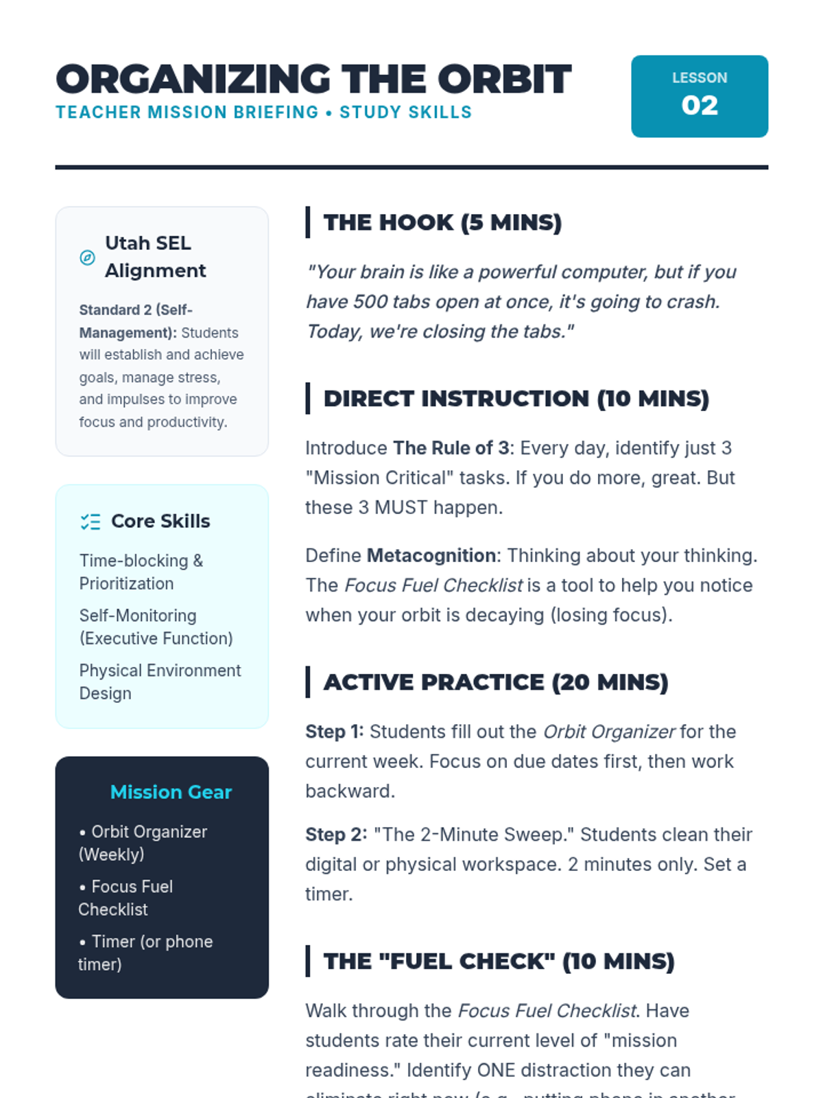 A middle school SEL sequence focused on empowering students with self-advocacy techniques and essential study skills through a 'Mission Control' theme. Aligned to Utah SEL Standards for Self-Management and Relationship Skills.
