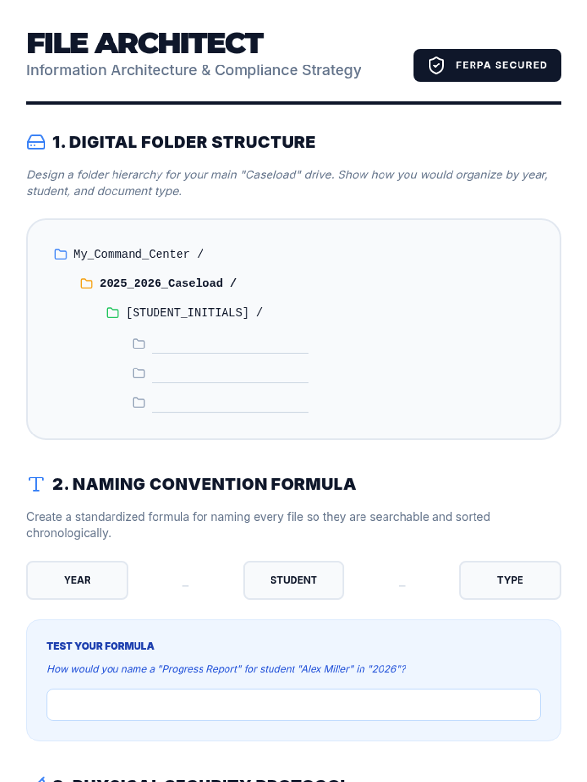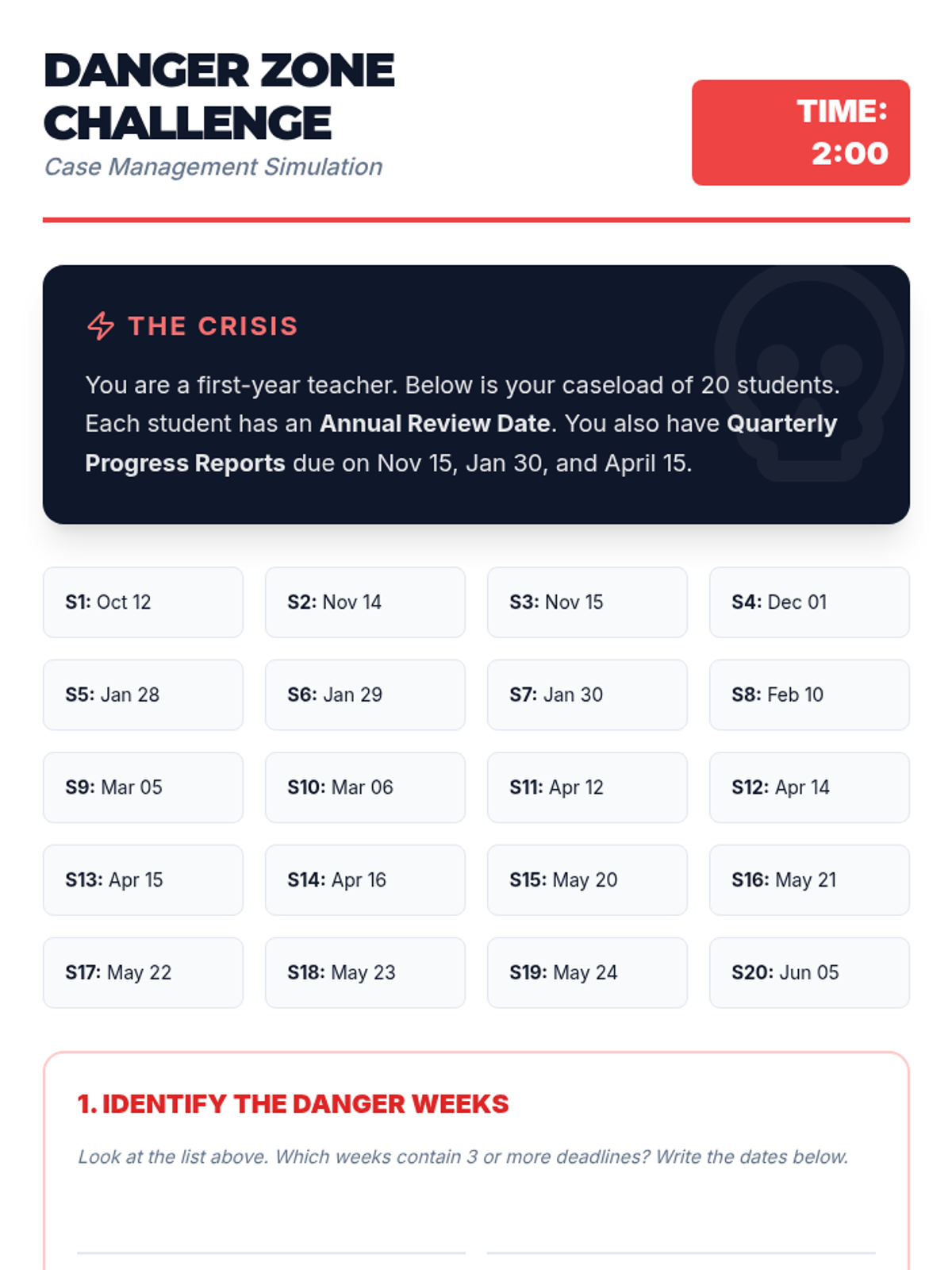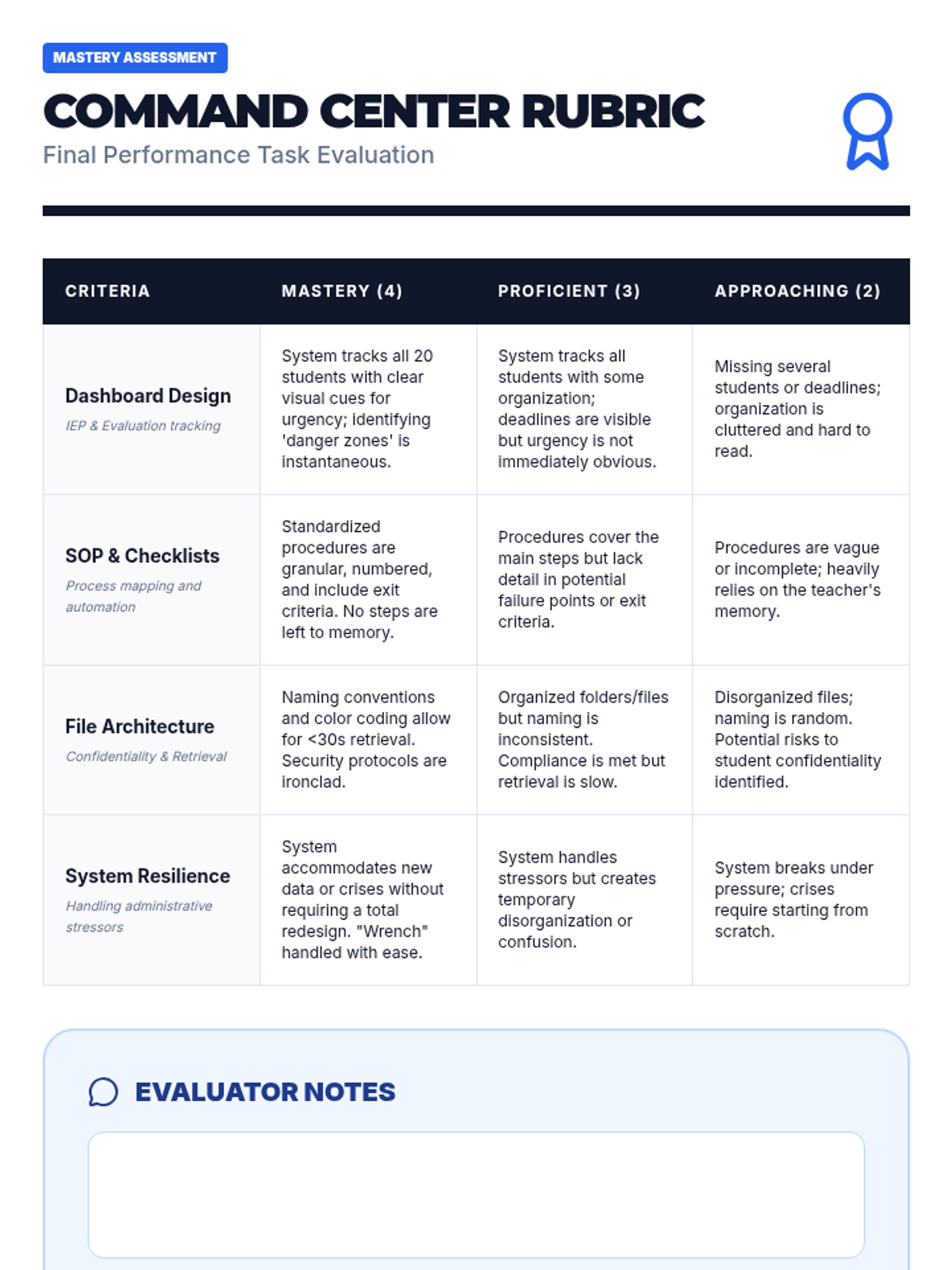 Students design a comprehensive 'Teacher Command Center' for special education case management, focusing on reducing cognitive load through automated systems, checklists, and organized filing.