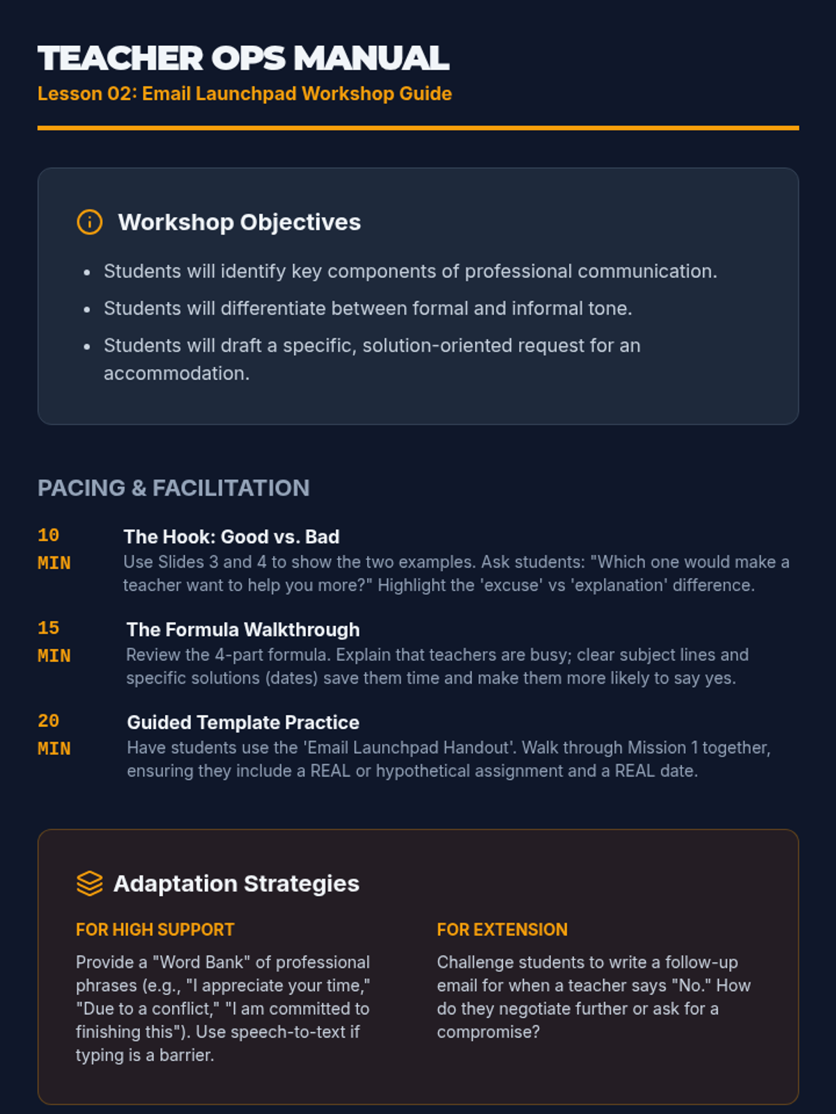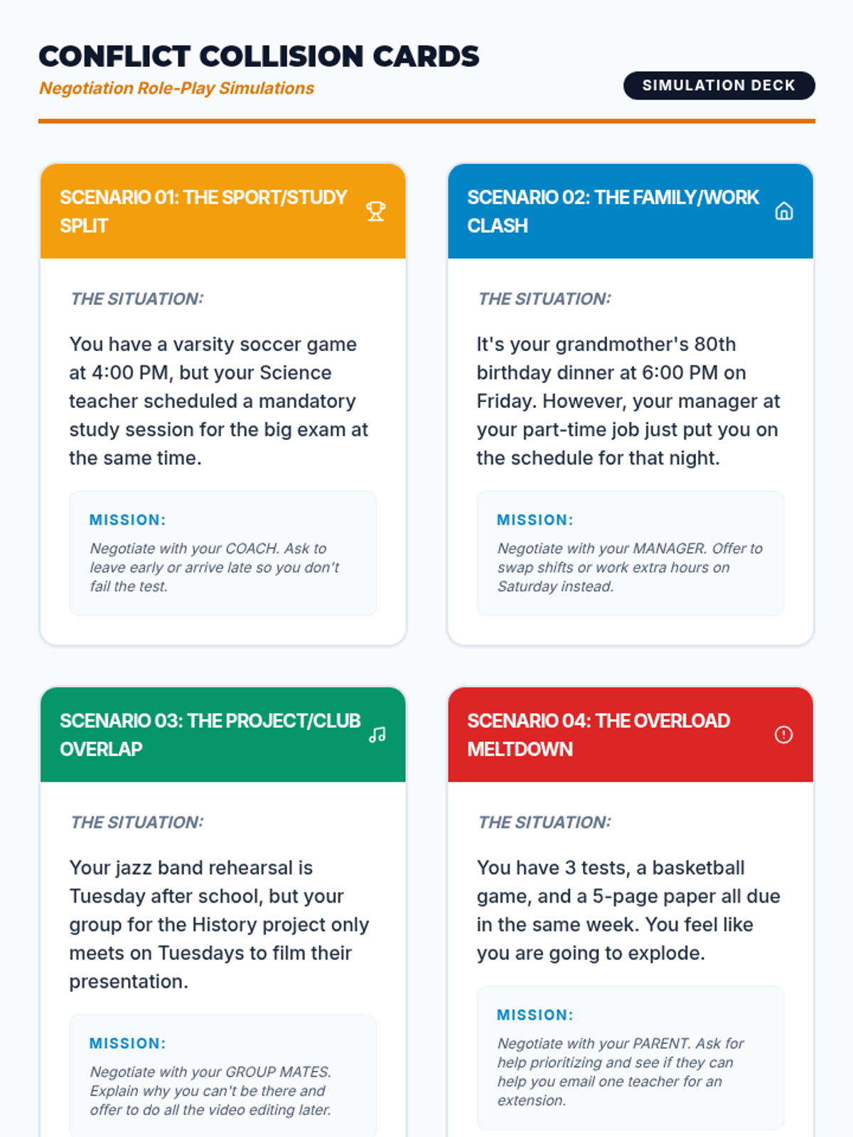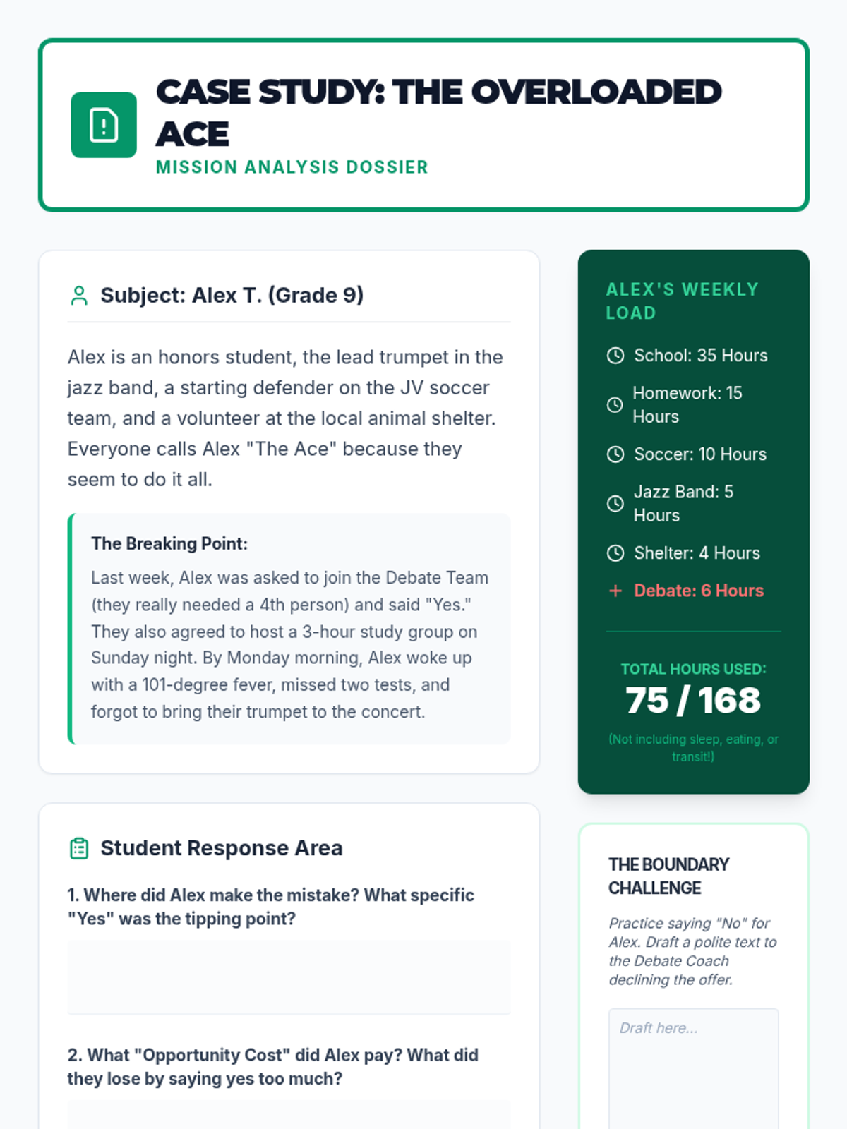 A comprehensive sequence for 9th-grade students focusing on self-advocacy, communication skills, and boundary setting to manage schedule conflicts and prevent burnout. Students learn to recognize stress signals, draft professional requests, negotiate deadlines, and prioritize tasks during crises.