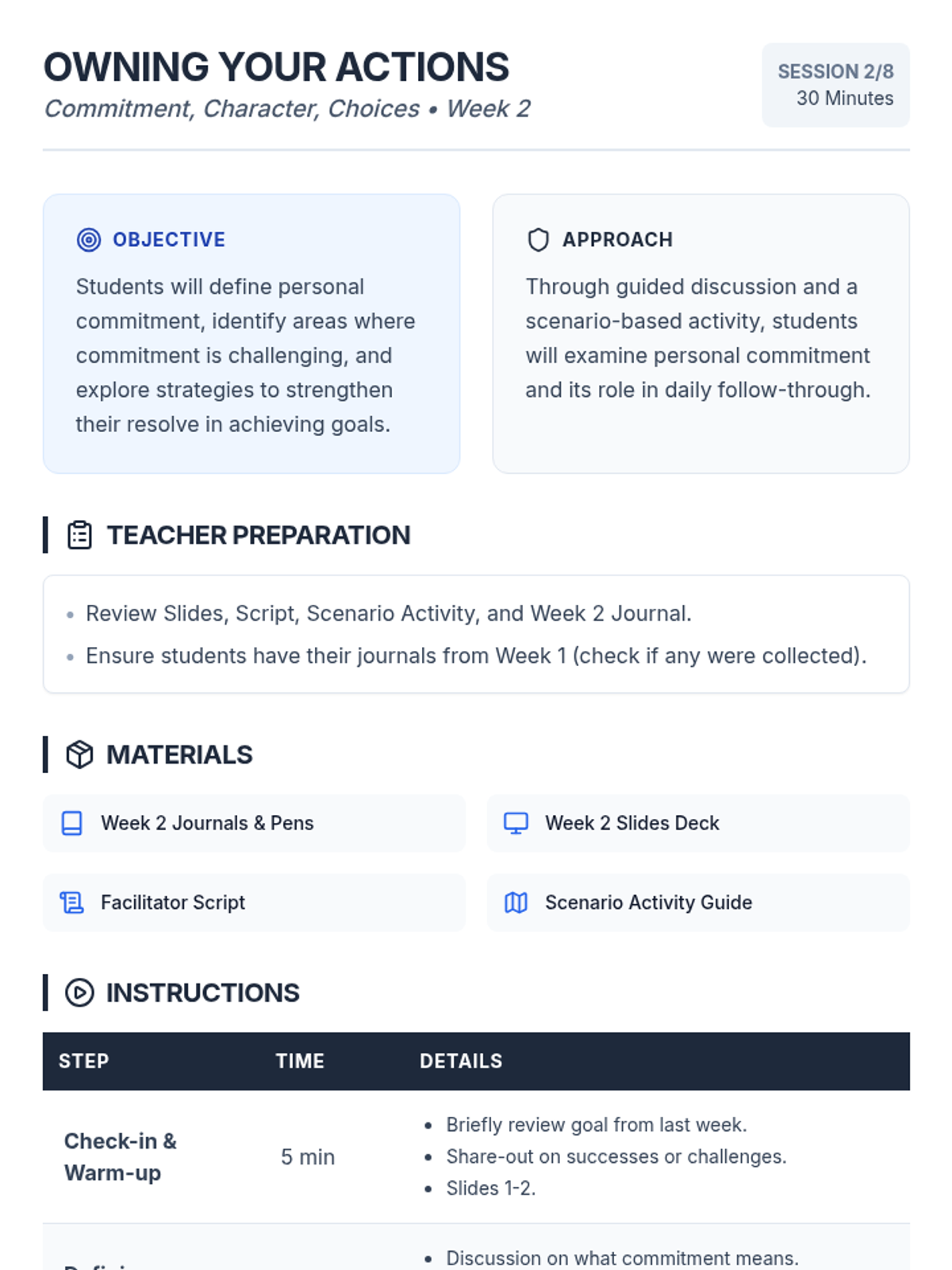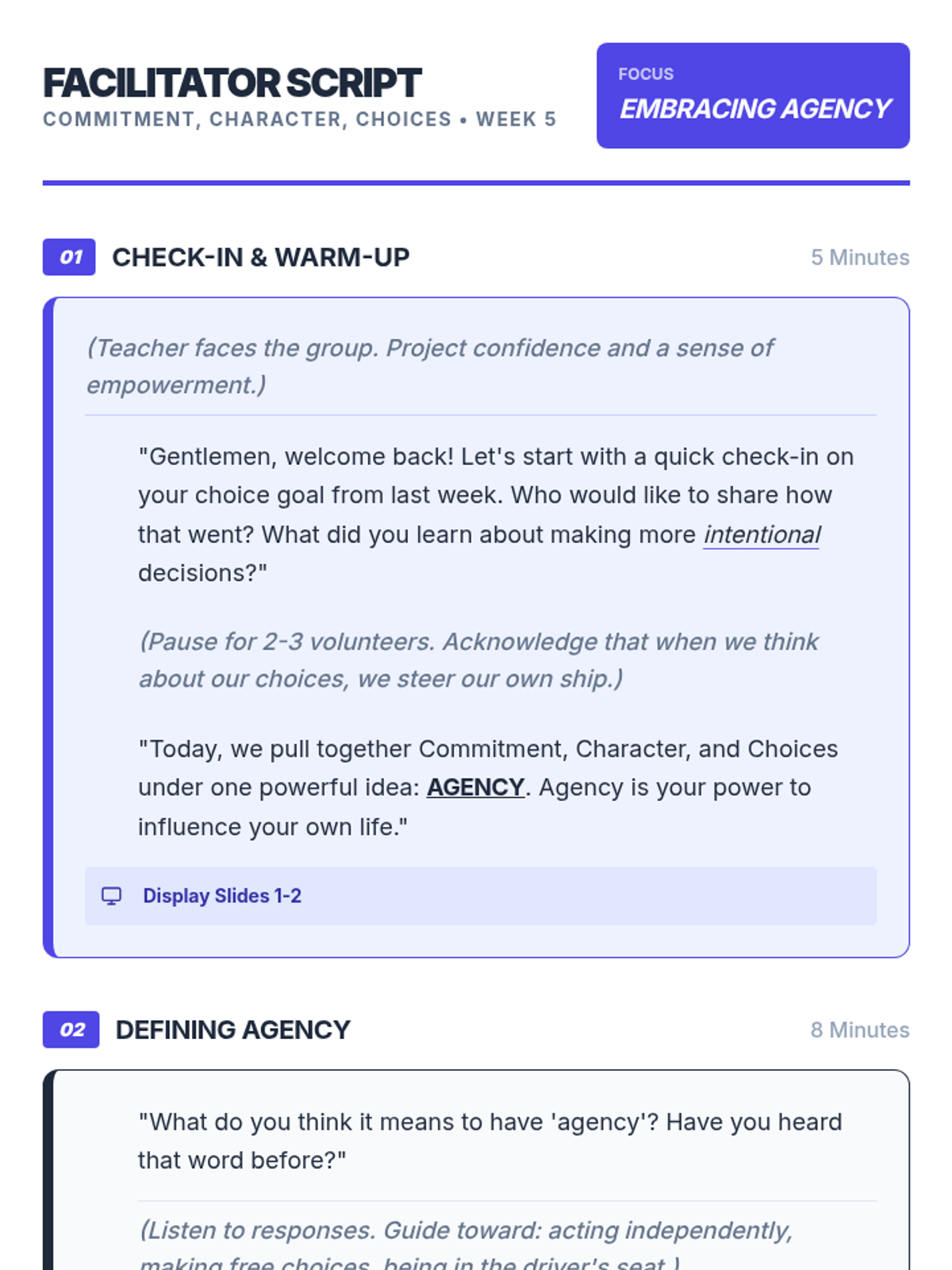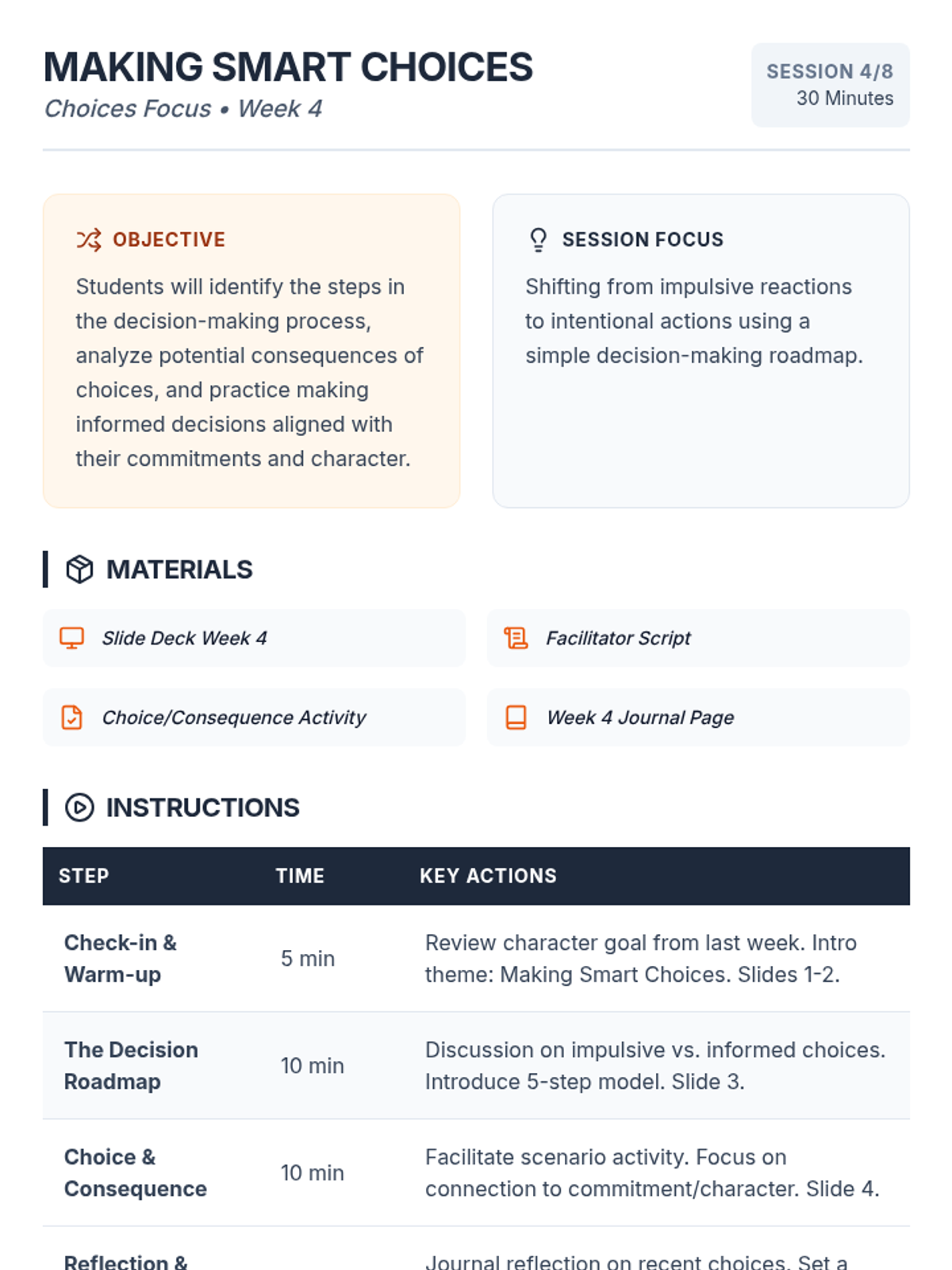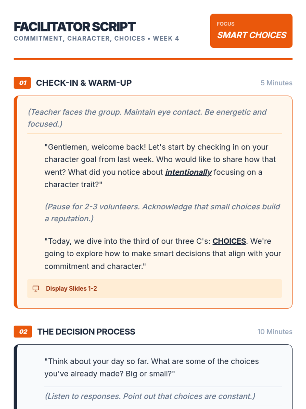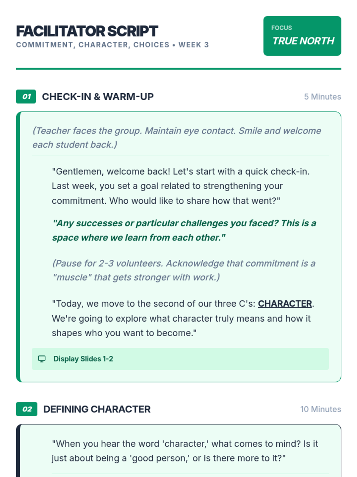 An 8-week intervention program for 9th-grade male students focusing on commitment, character, and choices to improve academic and behavioral outcomes.