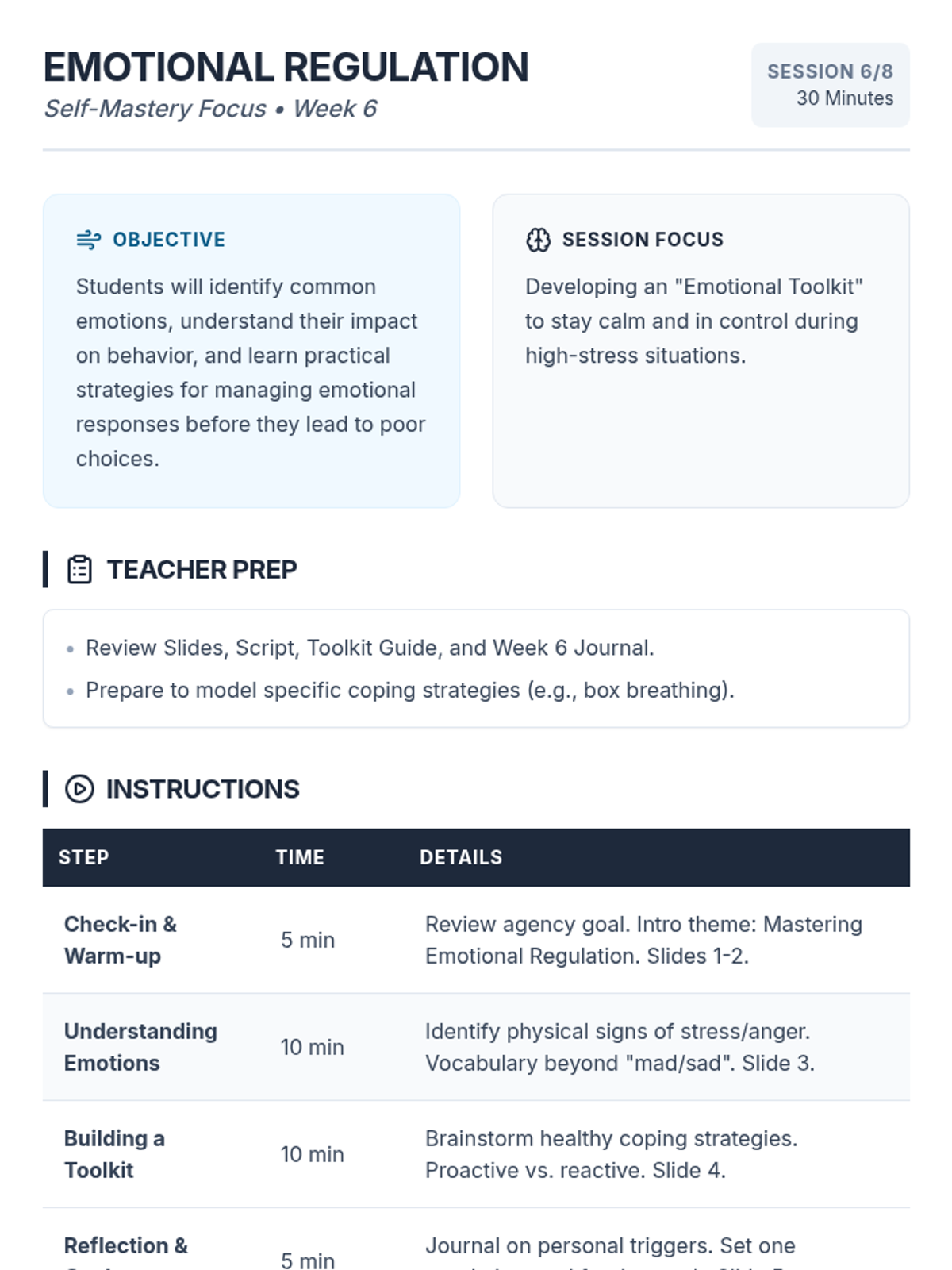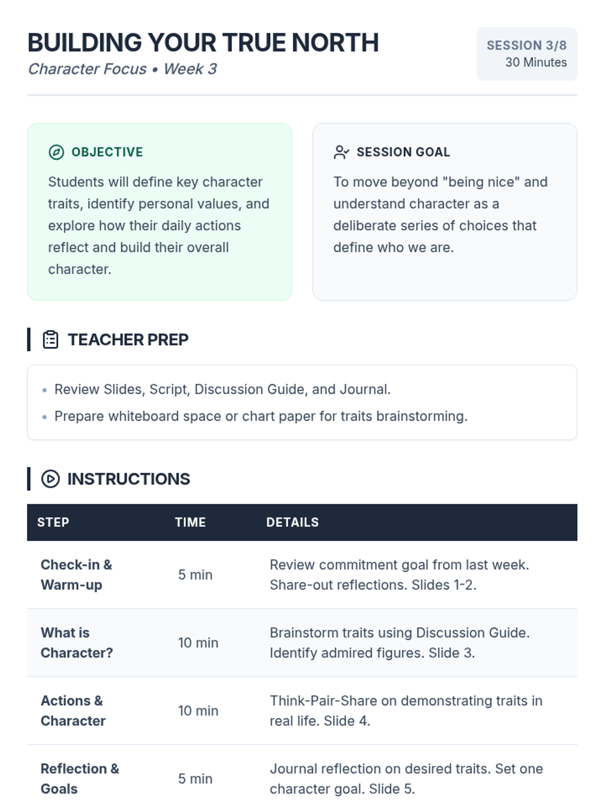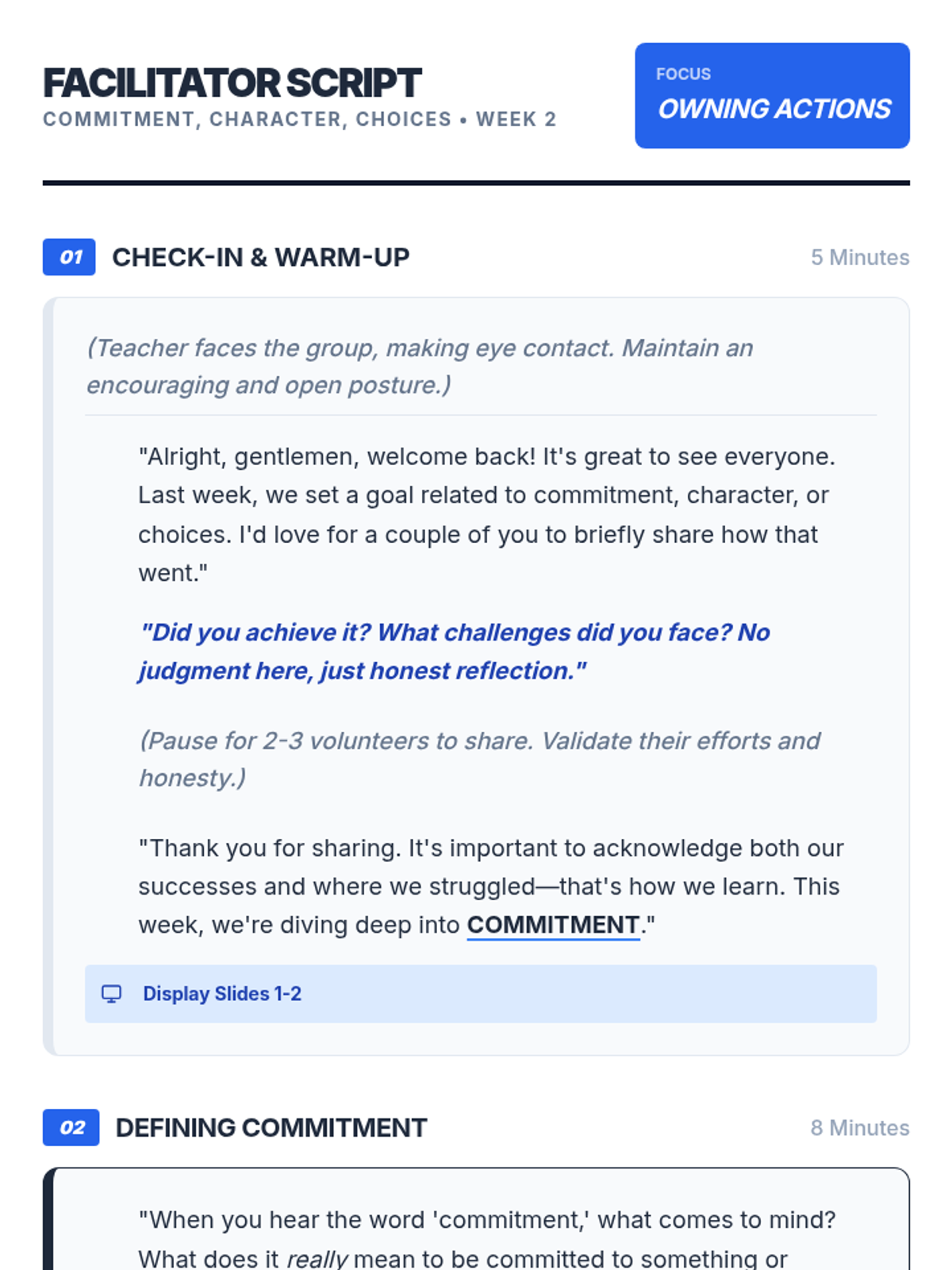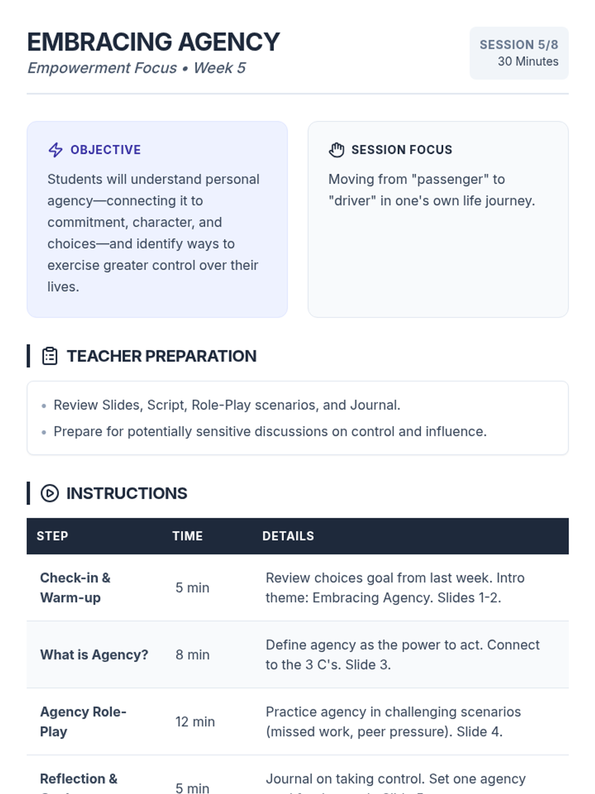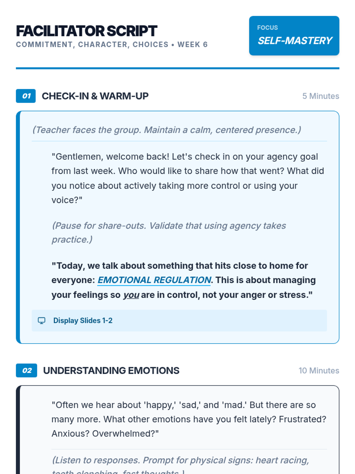 An 8-week intervention program for 9th-grade male students focusing on commitment, character, and choices to improve academic and behavioral outcomes.