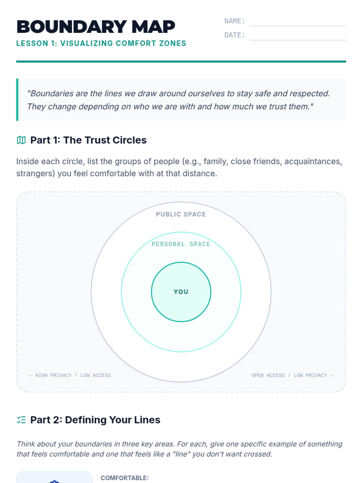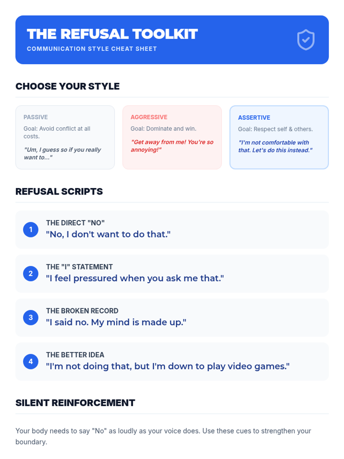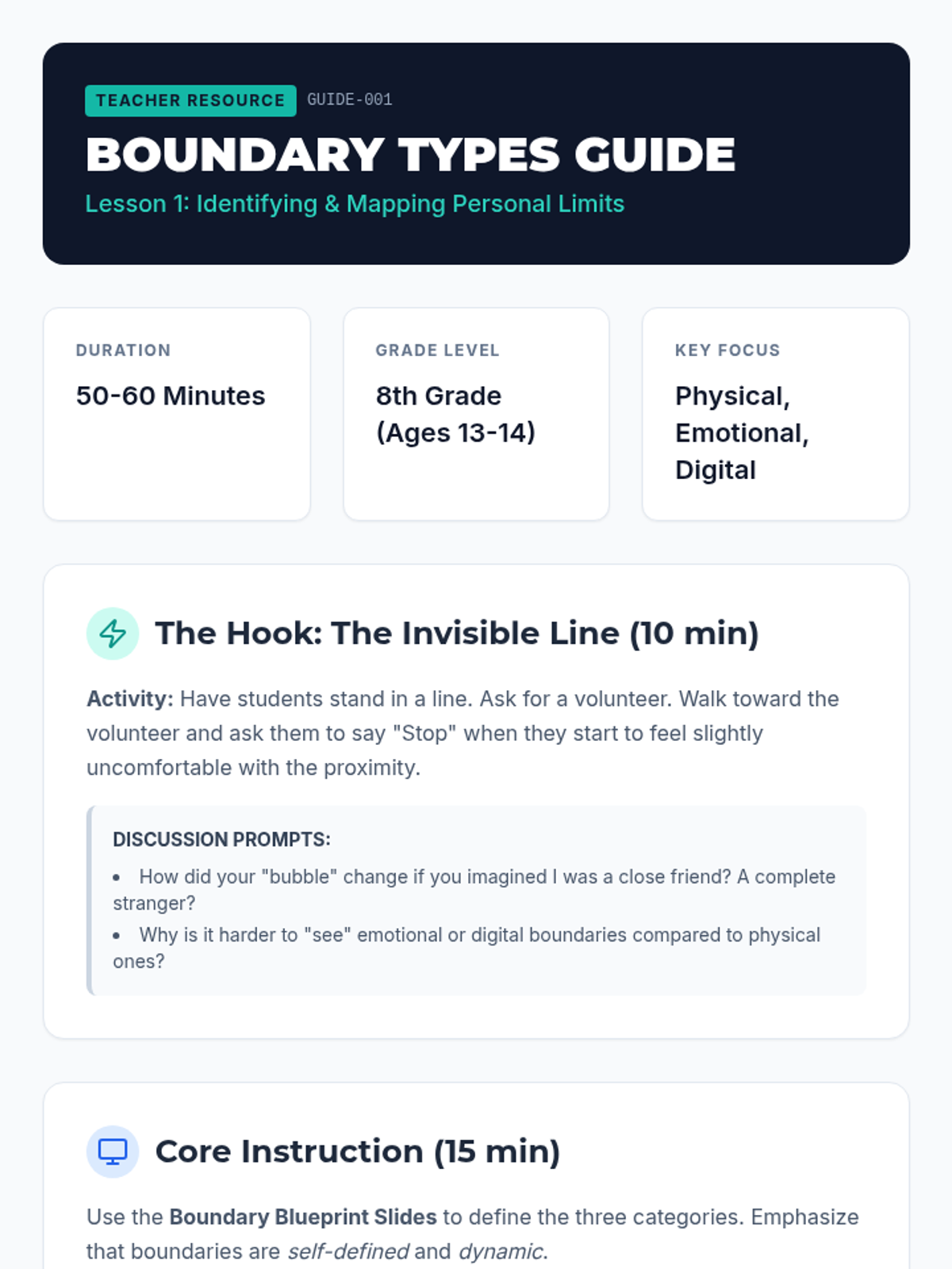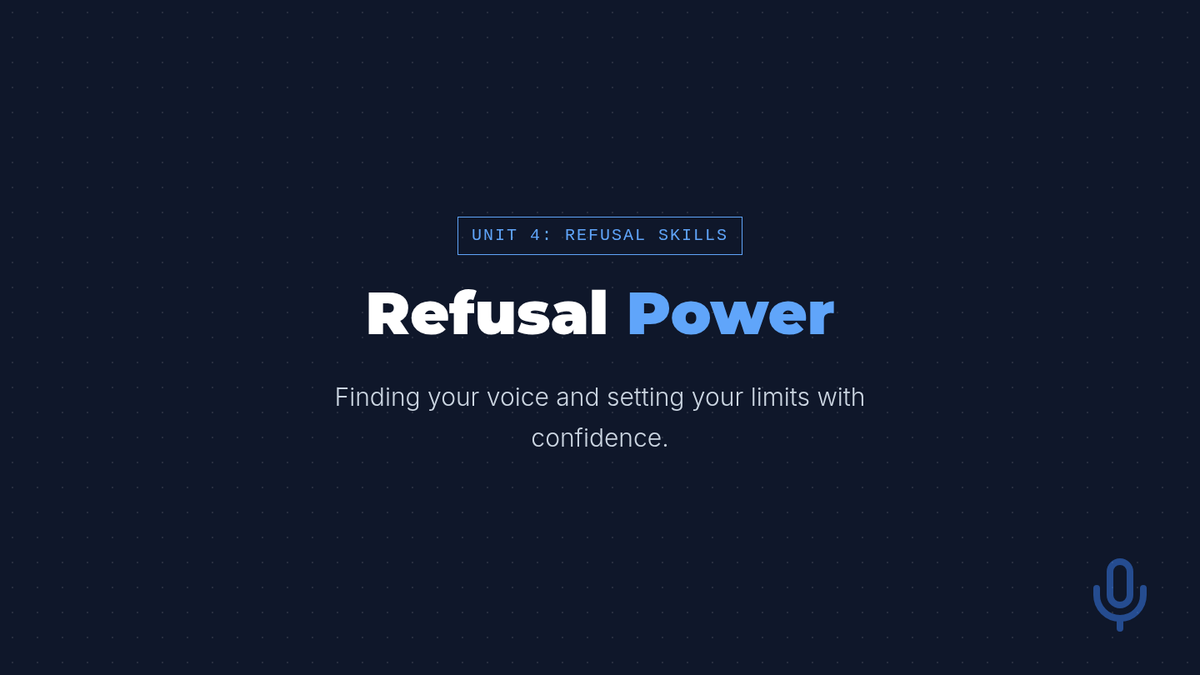 A comprehensive sequence for 8th-grade students exploring the nuances of personal boundaries, affirmative consent, non-verbal communication, and assertive refusal skills across physical, emotional, and digital contexts.
