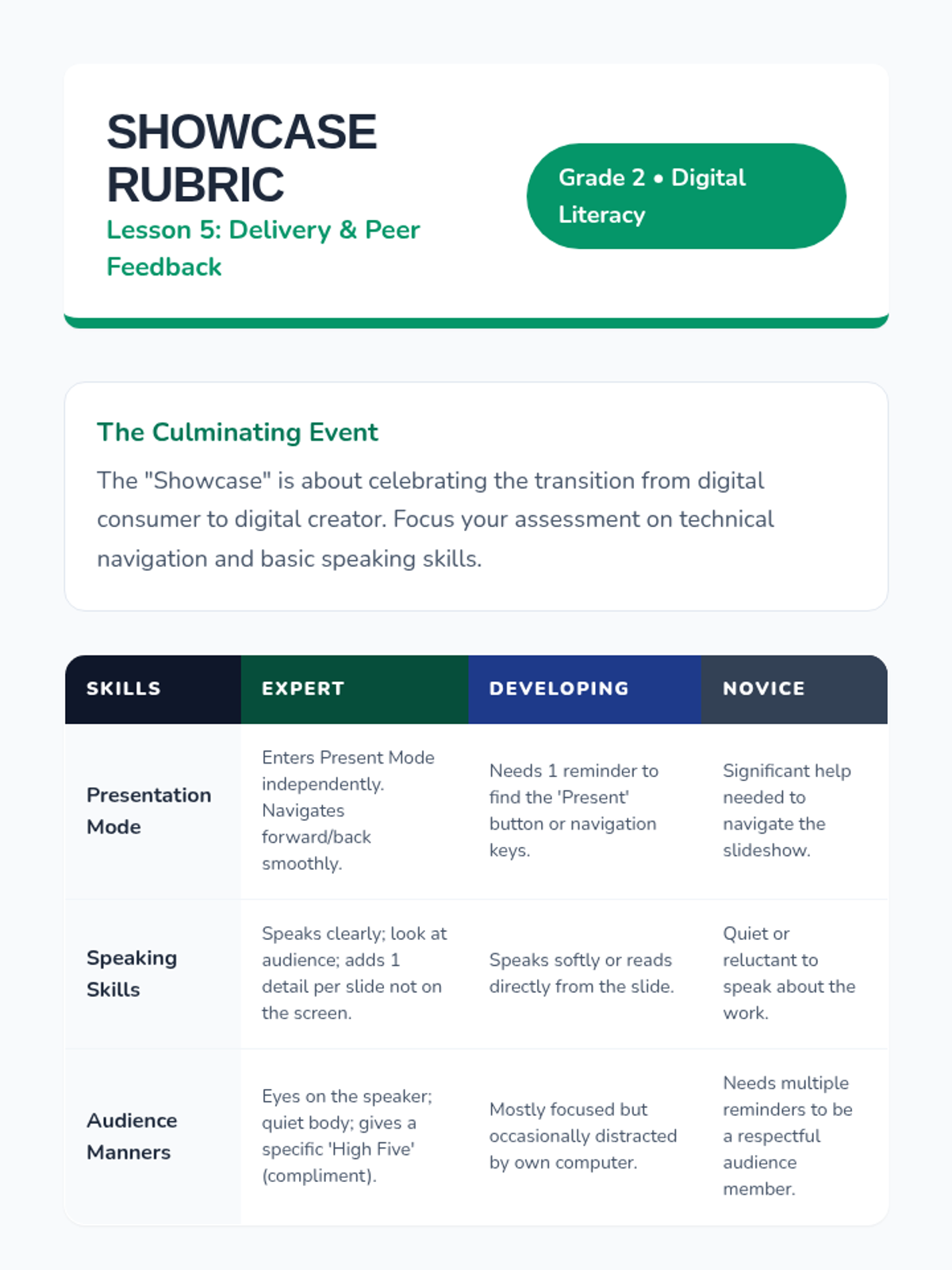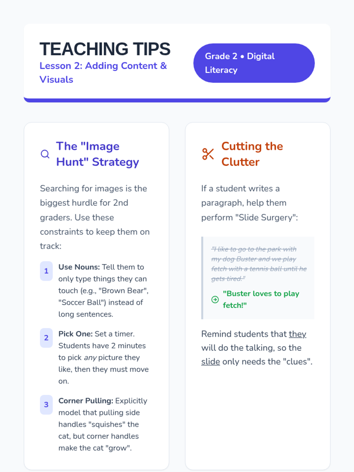 A project-based sequence for 2nd graders to learn the basics of presentation software, focusing on slide design, visual balance, and digital storytelling through the creation of an 'All About Me' or animal presentation.