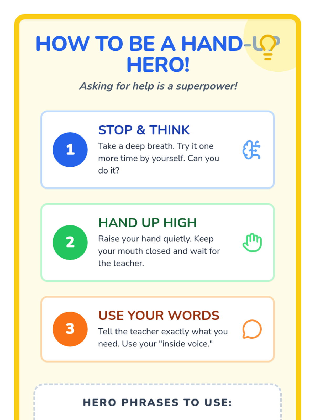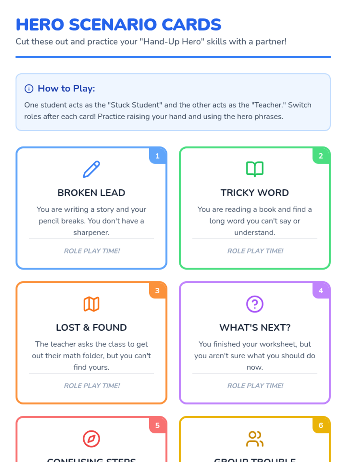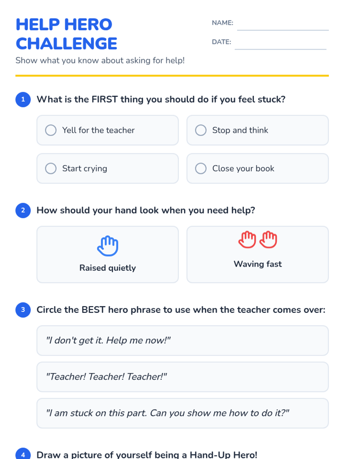 A comprehensive sequence designed to teach elementary students how to effectively and appropriately ask their teachers for help. It differentiates between younger and older elementary students, focusing on basic hand-raising and simple requests for 1st-2nd graders, and more specific, strategy-based communication for 3rd-4th graders.