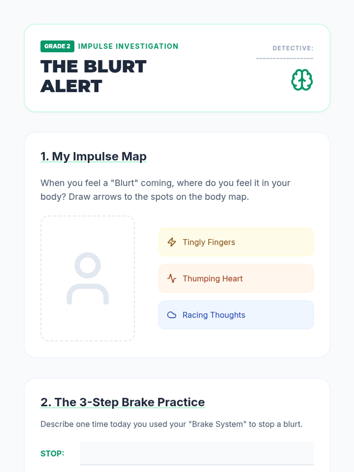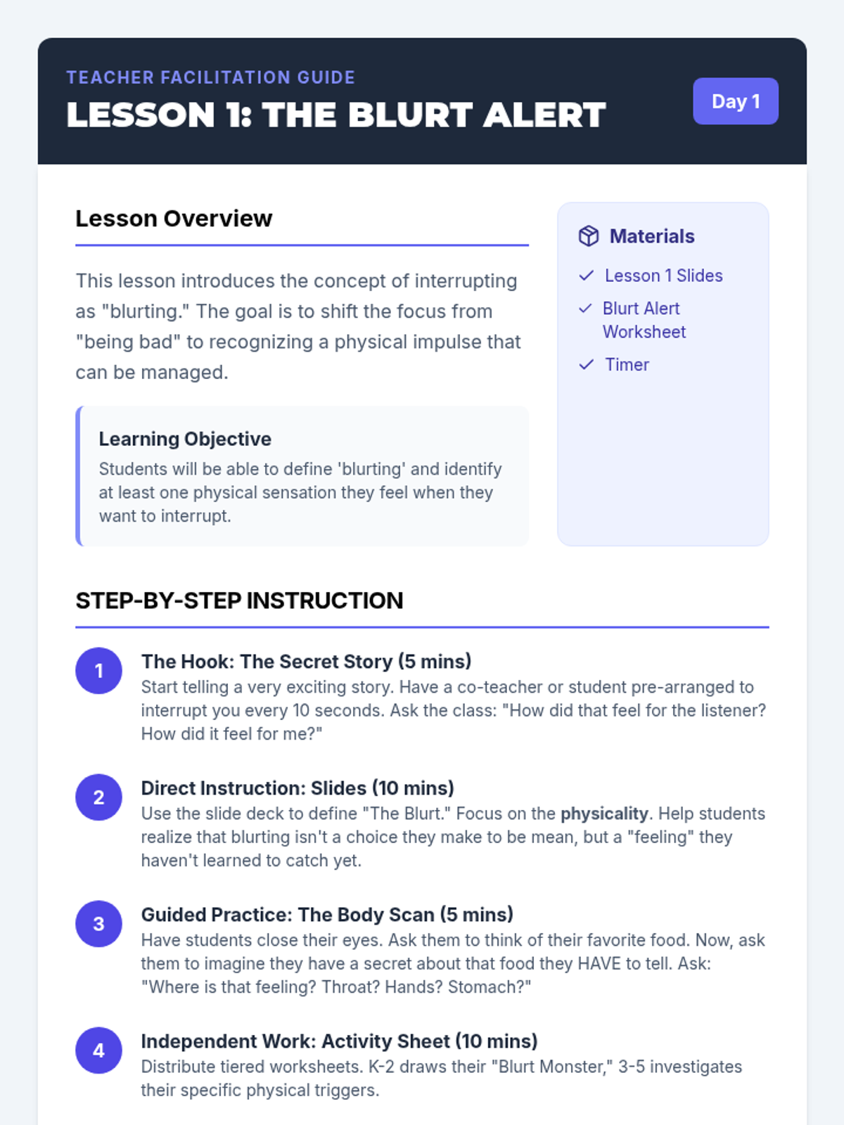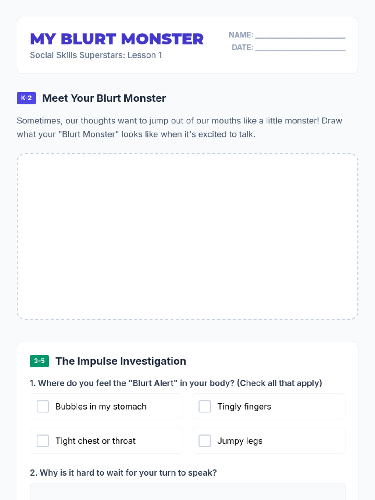 A comprehensive sequence designed to teach elementary students how to effectively and appropriately ask their teachers for help. It differentiates between younger and older elementary students, focusing on basic hand-raising and simple requests for 1st-2nd graders, and more specific, strategy-based communication for 3rd-4th graders.