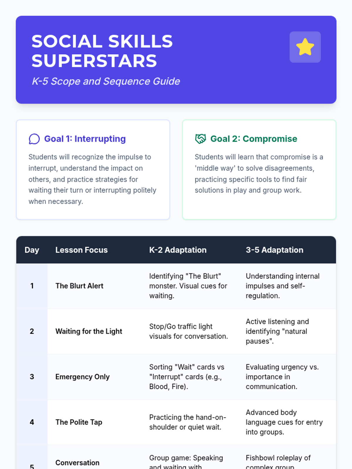 A comprehensive 10-day unit designed for K-5 students to master conversation etiquette, specifically focusing on reducing interruptions and learning the art of compromise. The unit uses a 'Superstar' theme to engage students in prosocial behaviors.