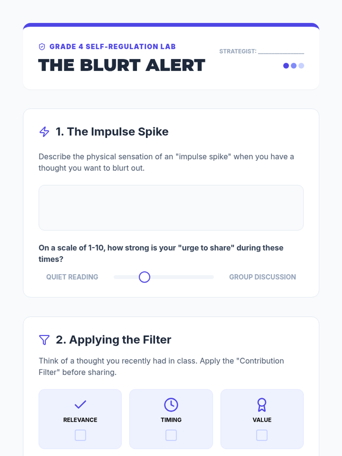 A comprehensive 8-session Tier 2 small group curriculum designed to help students develop social awareness ('Reading the Room') and master positive attention-seeking strategies through role-play, reflection, and direct instruction.
