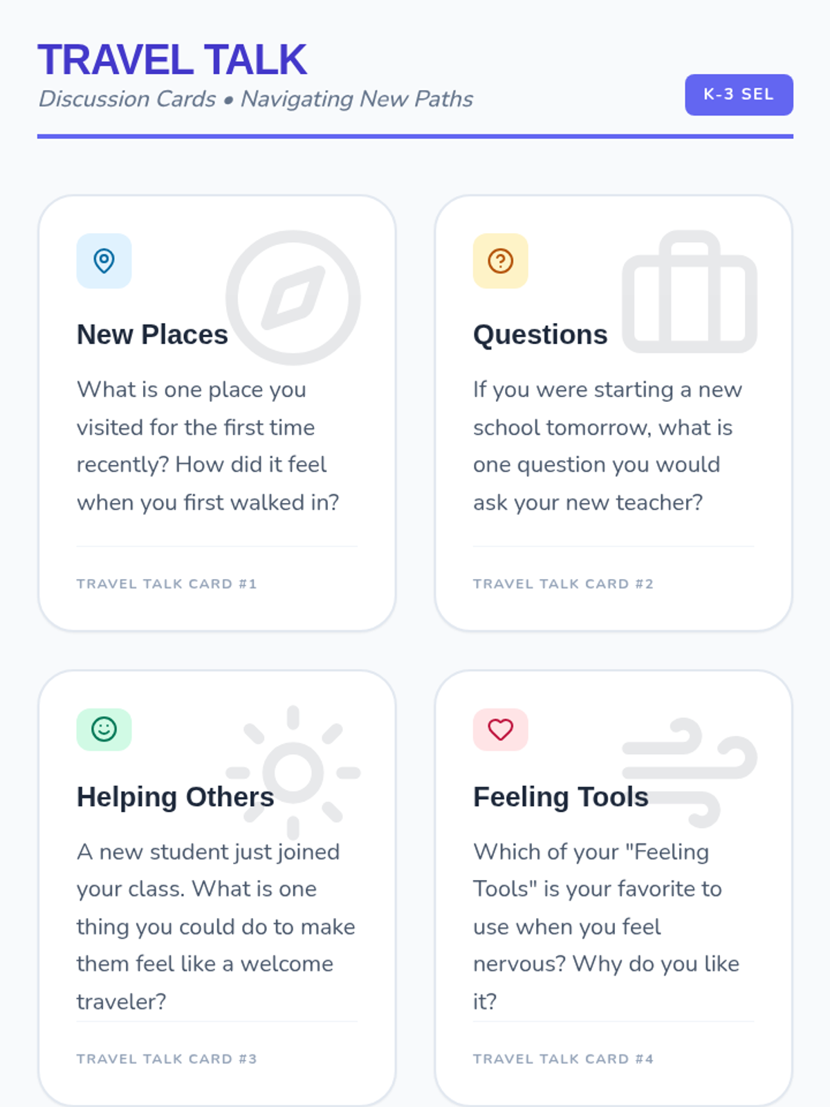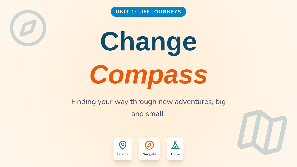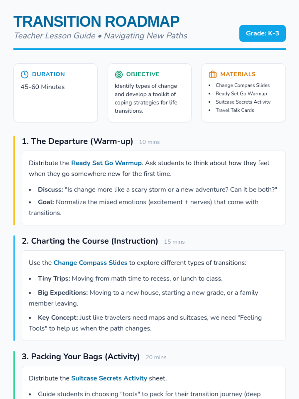 A social-emotional learning module designed for K-3 students to develop resilience and adaptability during life transitions. Through the metaphor of travel, students learn to identify feelings, prepare for change, and build coping strategies.