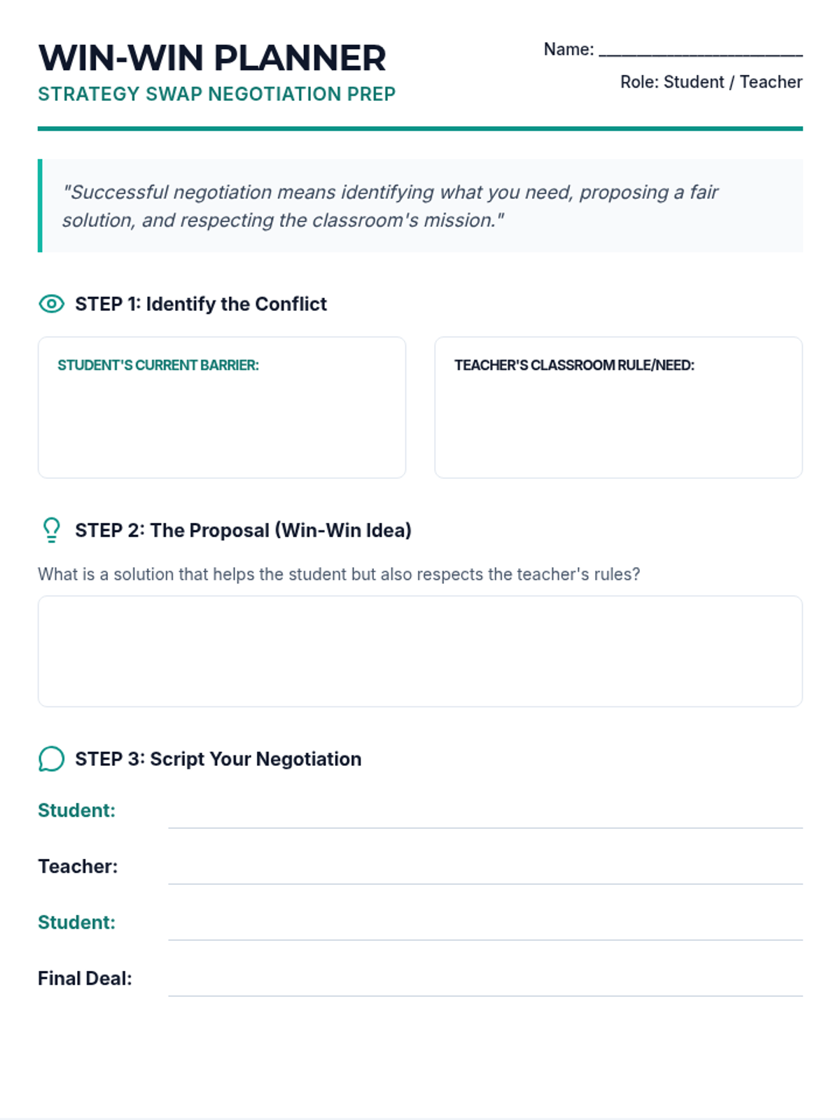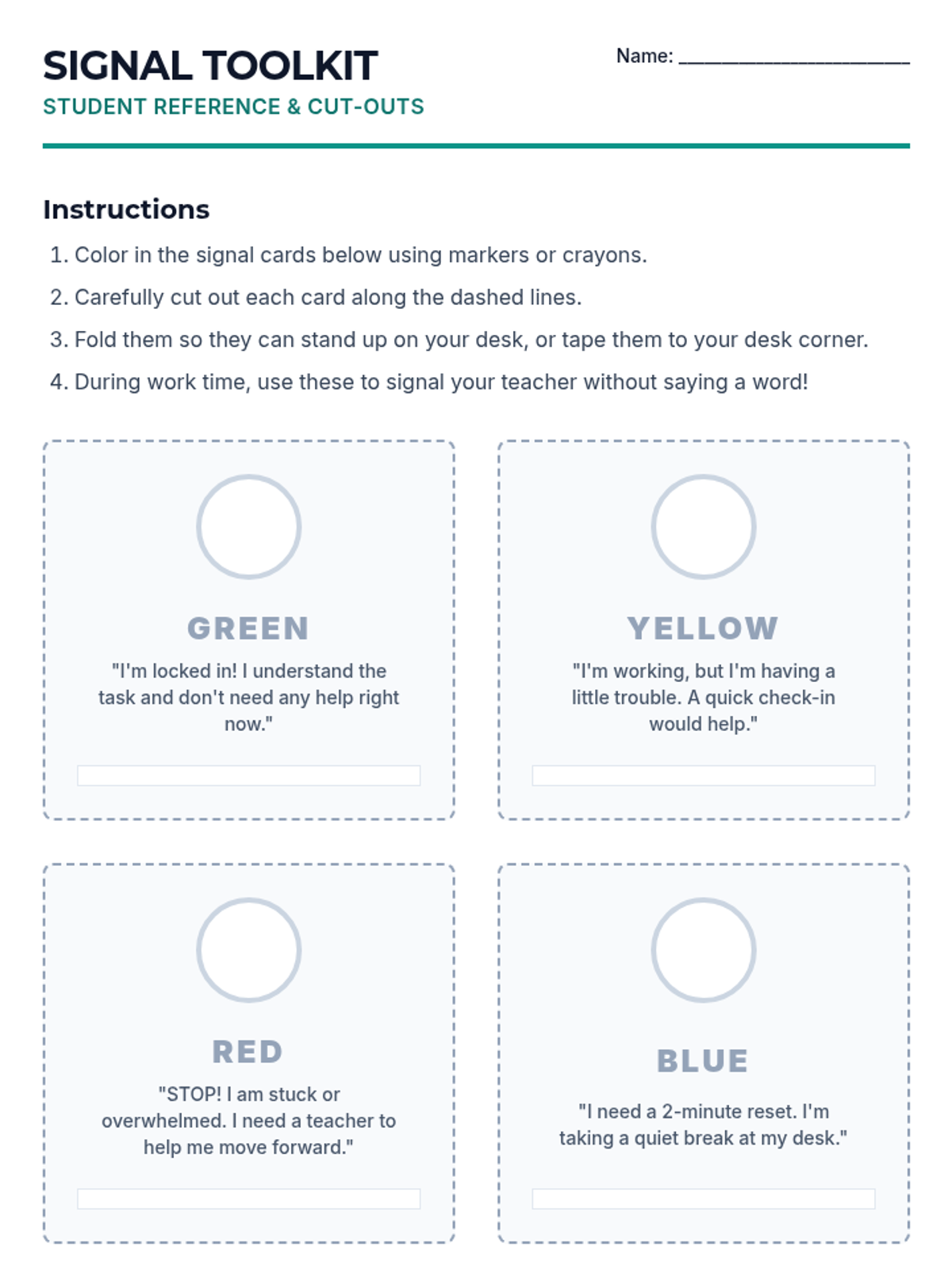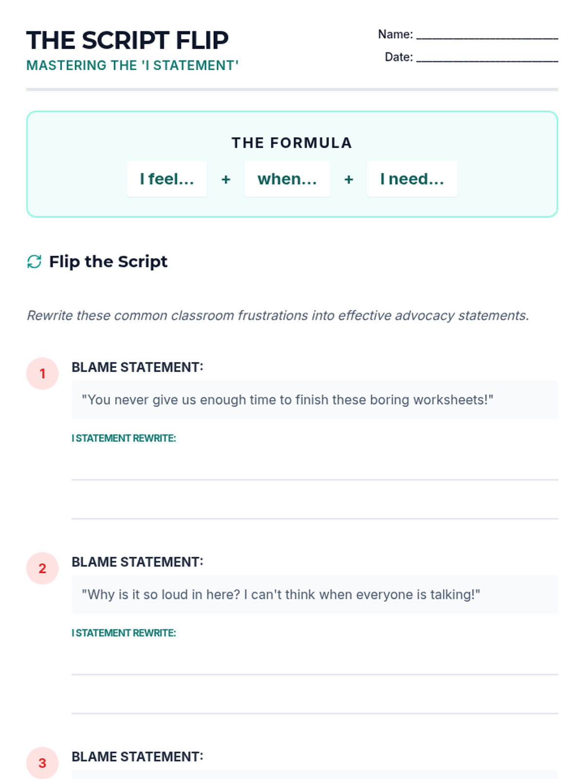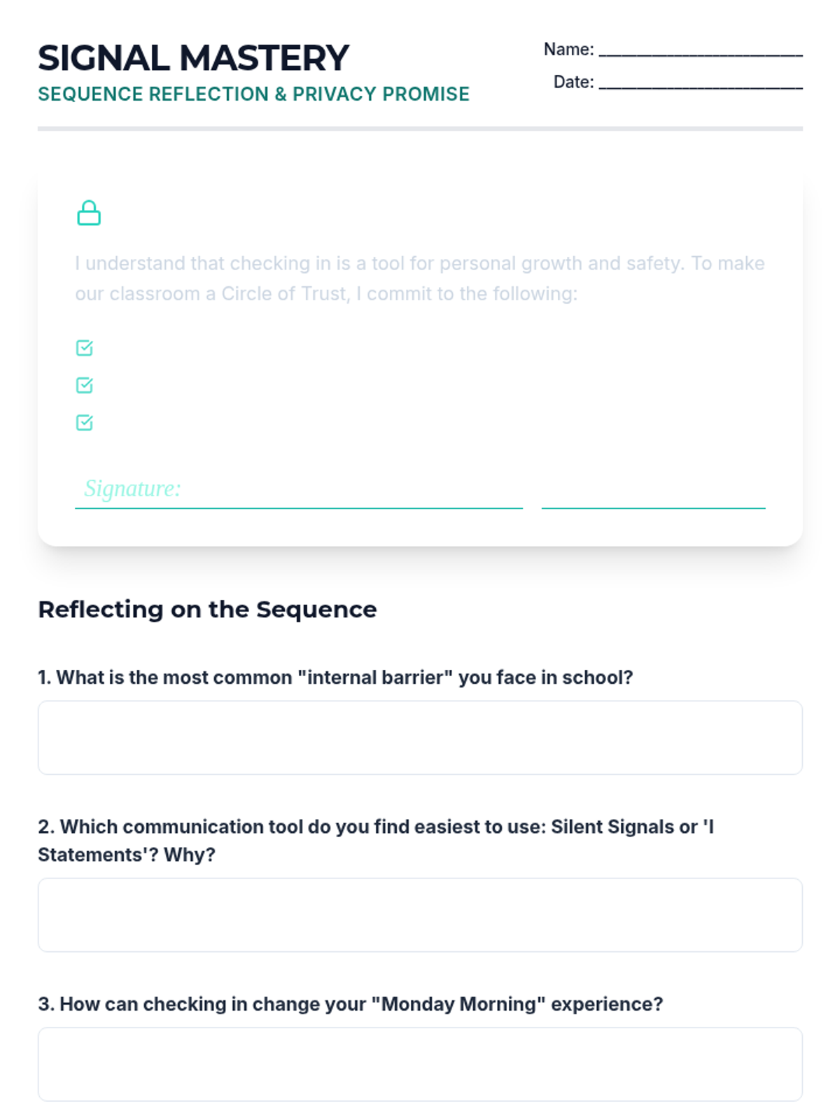A 5-lesson sequence for 7th graders focusing on self-advocacy and effective communication during daily check-ins. Students learn to identify learning barriers, use non-verbal signals, master 'I statements', negotiate support, and respect peer privacy.