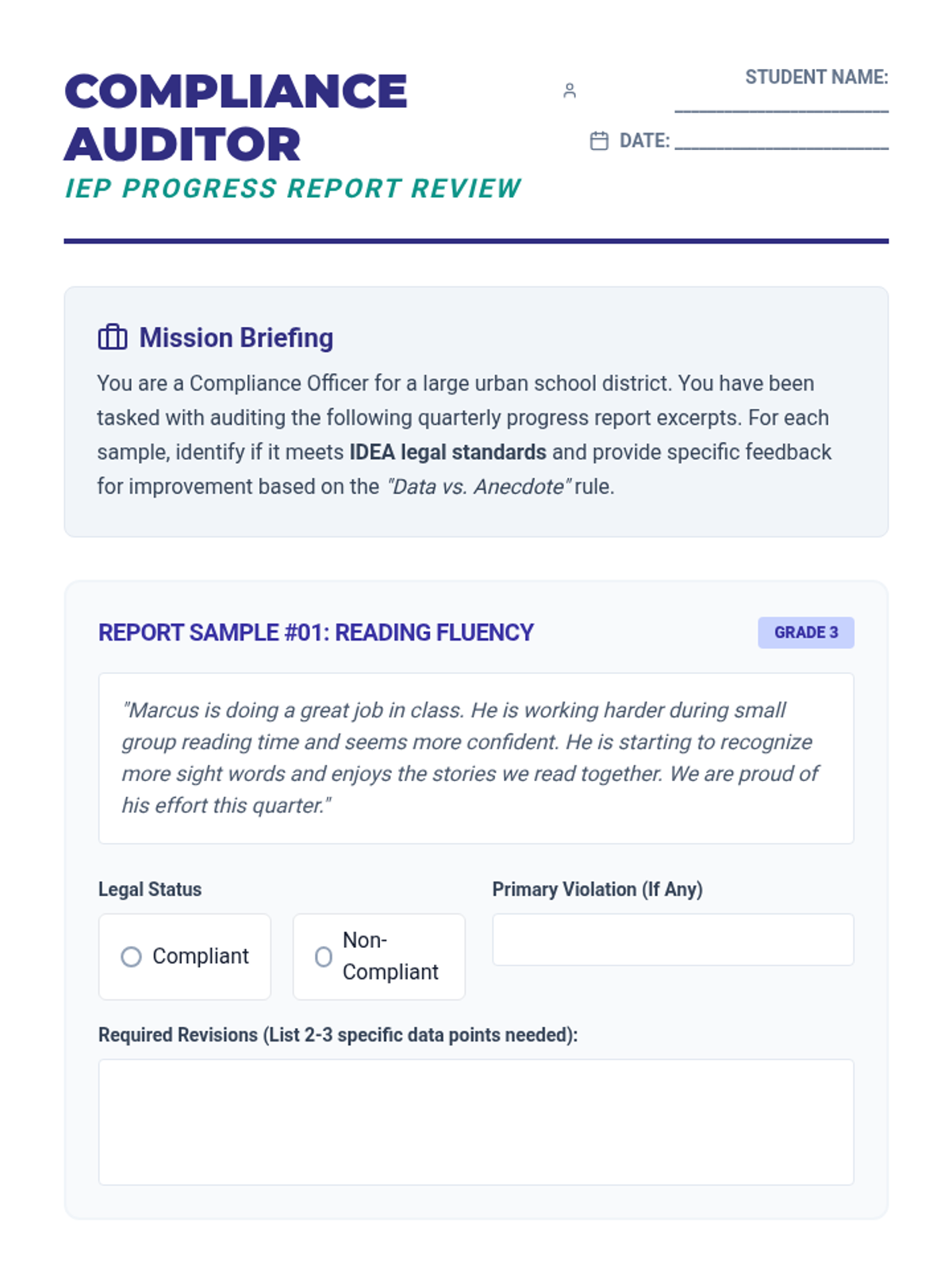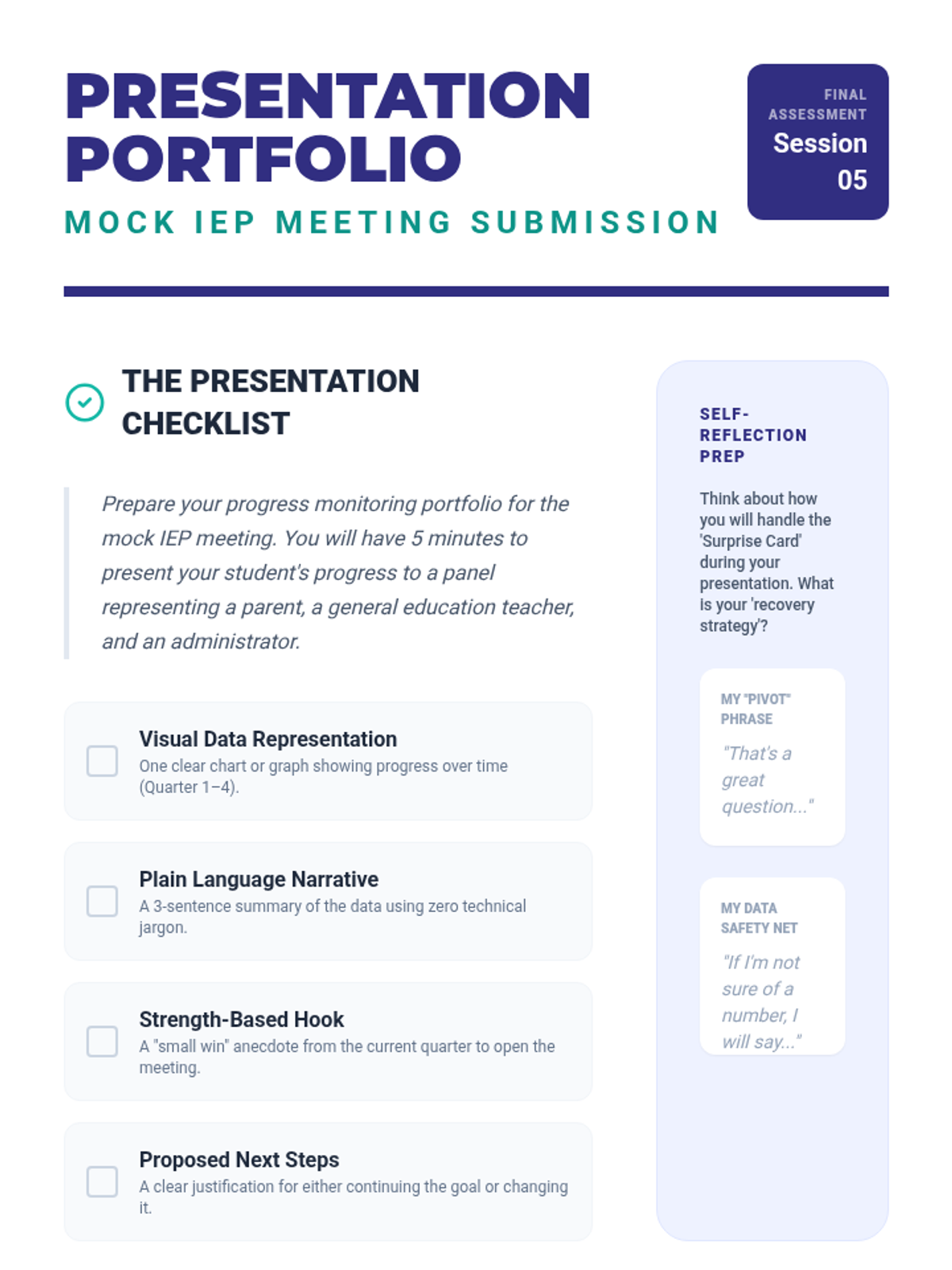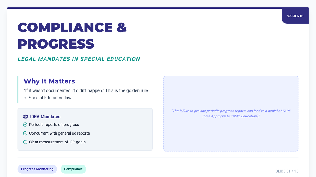 This sequence prepares pre-service special educators to navigate the legal and interpersonal complexities of reporting IEP progress. It covers IDEA compliance, parent-friendly communication, PLAAFP development, general education collaboration, and mock IEP meeting presentations.