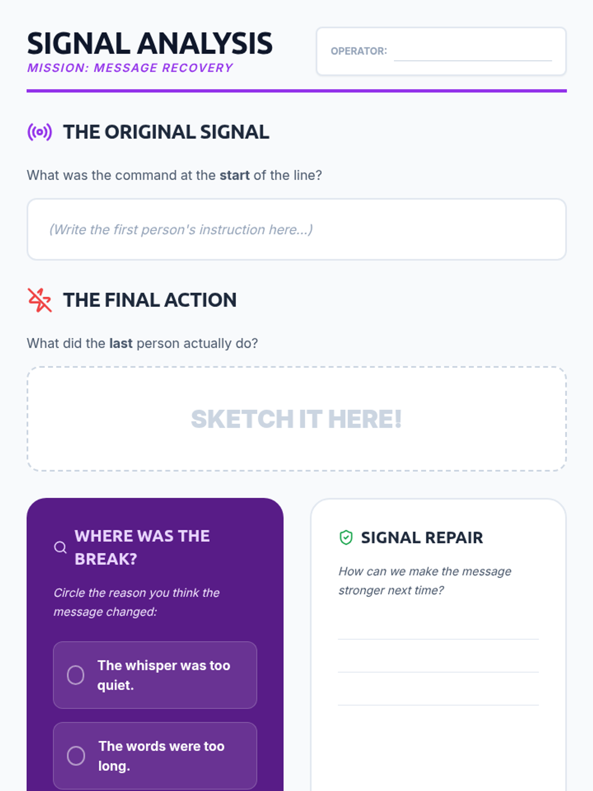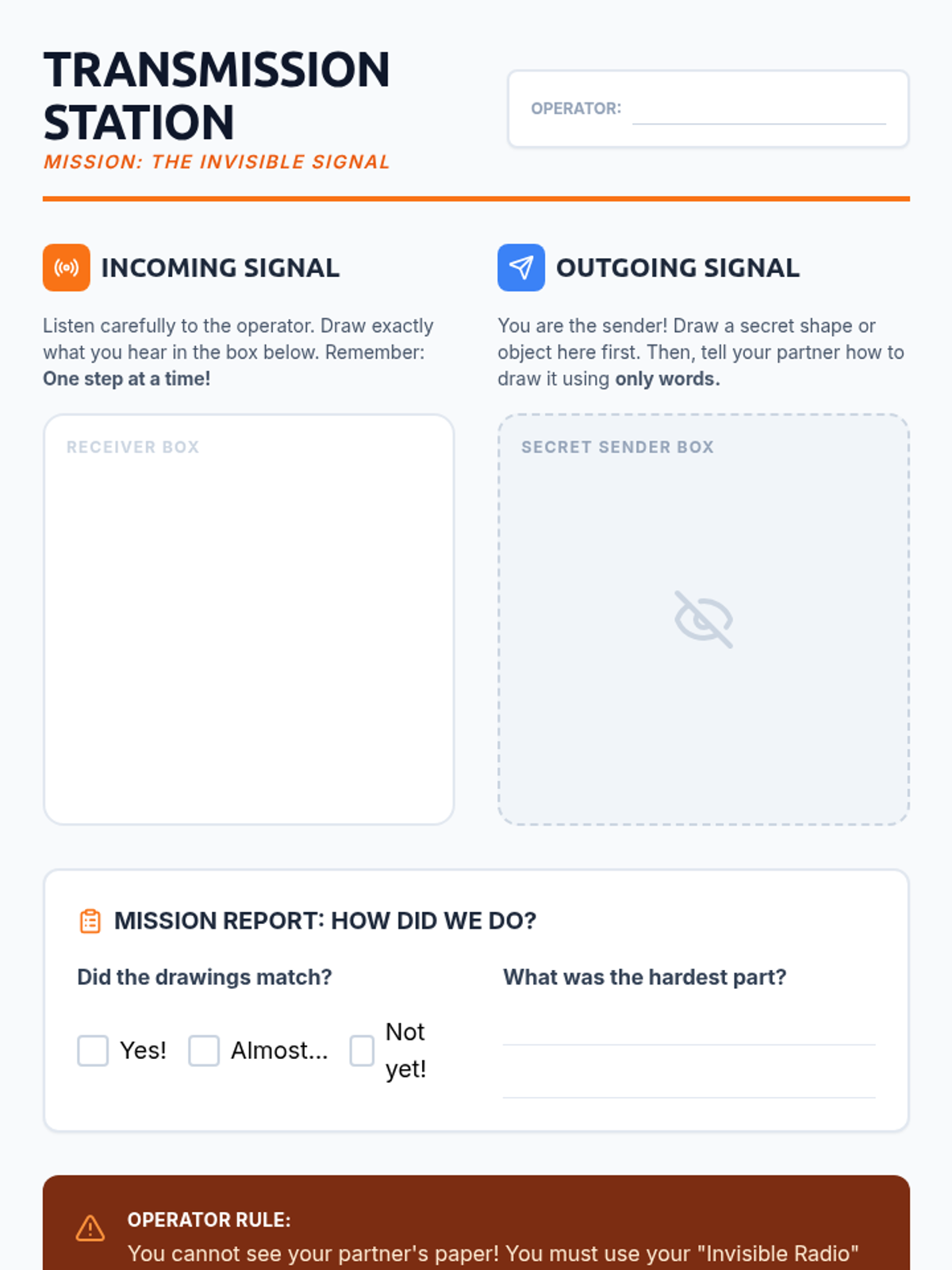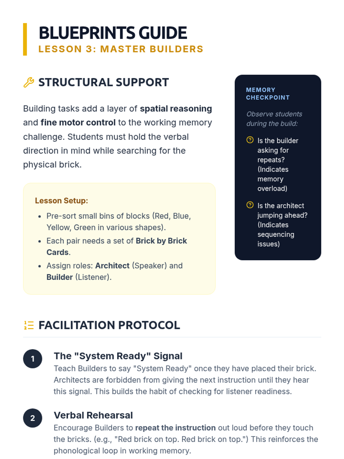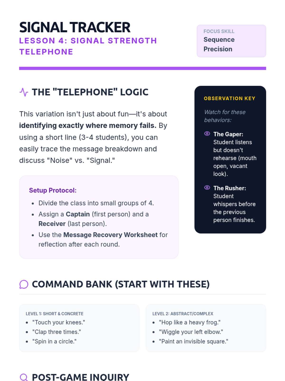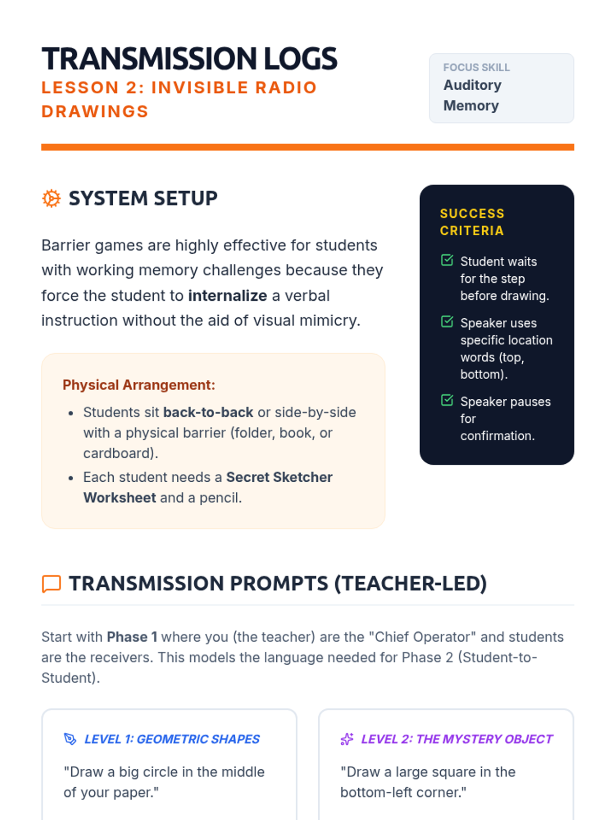 A specialized sequence for 2nd-grade special education students focusing on working memory through single-step directions and peer collaboration. Students progress from simple physical commands to complex barrier games and leadership roles, using a 'Mission Control' theme to emphasize clear communication.