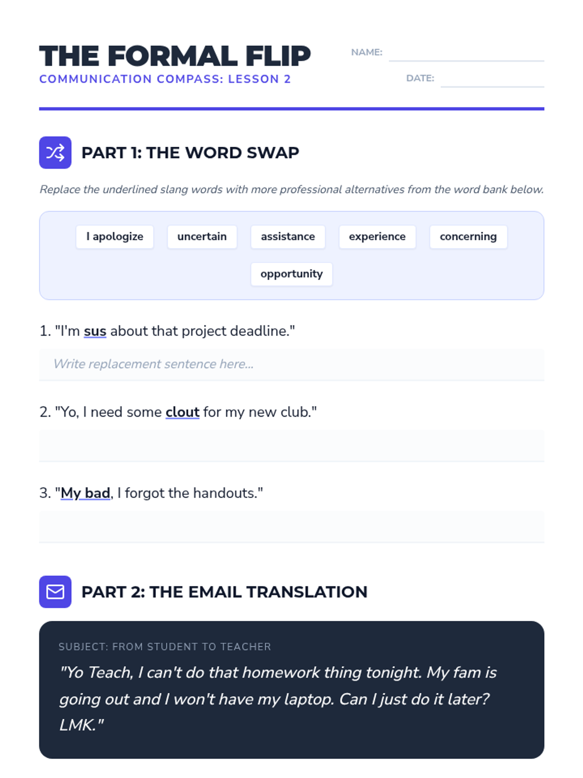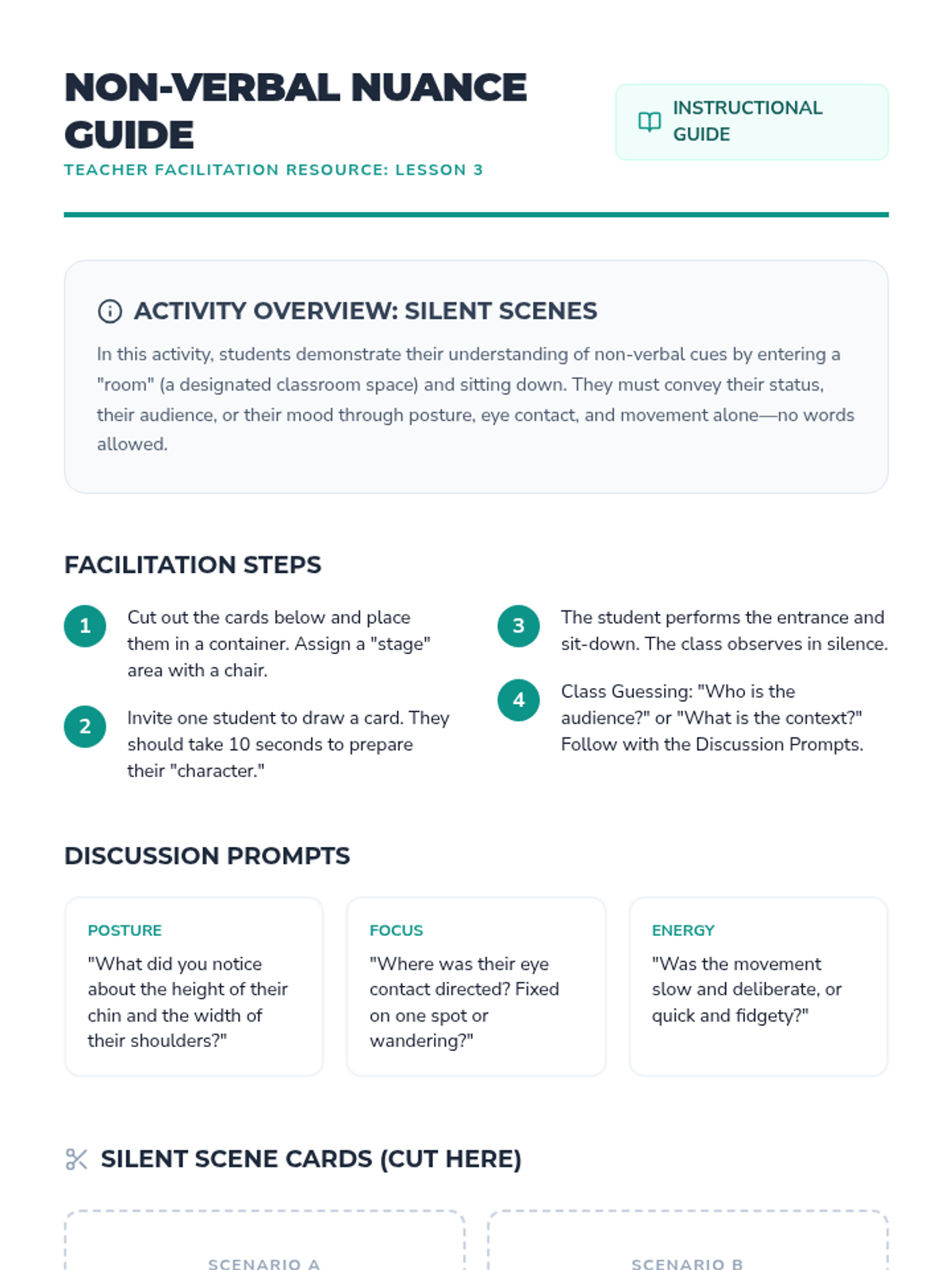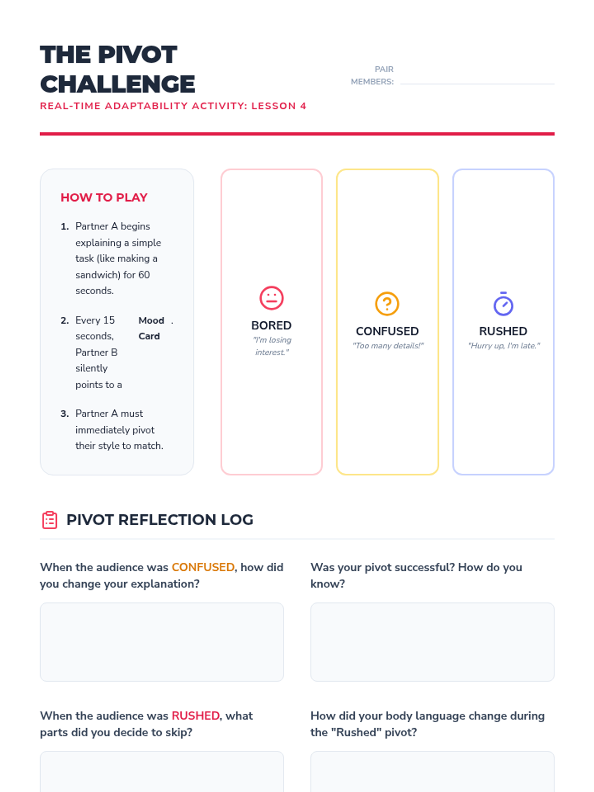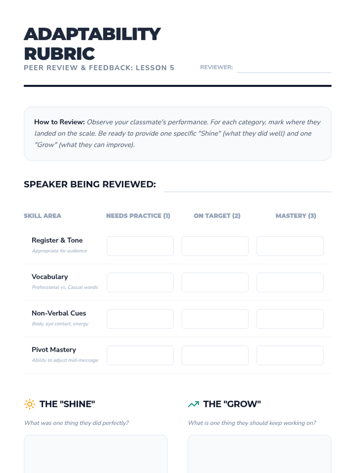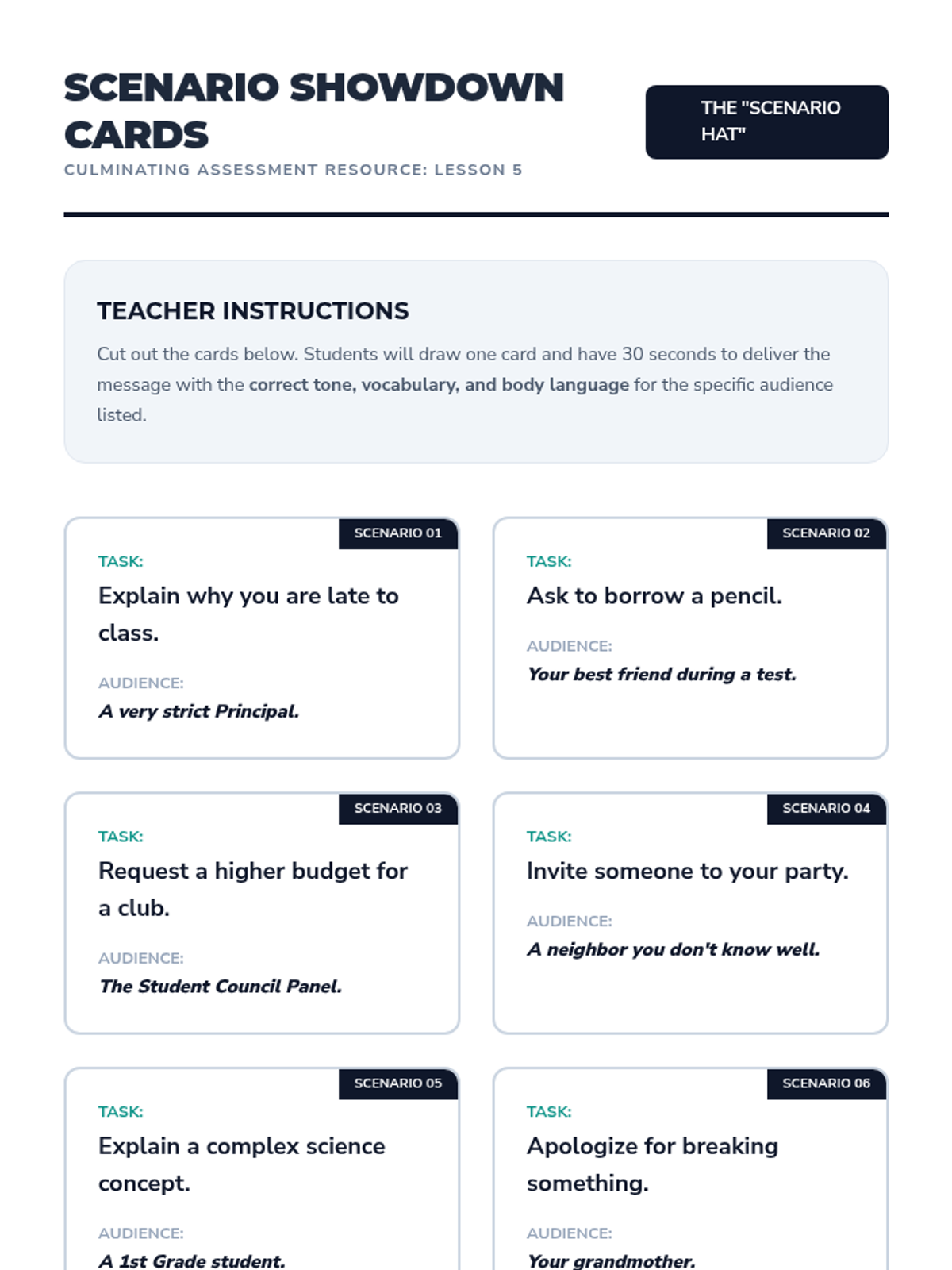 A 5-lesson sequence for 6th graders to master communication adaptability. Students learn to analyze their audience, code-switch between casual and professional registers, adapt non-verbal cues, and pivot their style in real-time based on social feedback.