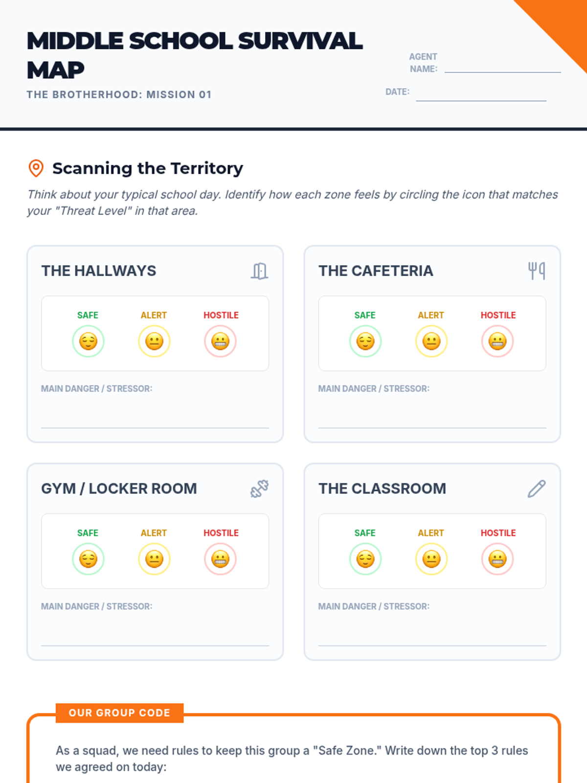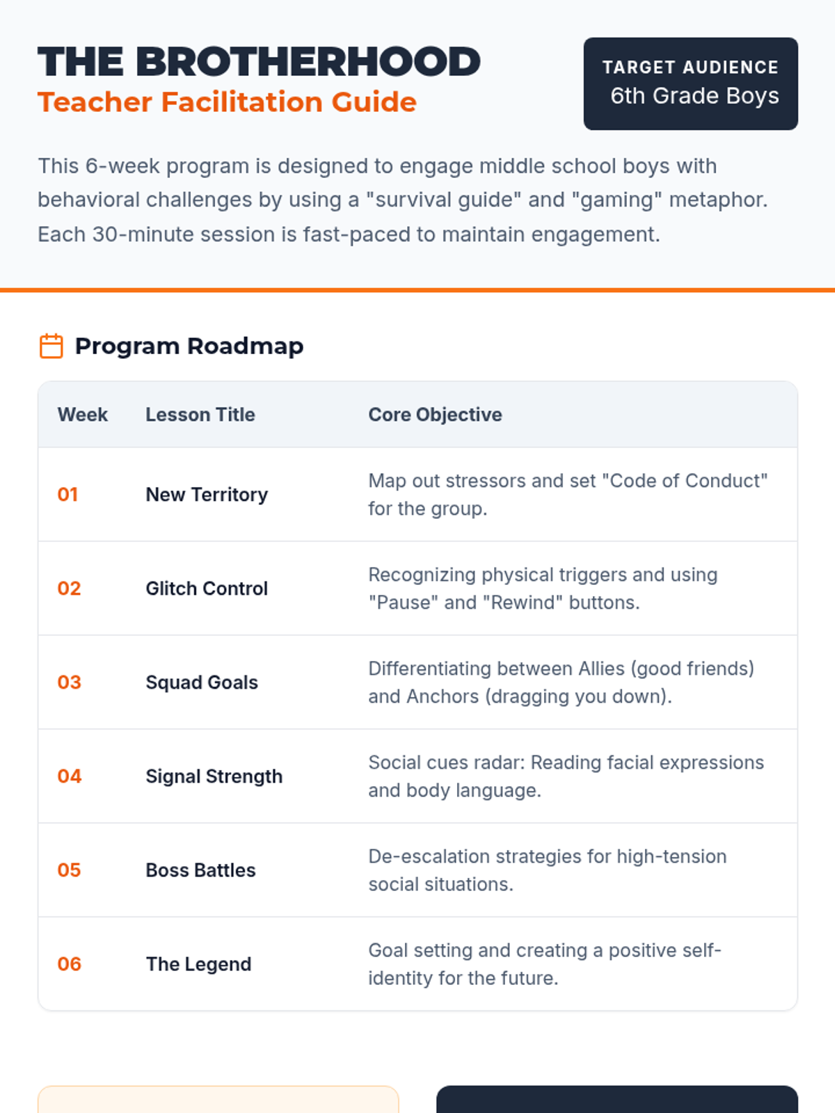A 6-week social-emotional learning program designed specifically for 6th-grade boys. The sequence focuses on transitioning to middle school, emotional regulation, healthy friendships, communication, conflict resolution, and positive self-identity through a 'survival guide' lens.