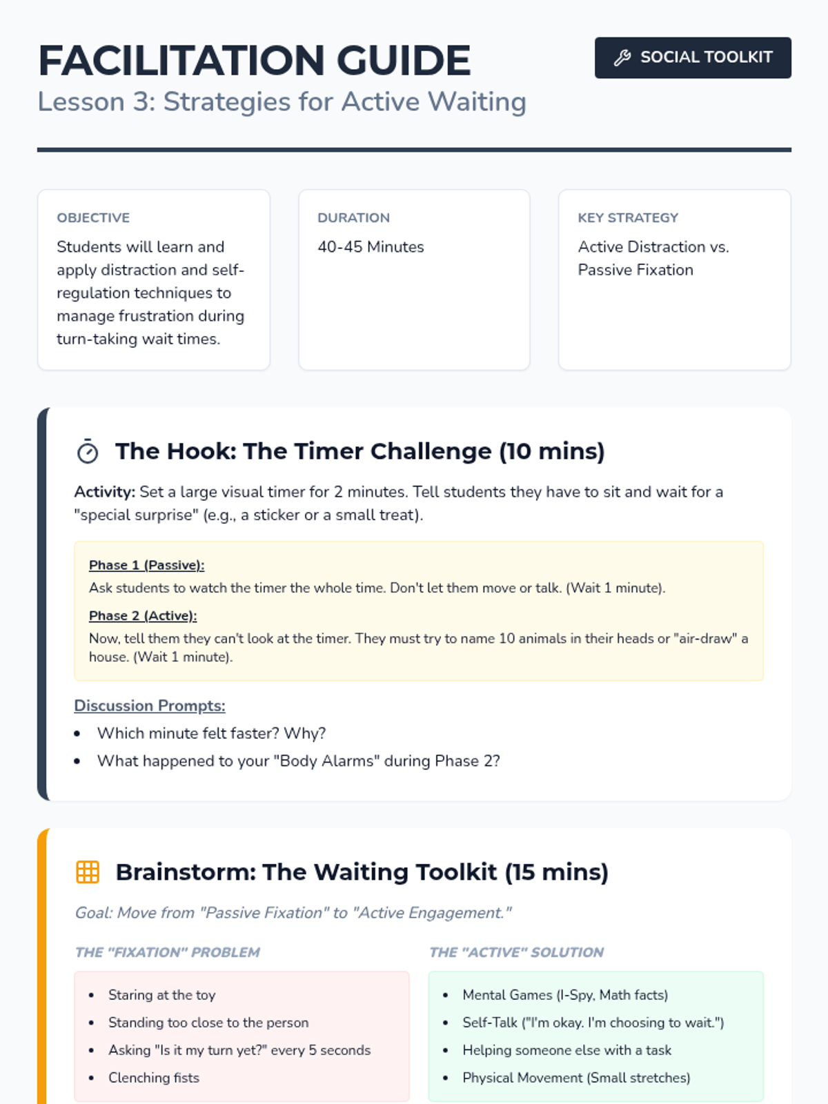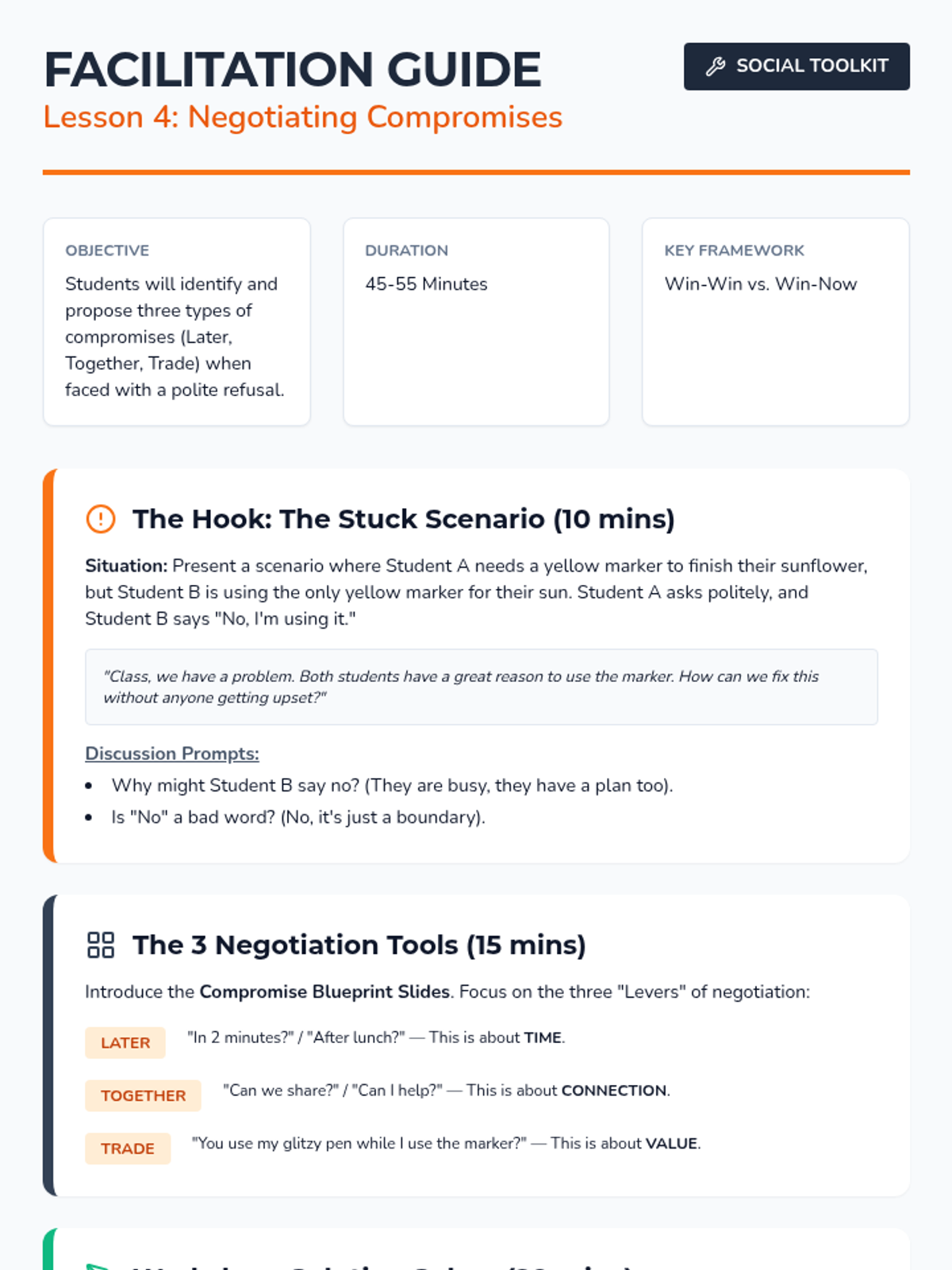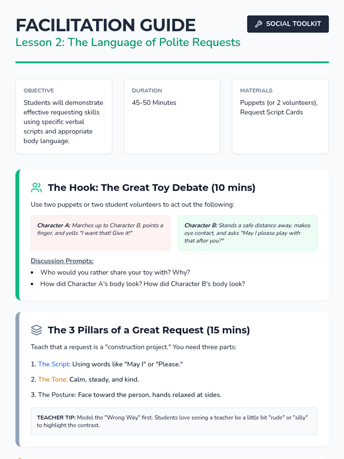A 5-lesson sequence for 3rd graders focused on the verbal and behavioral mechanics of turn-taking, sharing, and negotiation. Students progress from impulse control to mastering polite requests, active waiting, and complex social compromises.
