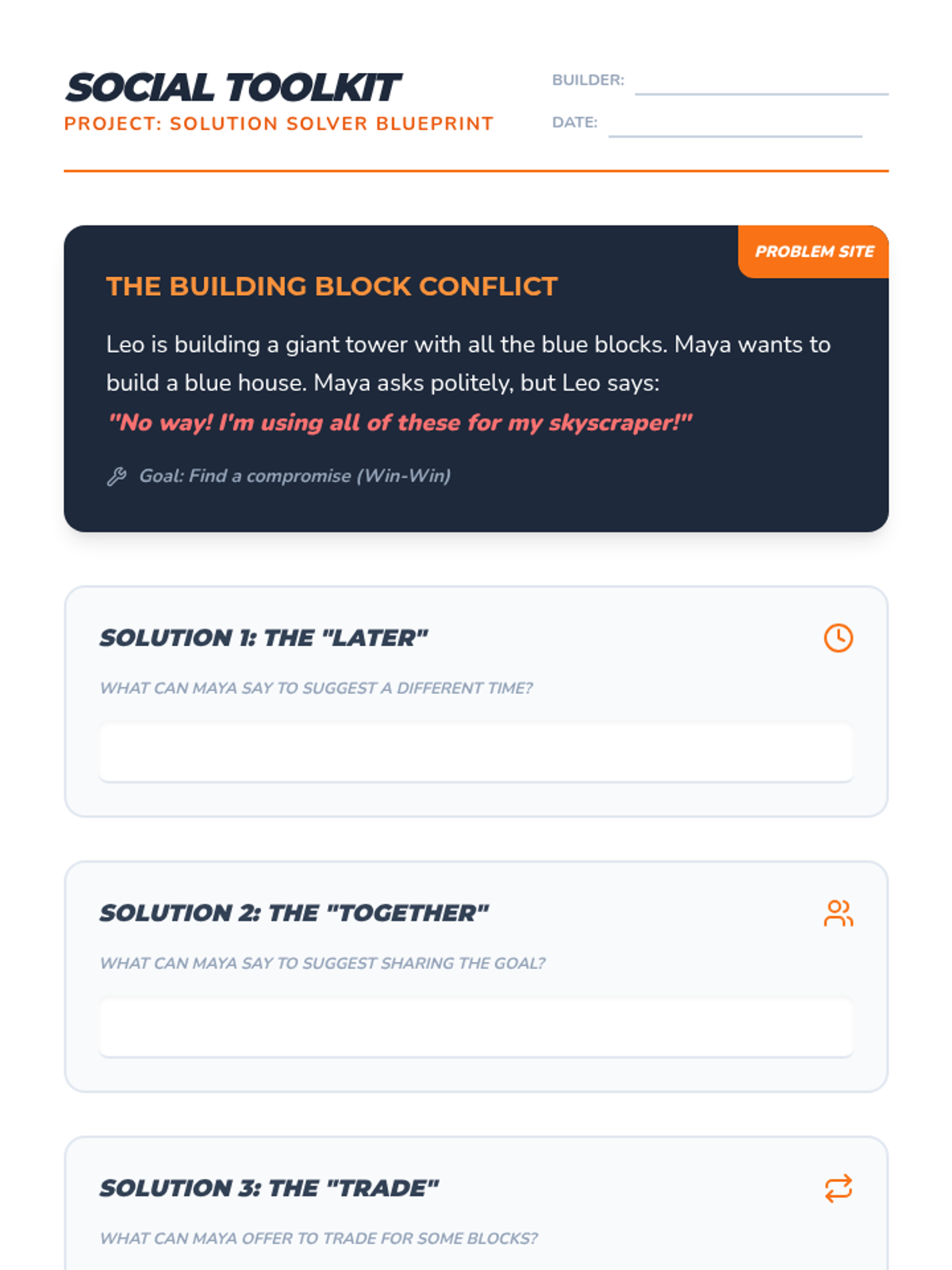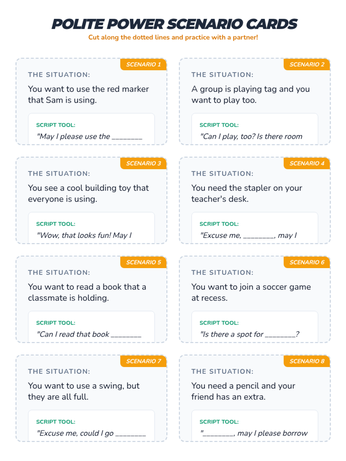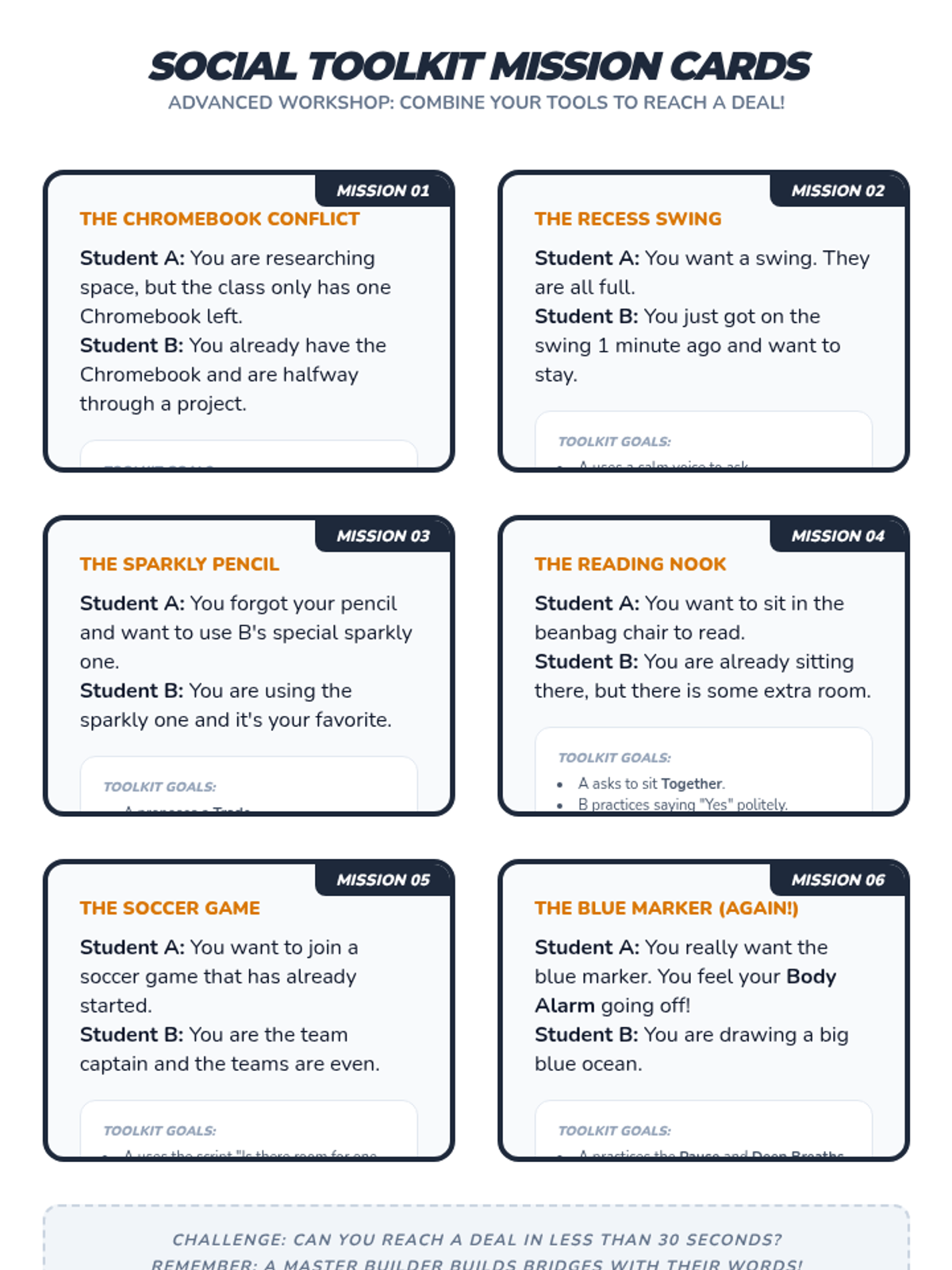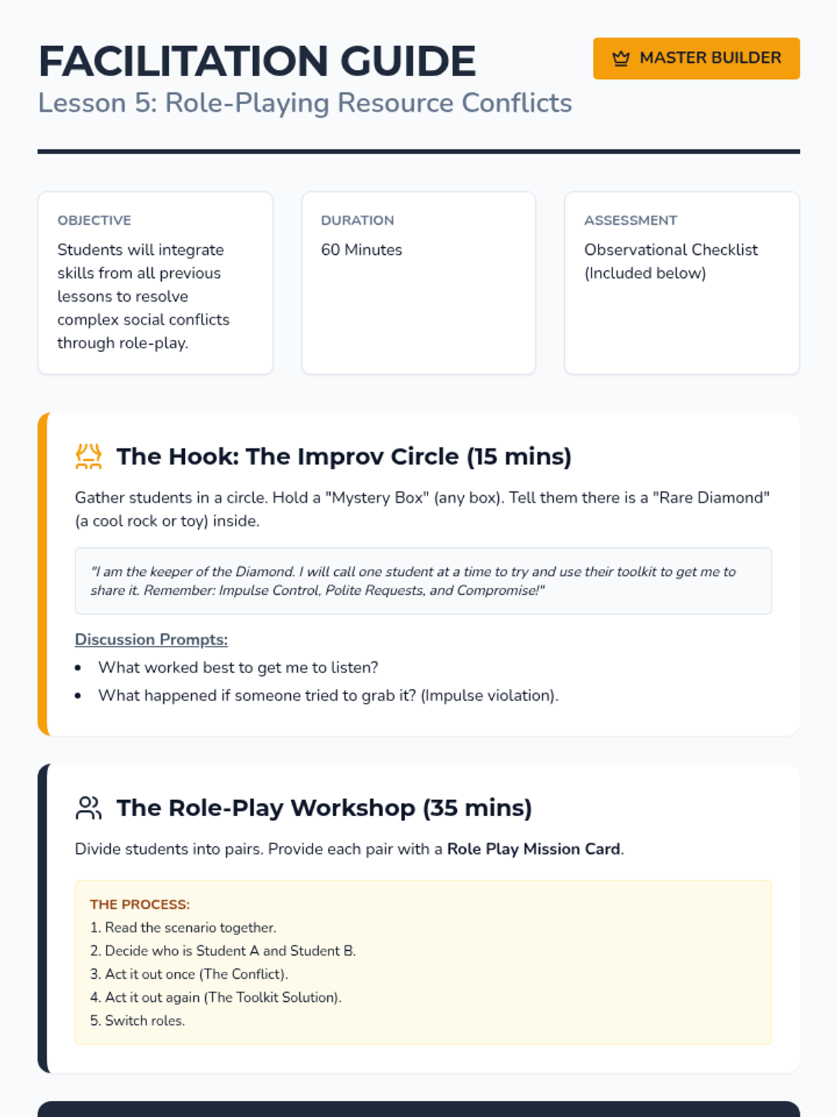 A 5-lesson sequence for 3rd graders focused on the verbal and behavioral mechanics of turn-taking, sharing, and negotiation. Students progress from impulse control to mastering polite requests, active waiting, and complex social compromises.
