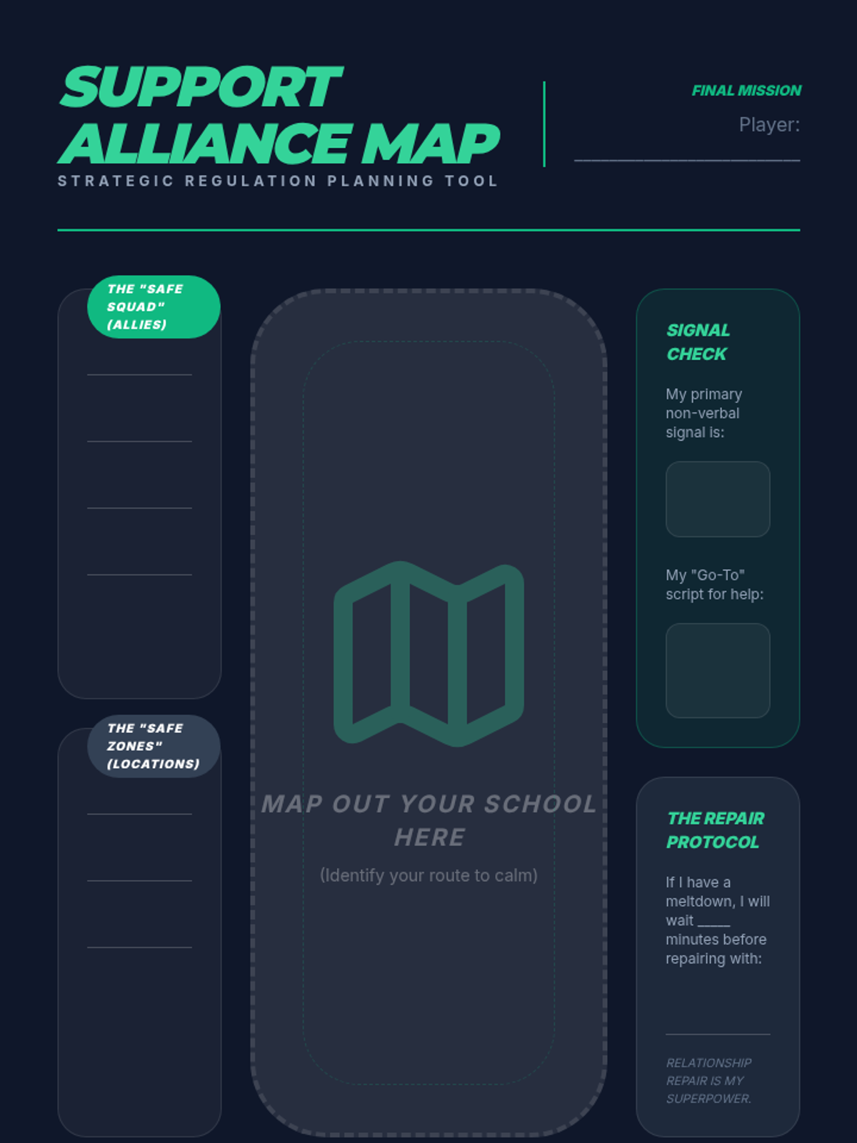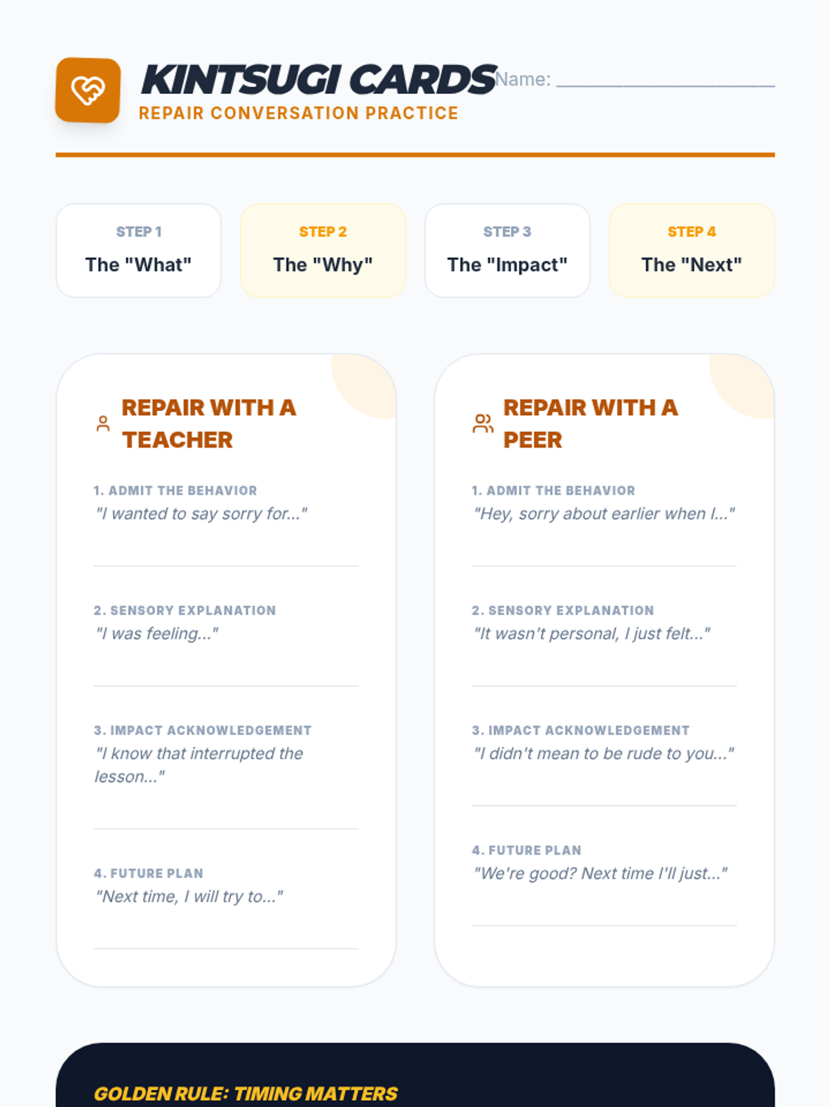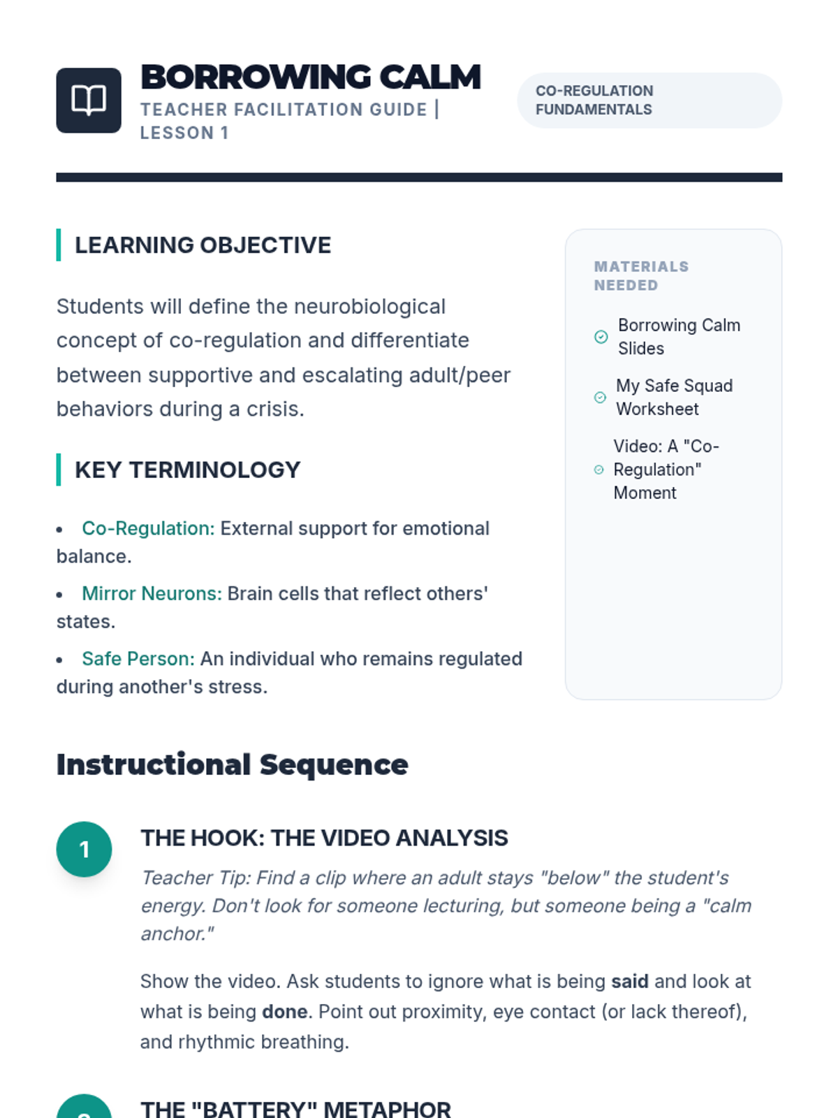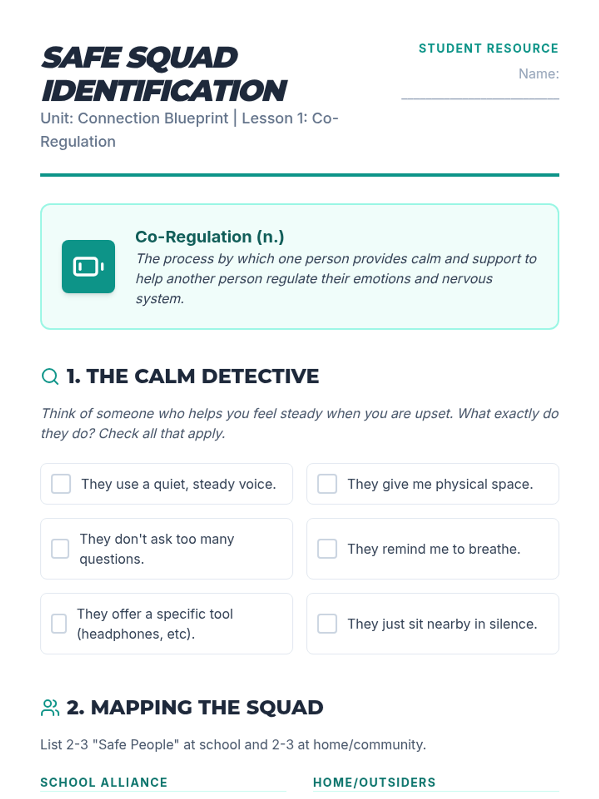 A 5-lesson sequence for 8th-grade students focusing on the social and communicative aspects of dysregulation recovery. Students learn to identify safe people, use non-verbal signals, script self-advocacy, and engage in restorative conversations to repair relationships after a meltdown.