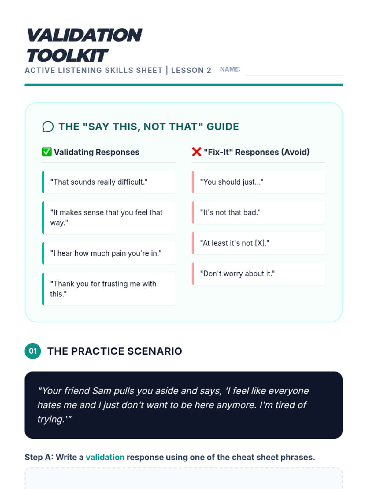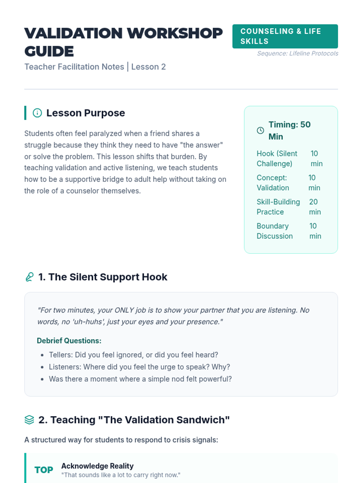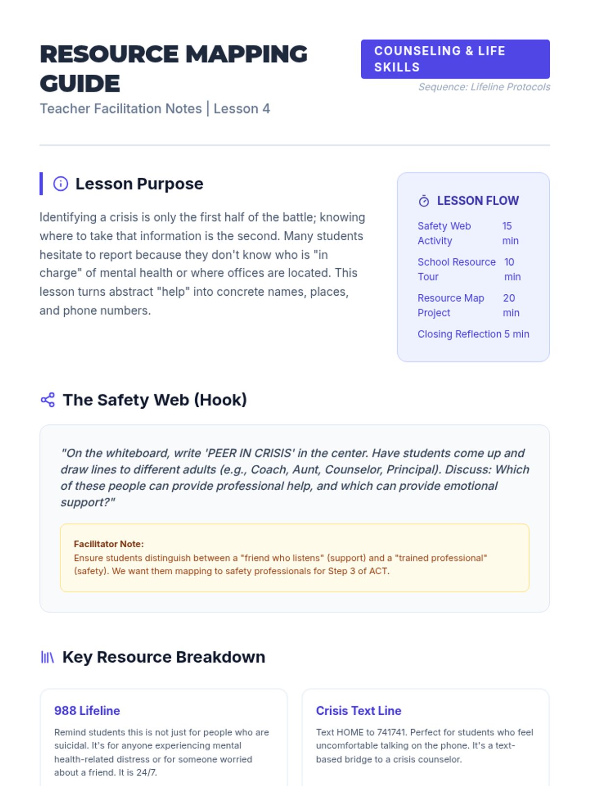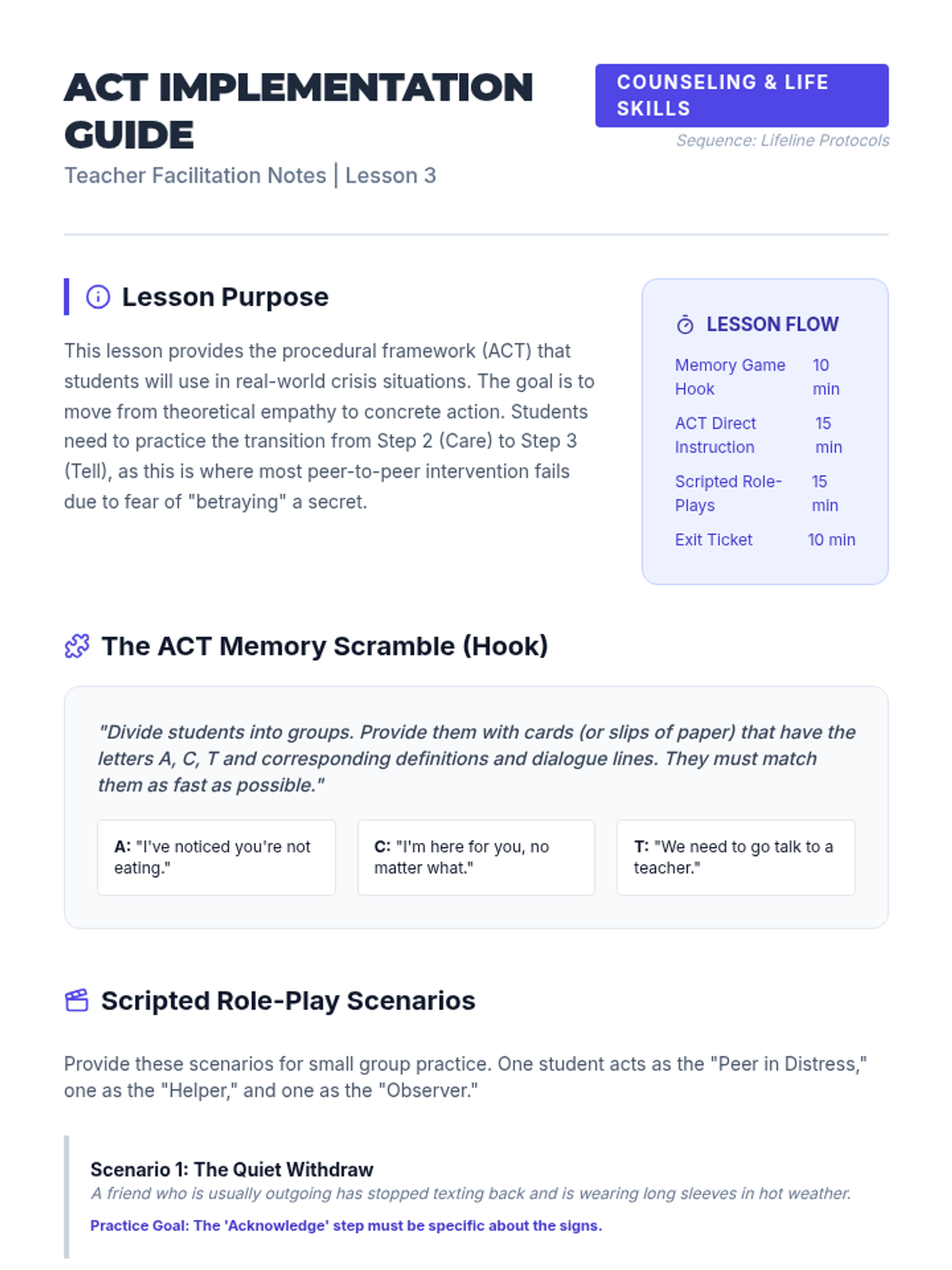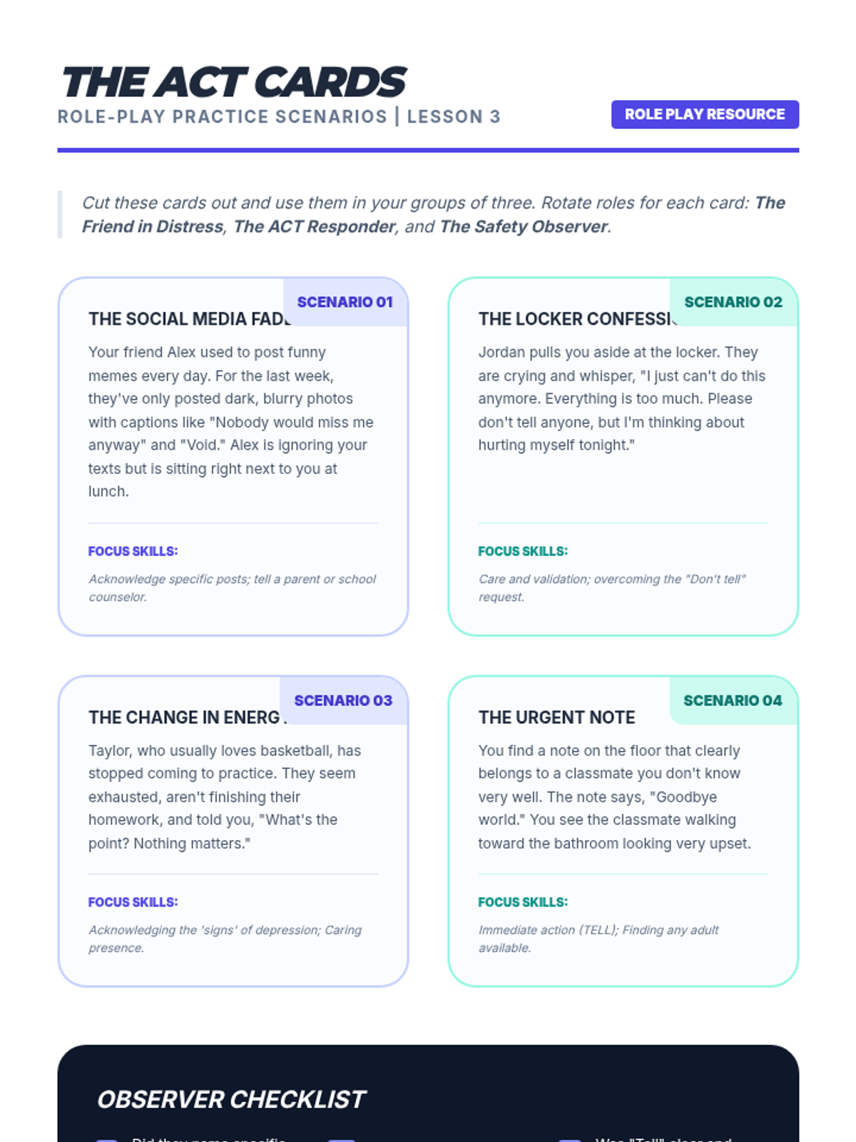 This sequence focuses on teaching 7th-grade students how to safely and effectively help a peer in a mental health crisis using the ACT (Acknowledge, Care, Tell) model. Students move from understanding psychological barriers like the bystander effect to practicing empathetic listening and identifying concrete resources for professional support.