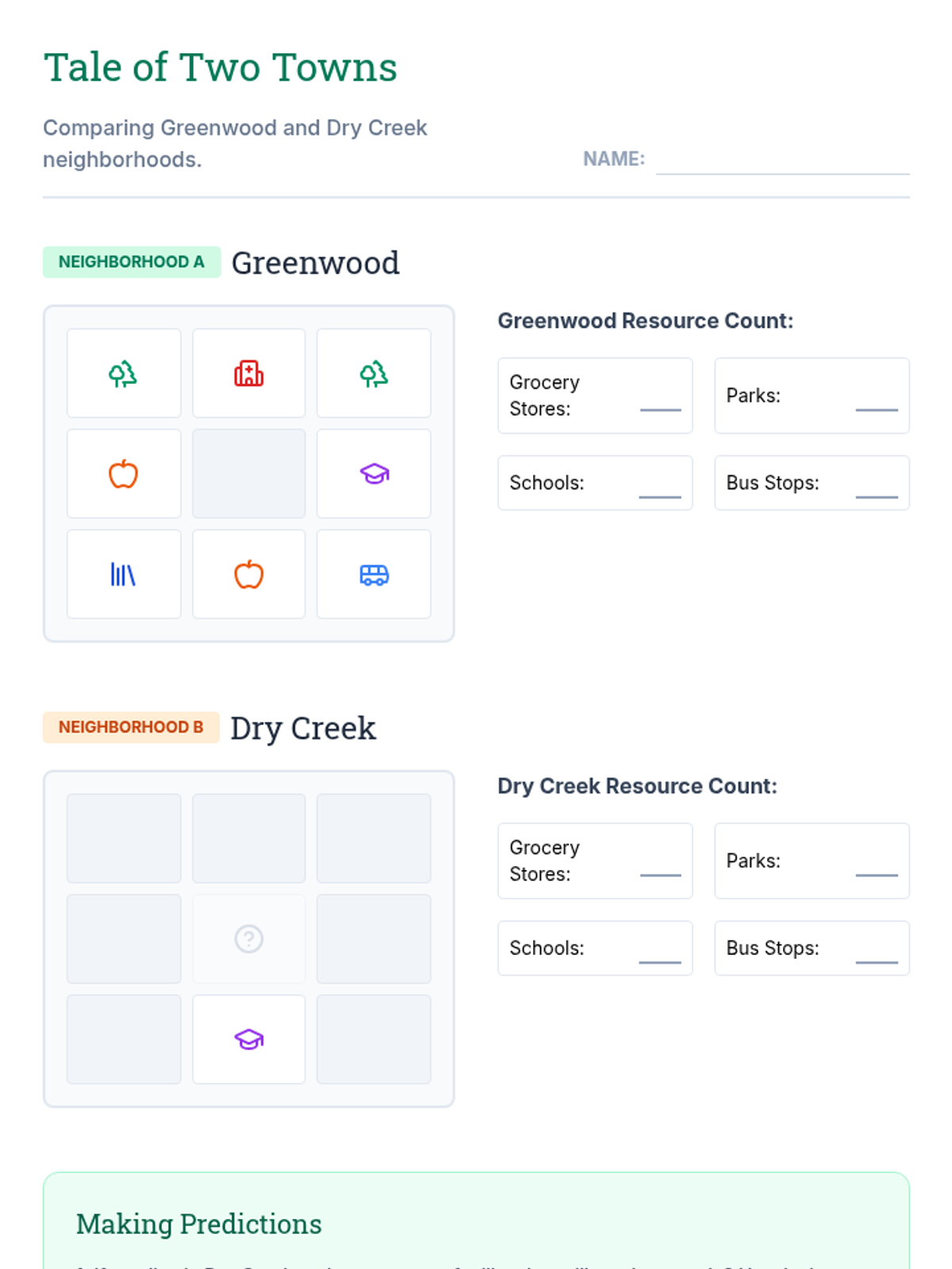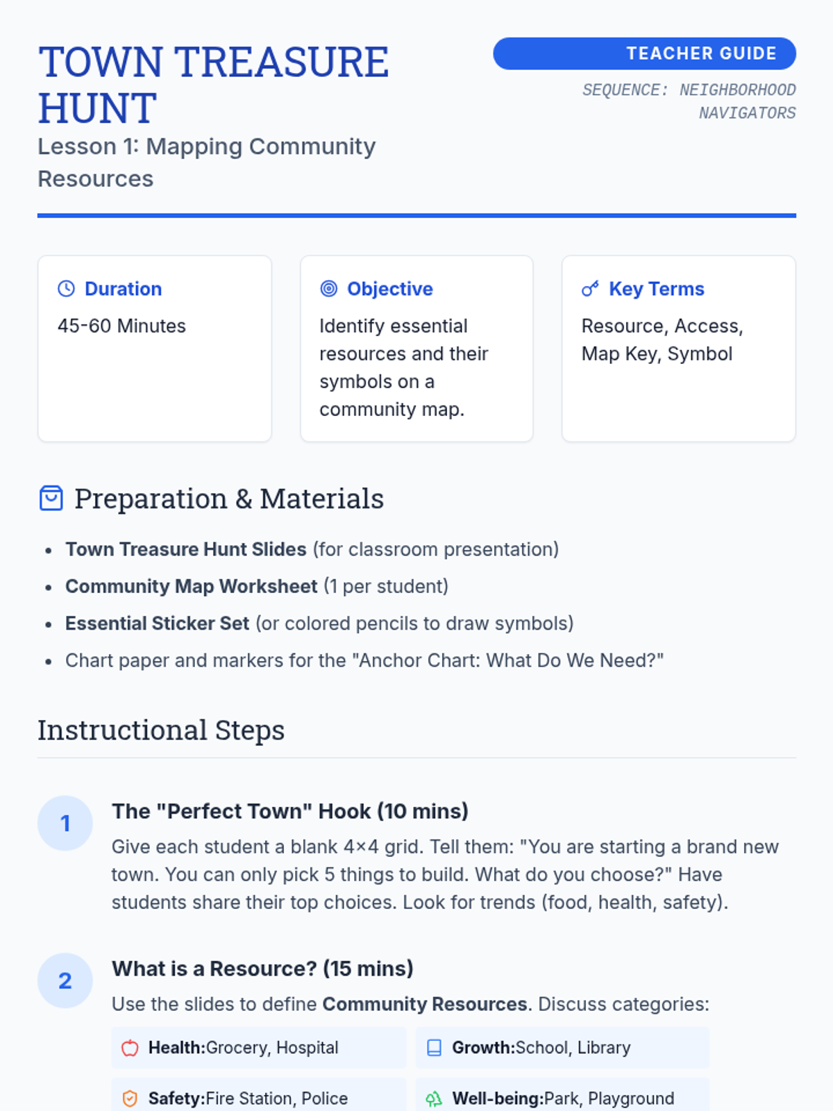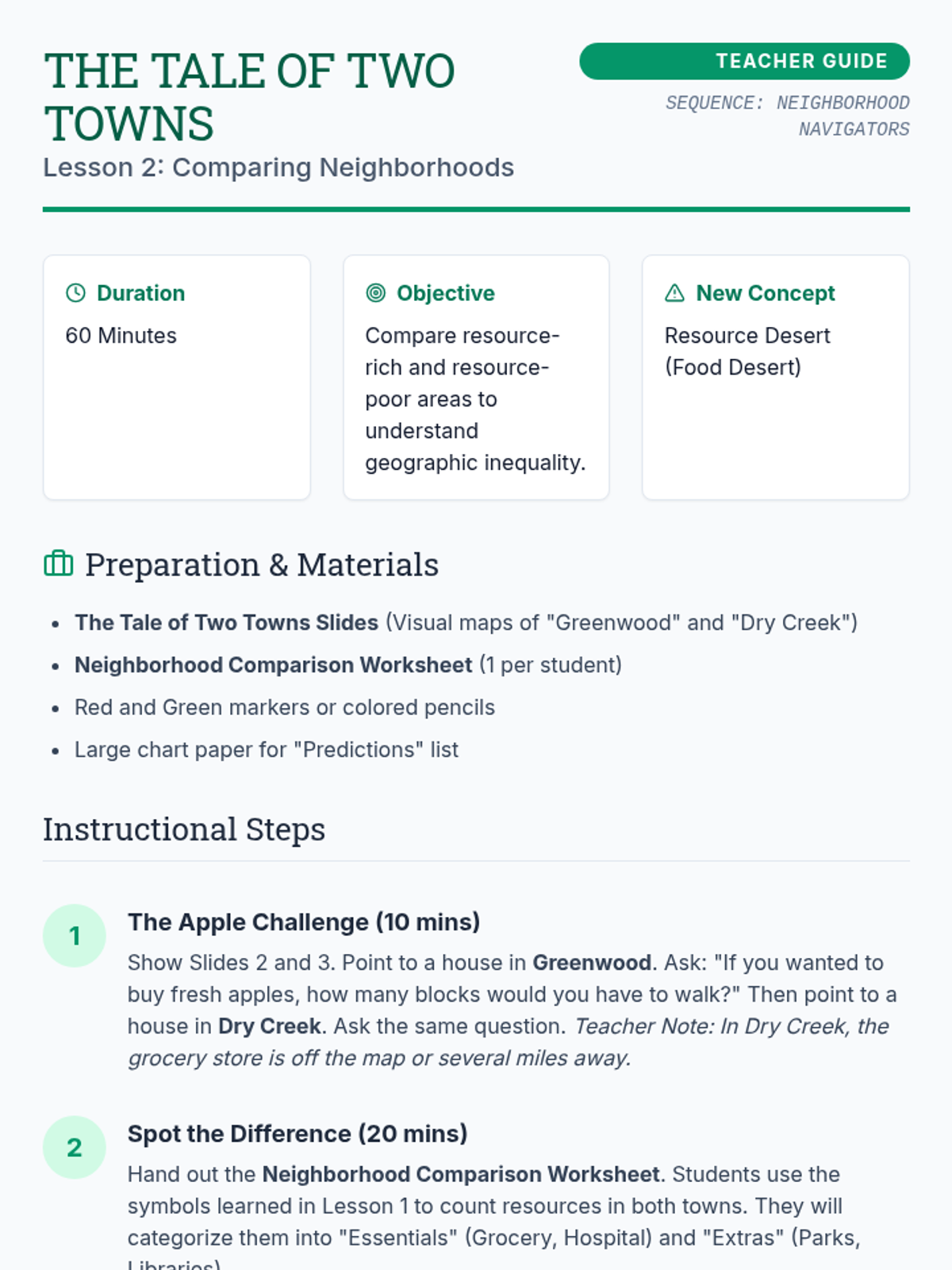 This sequence explores how geographic location and resource distribution impact economic opportunity and quality of life for 3rd-grade students. Through map analysis, simulation, and urban planning projects, students learn about 'resource deserts,' the importance of public goods, and systemic barriers to access.