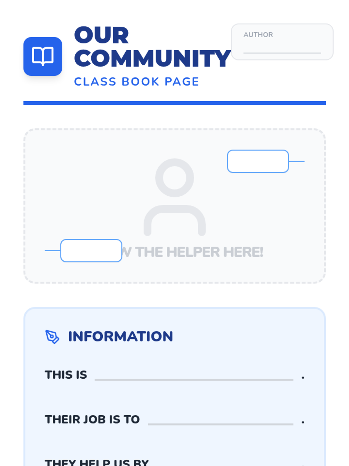 A Kindergarten ELA sequence where students use informational texts to explore their community. They learn about community helpers, schools, and the post office while developing skills in identifying main topics, making text-to-self connections, understanding text features, and answering Wh- questions.