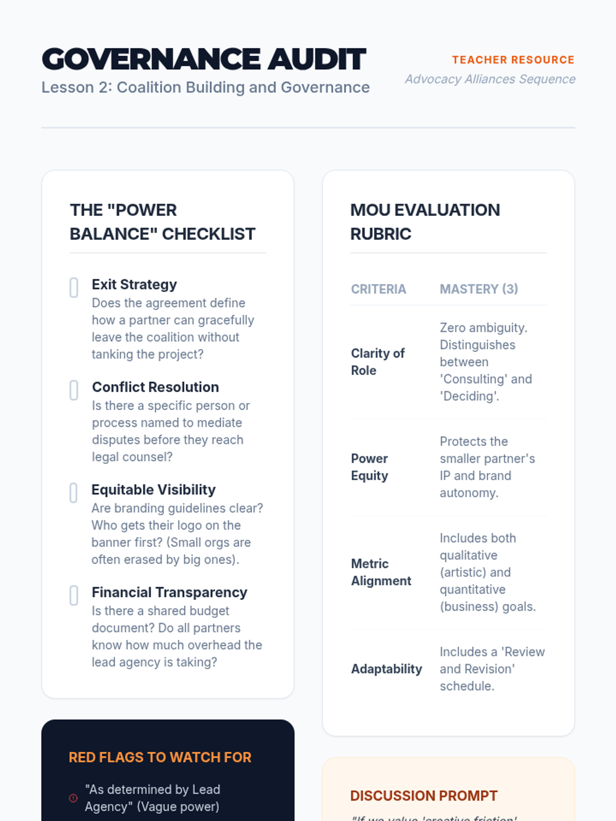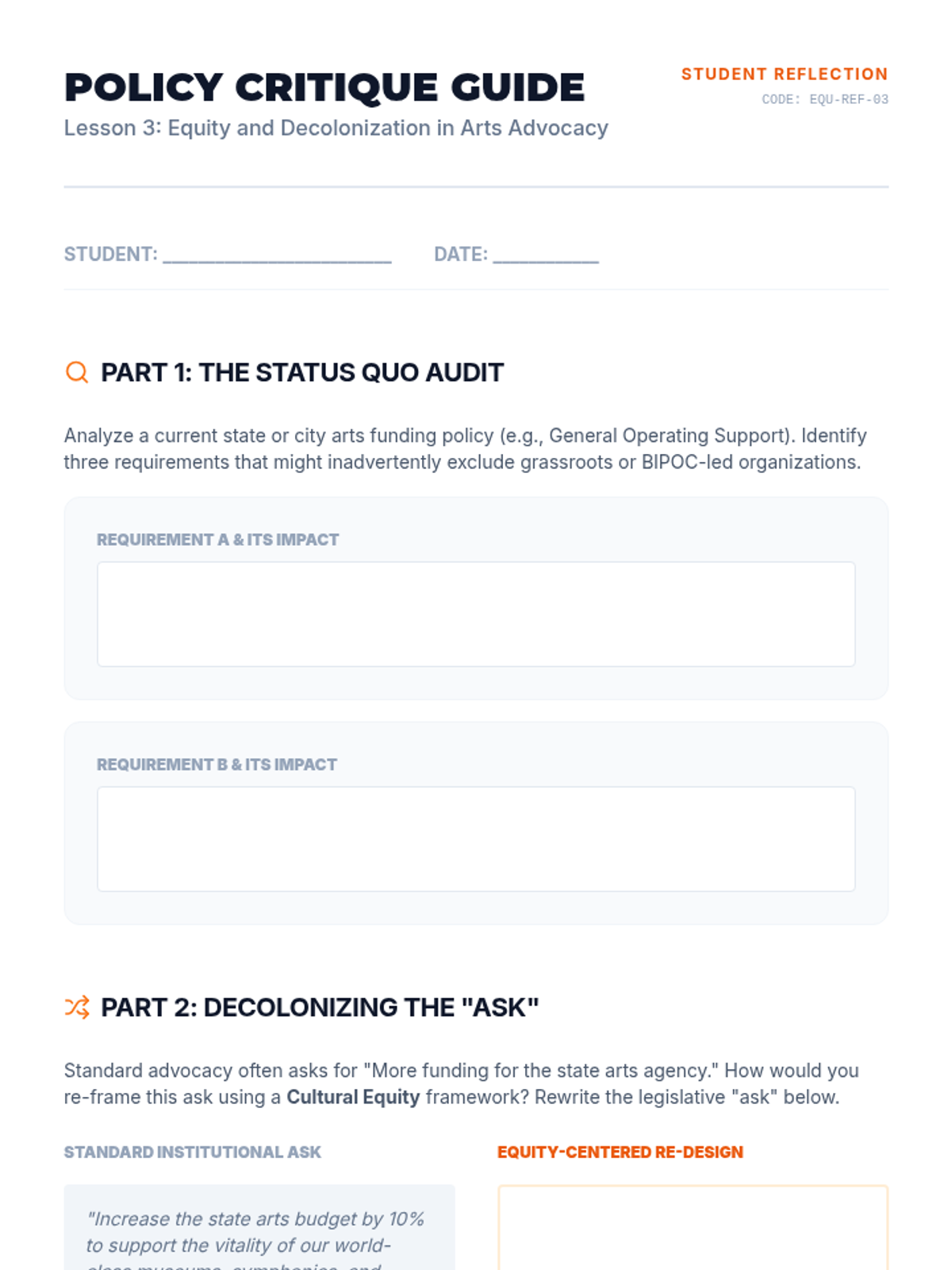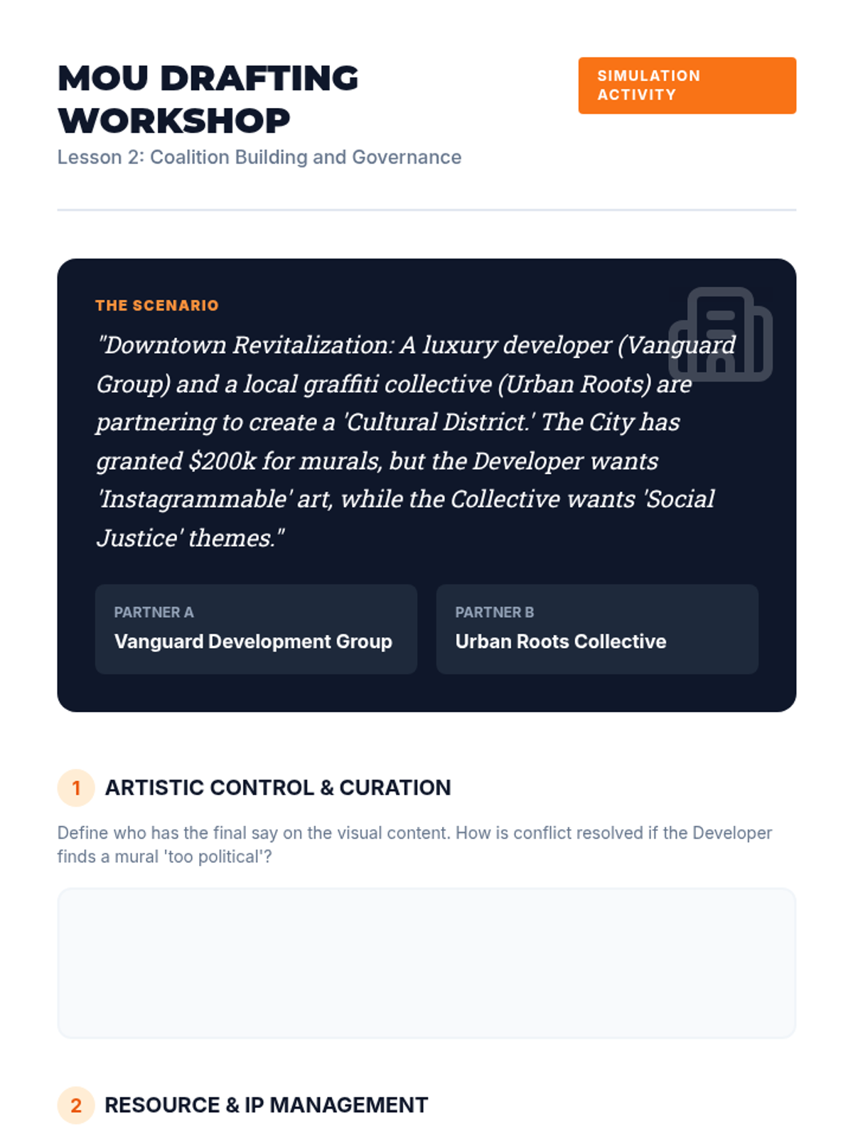 A graduate-level sequence exploring how arts leaders can build powerful, equitable cross-sector coalitions to sustain cultural ecosystems. Students move from systems mapping to governance design and grassroots organizing, culminating in a collective impact proposal.