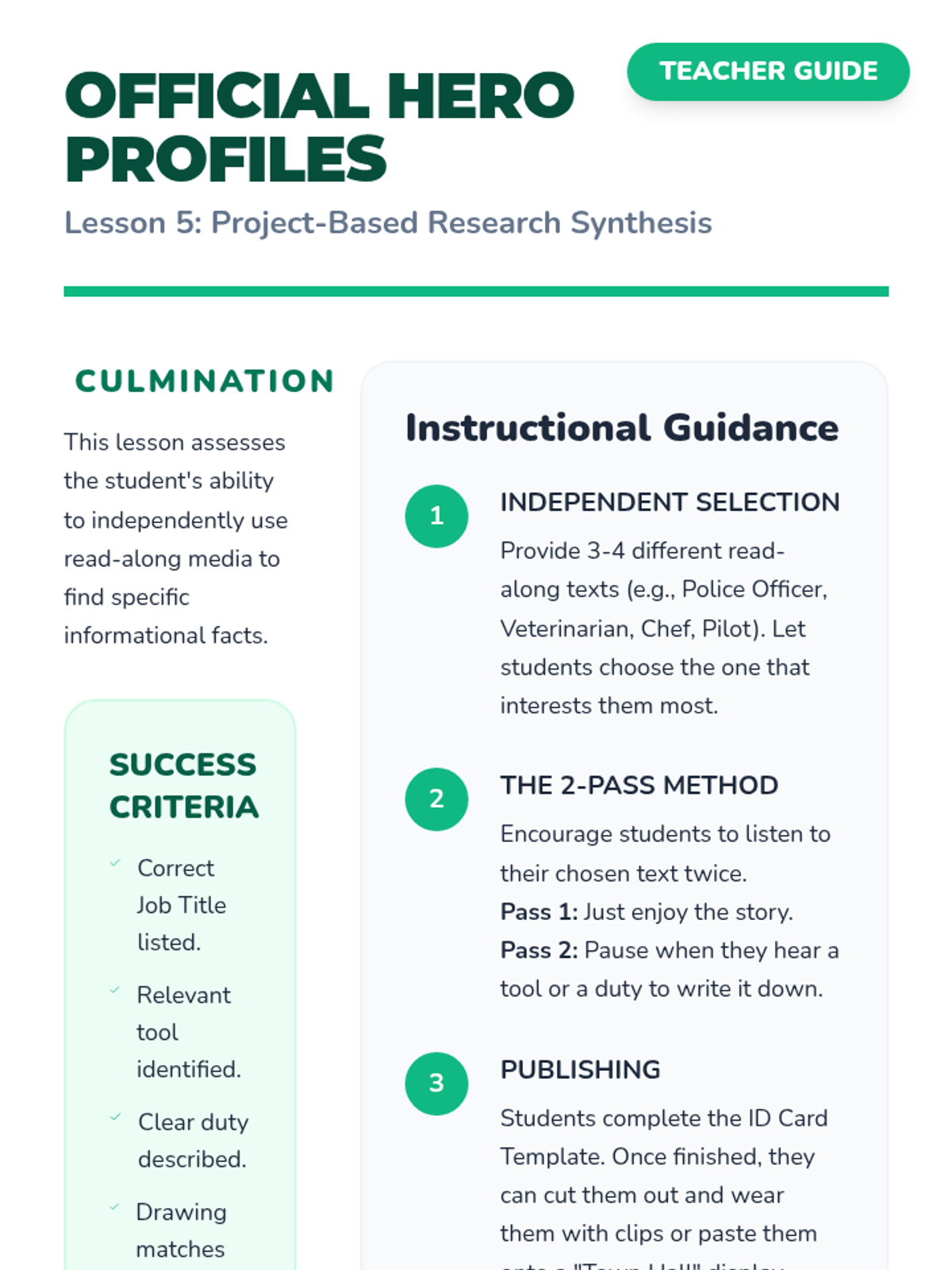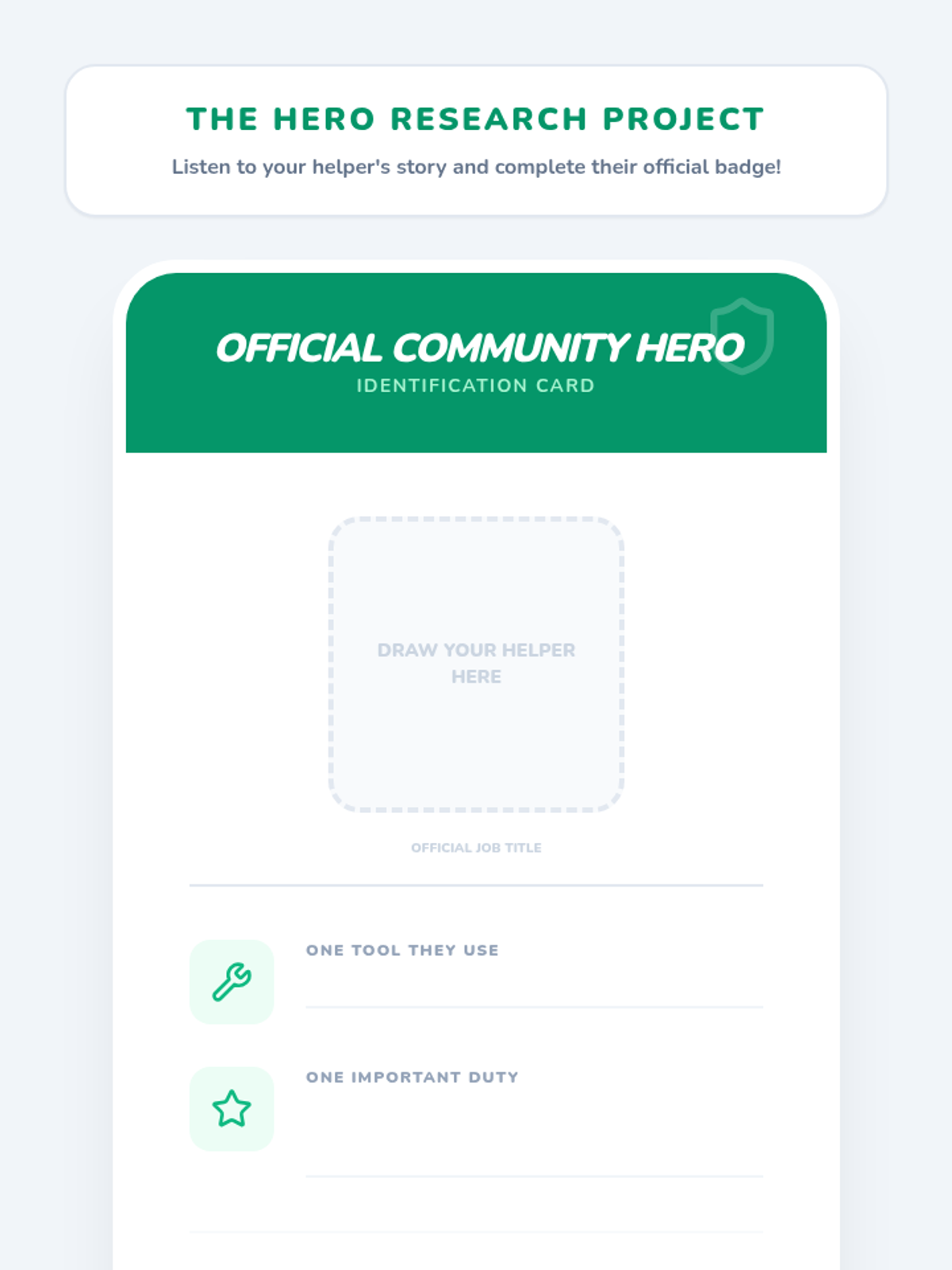 Students use read-along informational texts to research community helpers, categorize tools, and compare roles, culminating in the creation of a 'Community Helper Profile Card'.