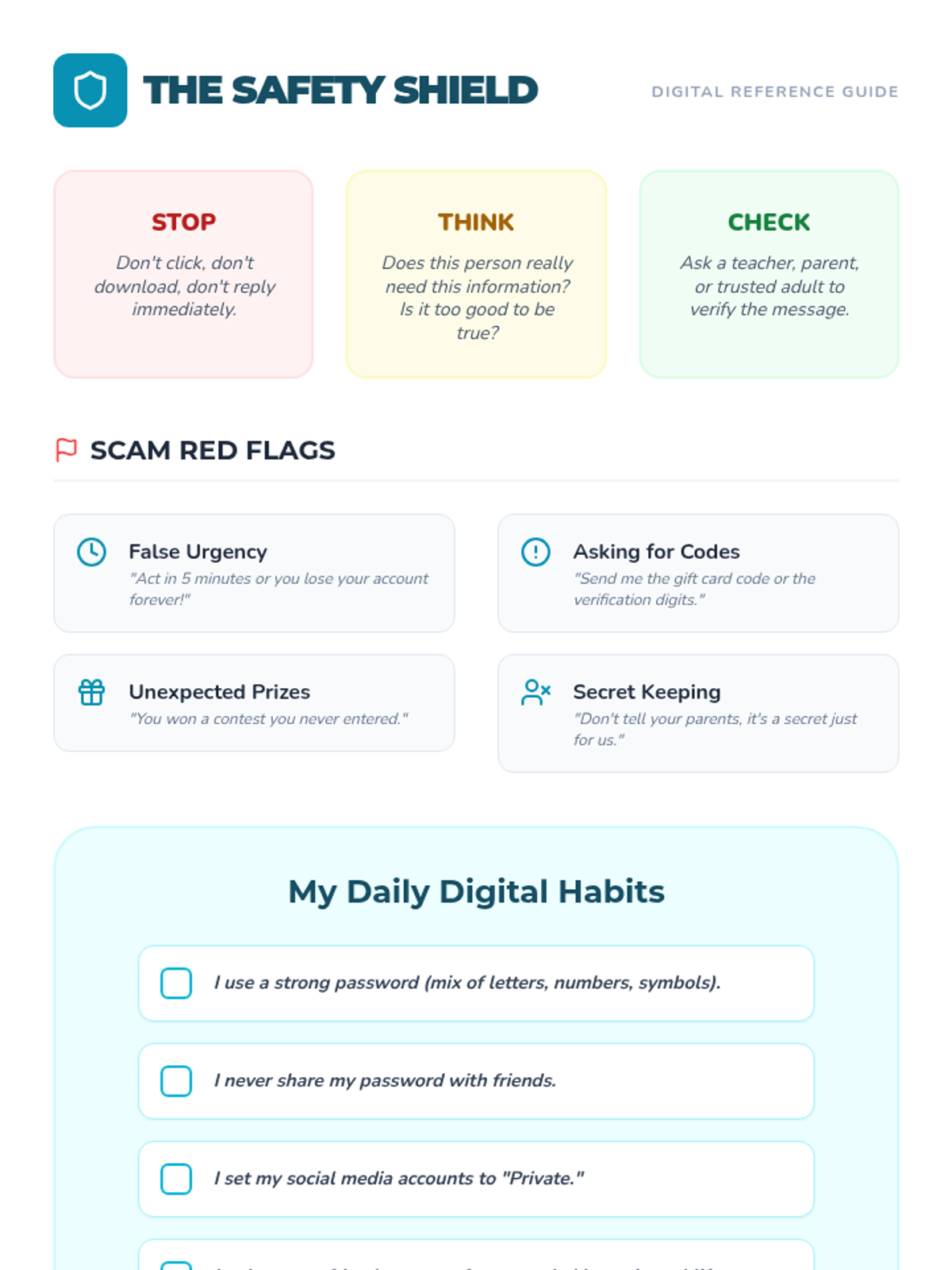 This life skills sequence for high schoolers with low cognitive abilities uses a traffic light model (Green, Yellow, Red) to teach digital safety. Students learn to navigate teen-relevant scenarios like social media requests, online shopping ads, and interacting with strangers in gaming or apps, focusing on the 'Pause and Ask' reflex.