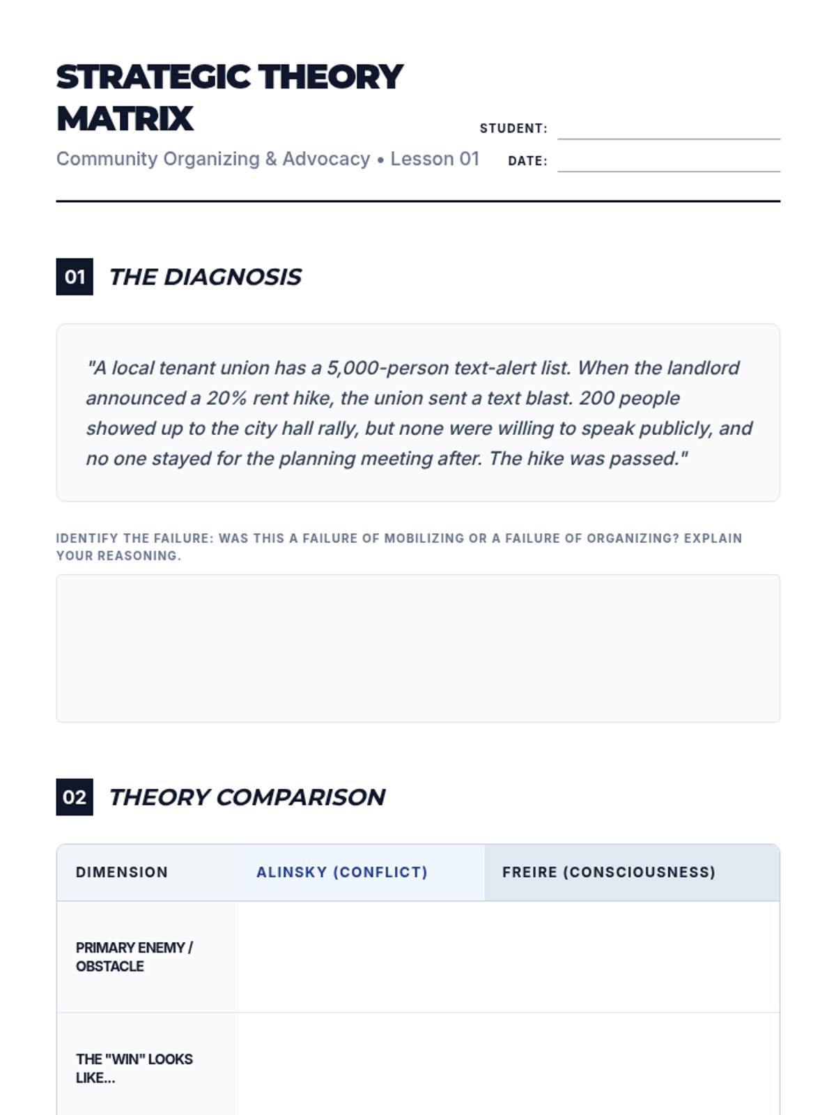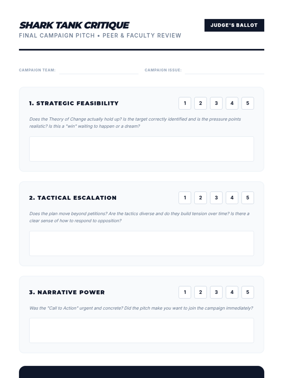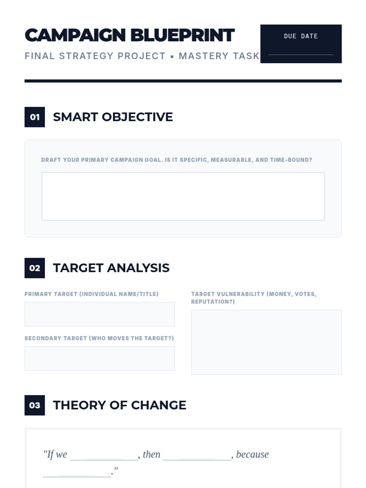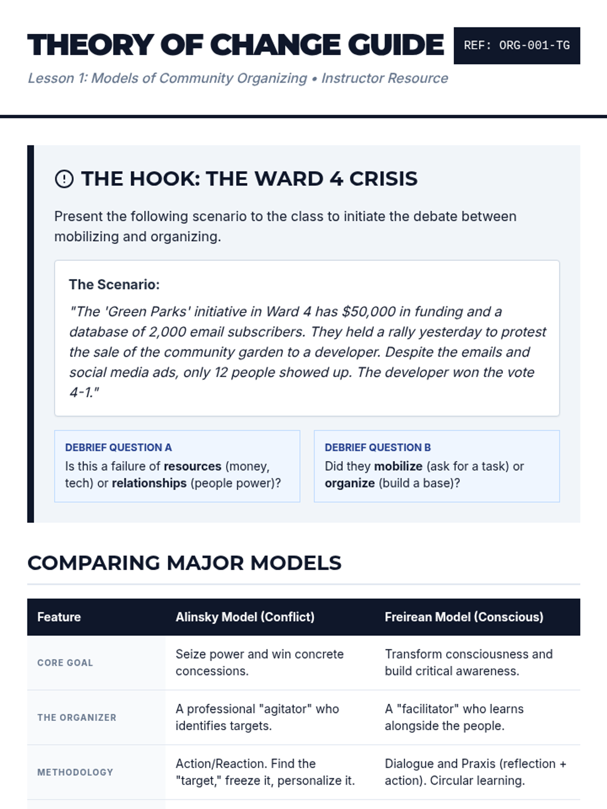 A comprehensive undergraduate sequence on the methodologies of community organizing and legislative advocacy, transitioning from theoretical frameworks to practical campaign design. Students master power mapping, public narrative, and coalition building to address local policy issues.