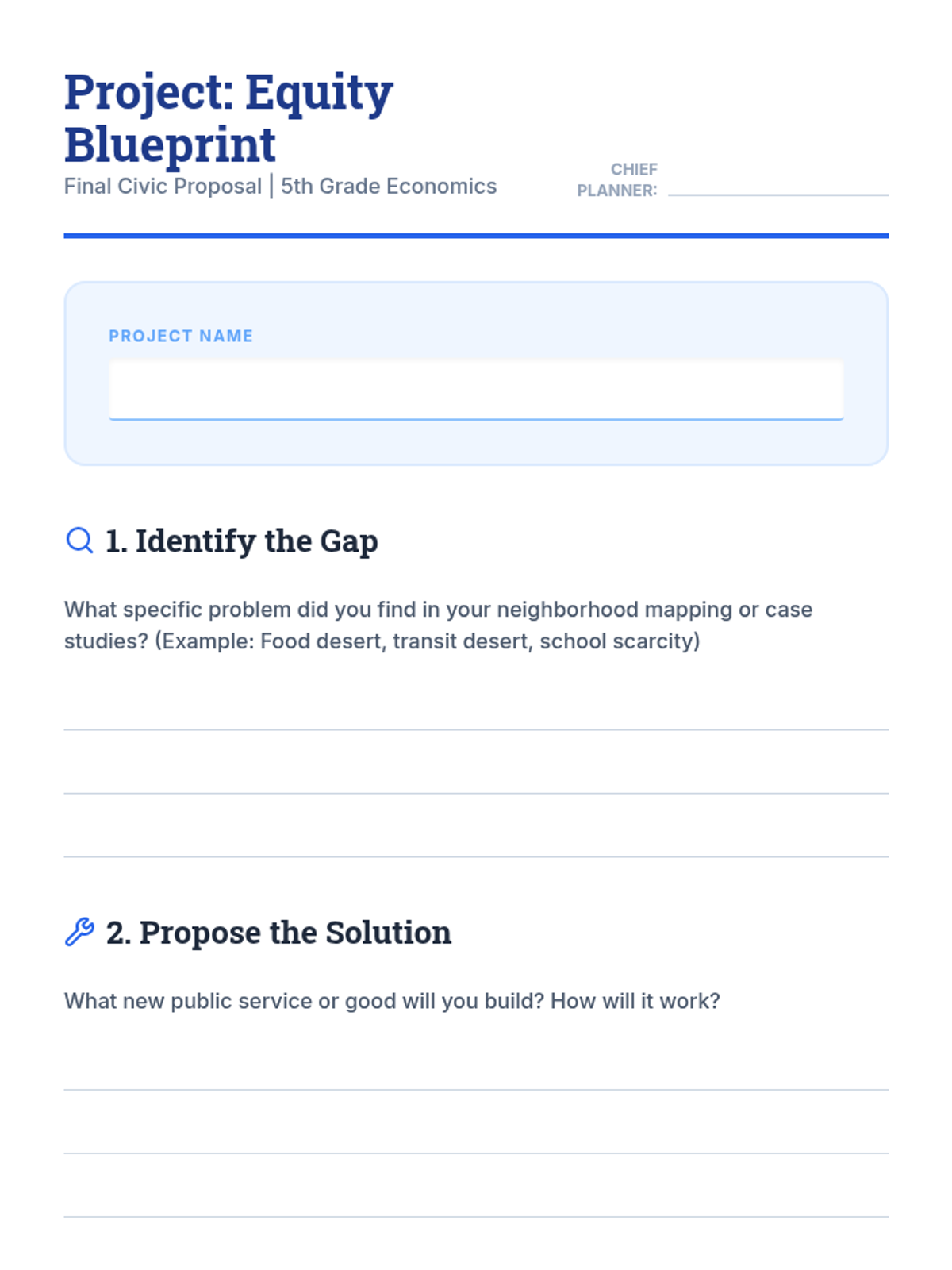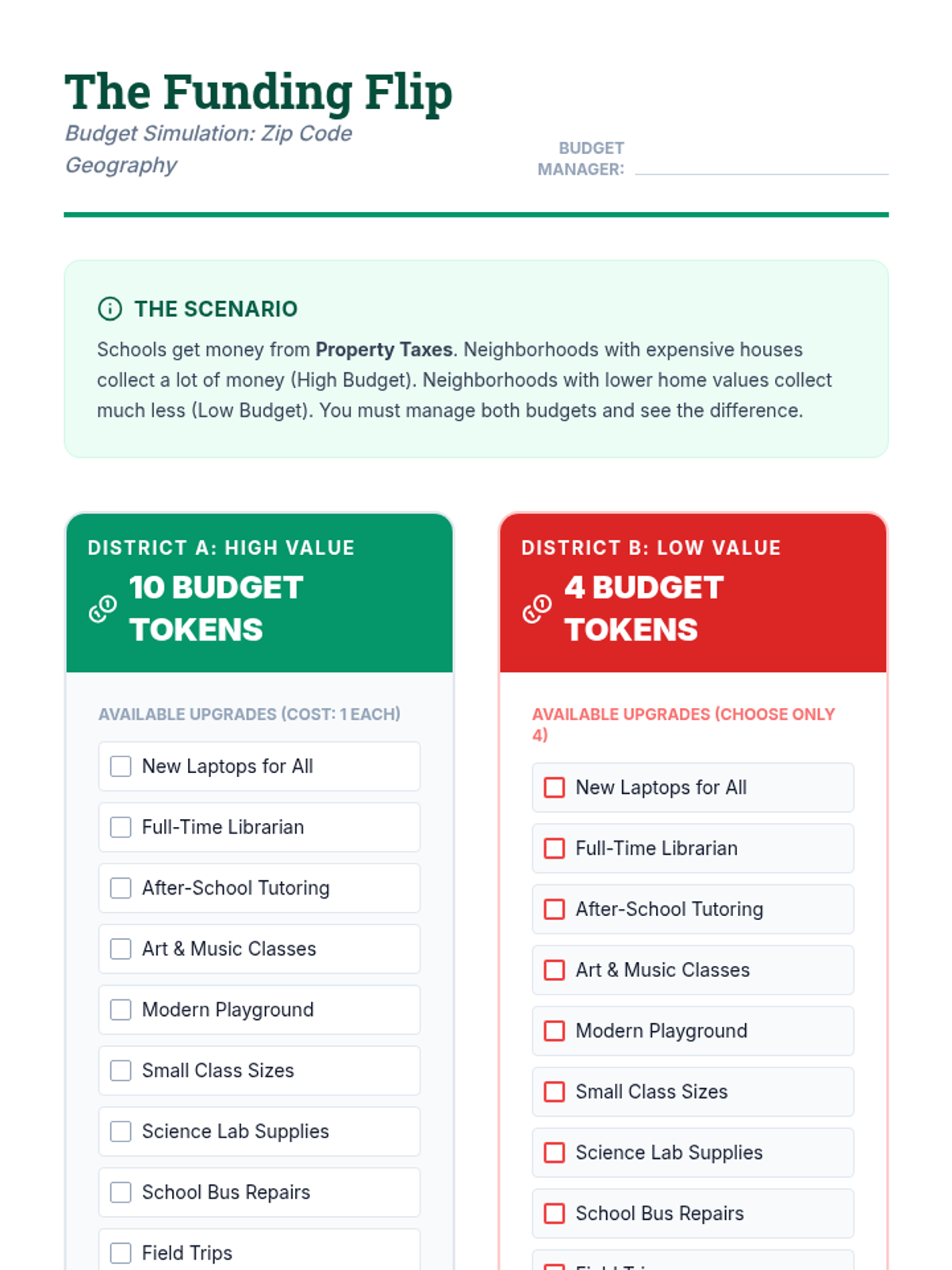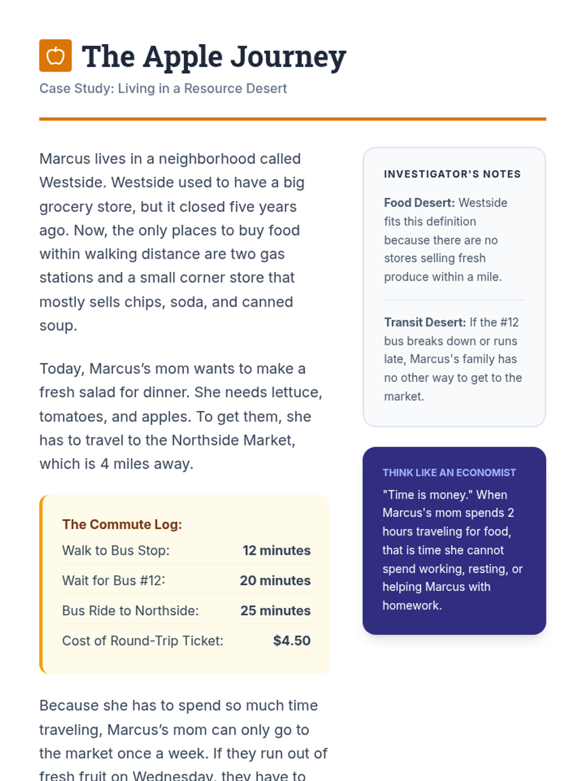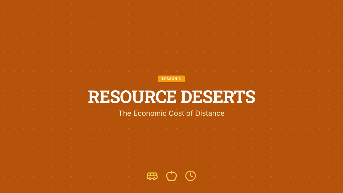 This sequence explores how geographic location and community resources impact economic opportunity. Students investigate public goods, map resource density in neighborhoods, analyze food and transit deserts, and evaluate the effects of school funding differences, culminating in a civic proposal for community equity.