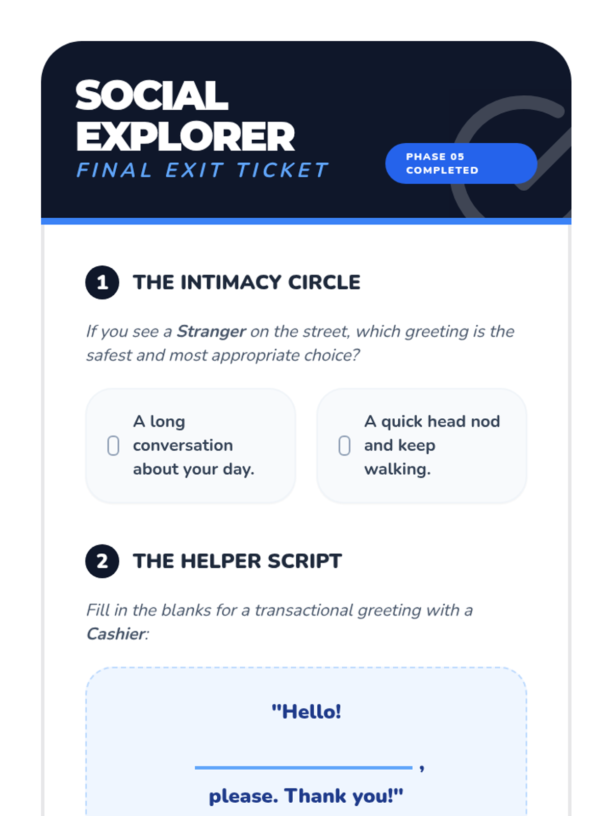 A sequence for 12th Grade Special Education students focused on navigating social boundaries and determining appropriate greetings based on relationship intimacy levels and safety. Students learn through the 'Circle of Relationships' model, practicing both non-verbal and verbal acknowledgments for various community scenarios.