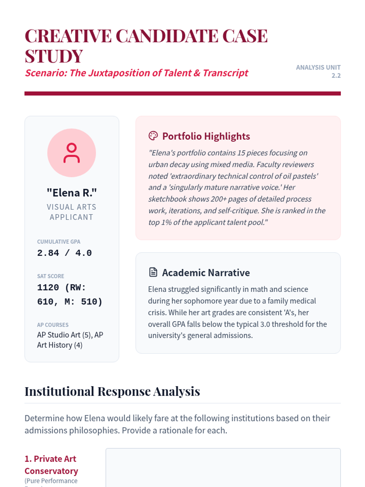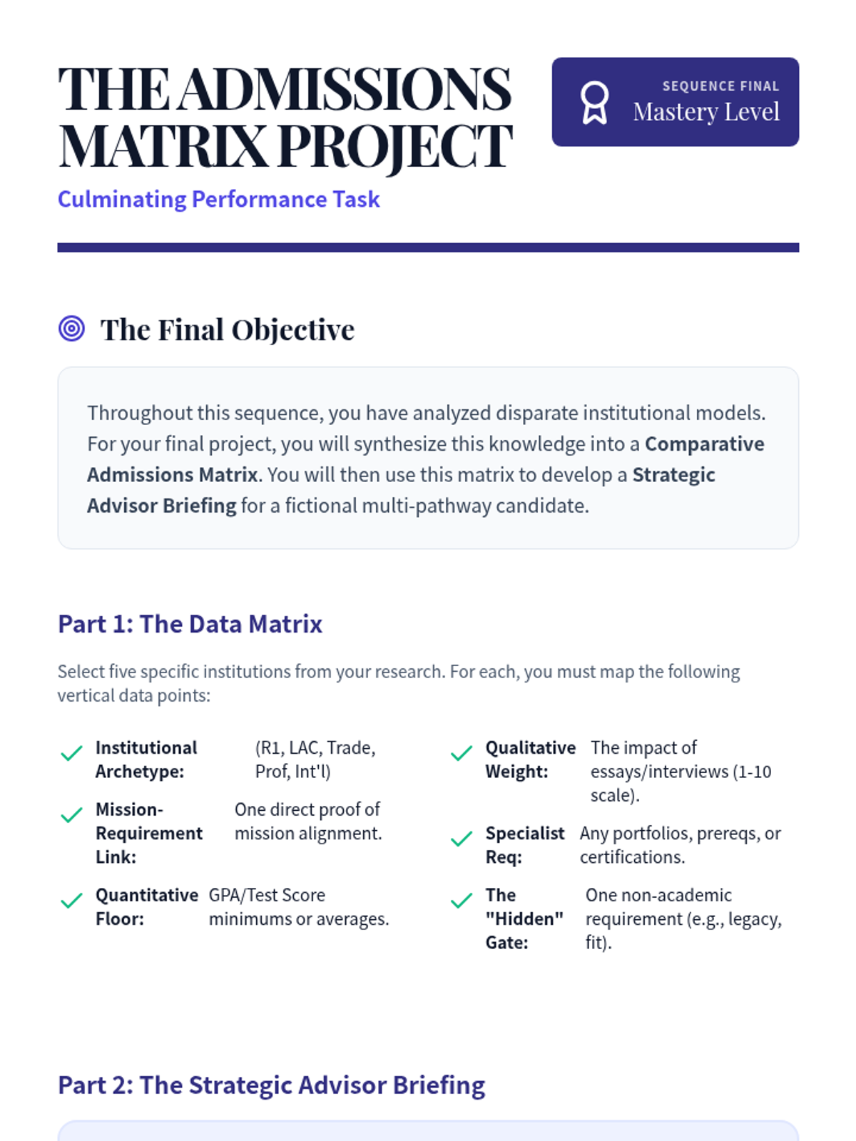 A comprehensive graduate-level sequence exploring the diverse landscape of post-secondary admission requirements across R1 universities, liberal arts colleges, vocational institutes, professional schools, and international systems. Students develop a comparative framework to understand how institutional missions shape admission protocols and cultural values.
