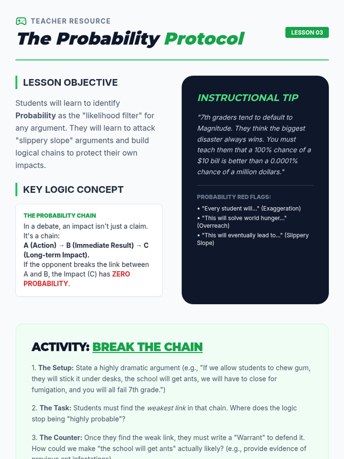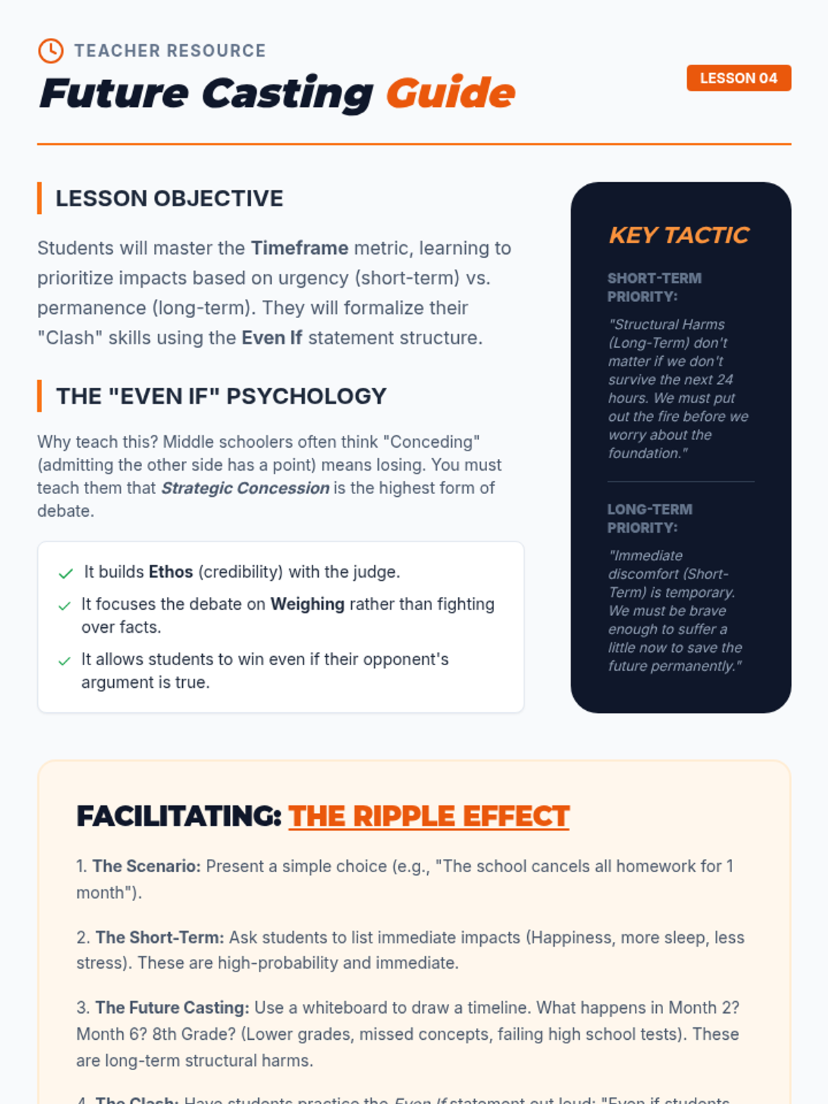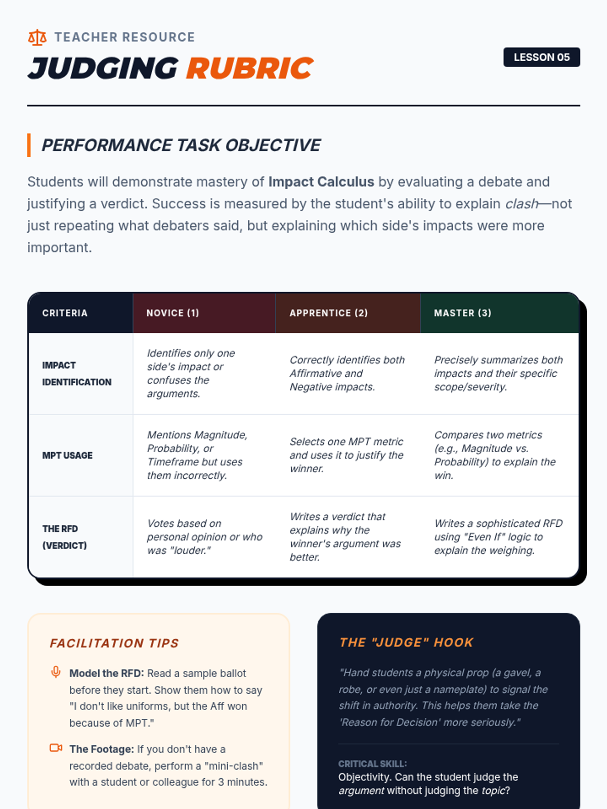 A 7th-grade ELA sequence on debate and public speaking, focusing on 'Impact Calculus' (Magnitude, Probability, and Timeframe) to weigh competing arguments and make comparative judgments.