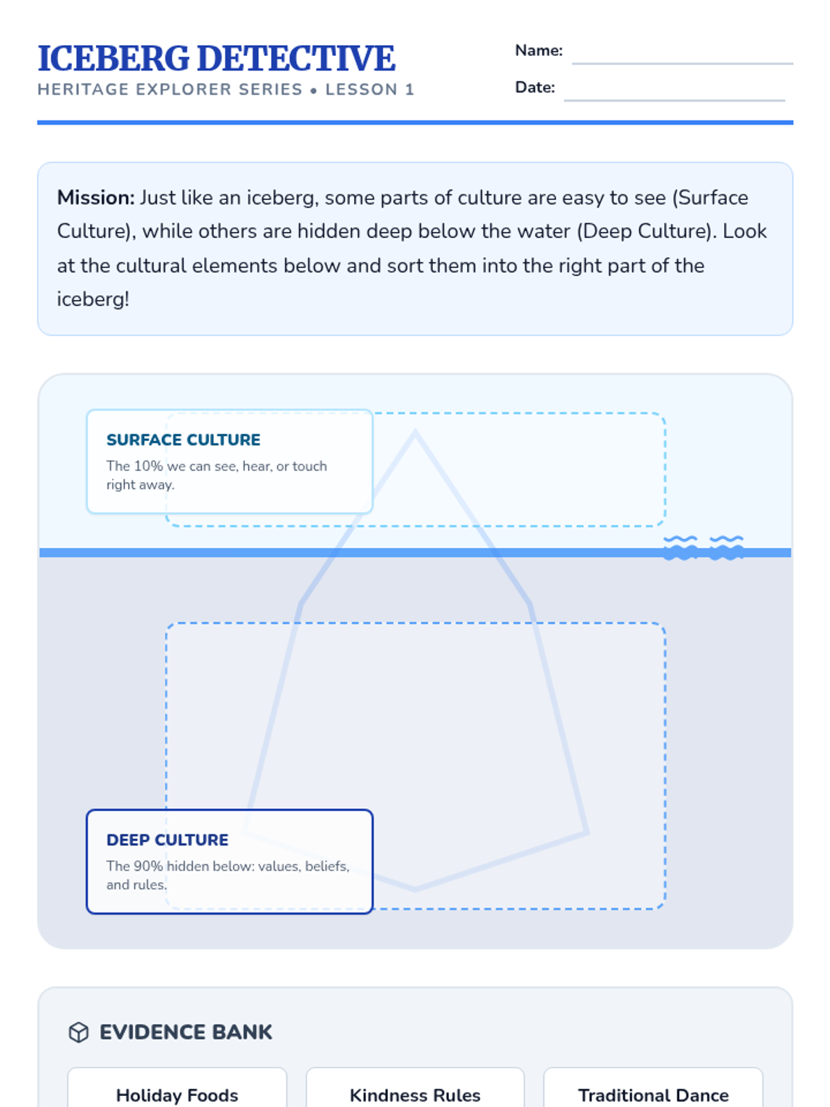 A project-based Social Studies sequence for 3rd graders exploring how culture, family, traditions, and language shape individual identity. Students act as 'Heritage Explorers,' culminating in a Culture Capsule museum exhibit.