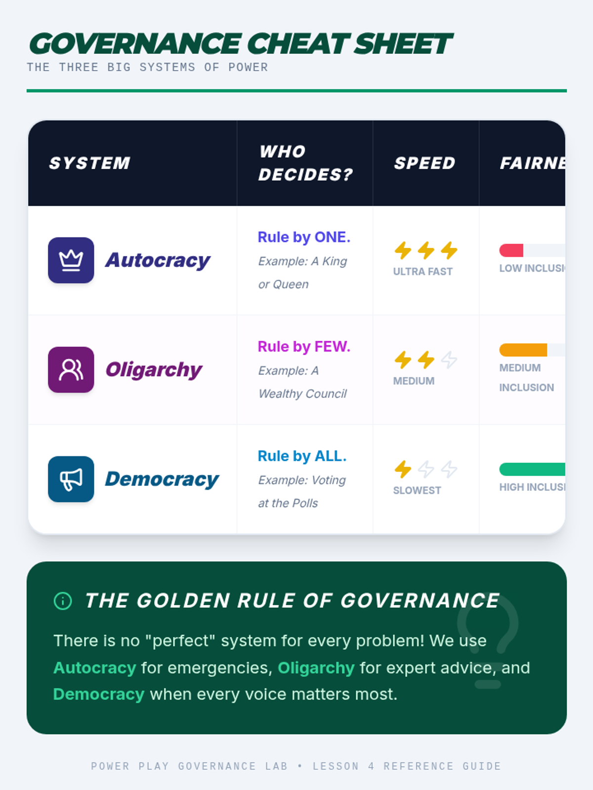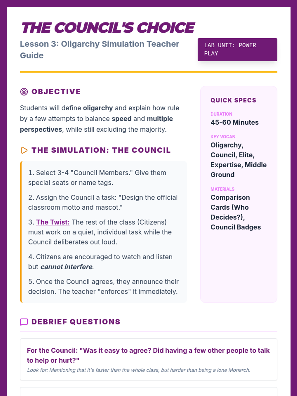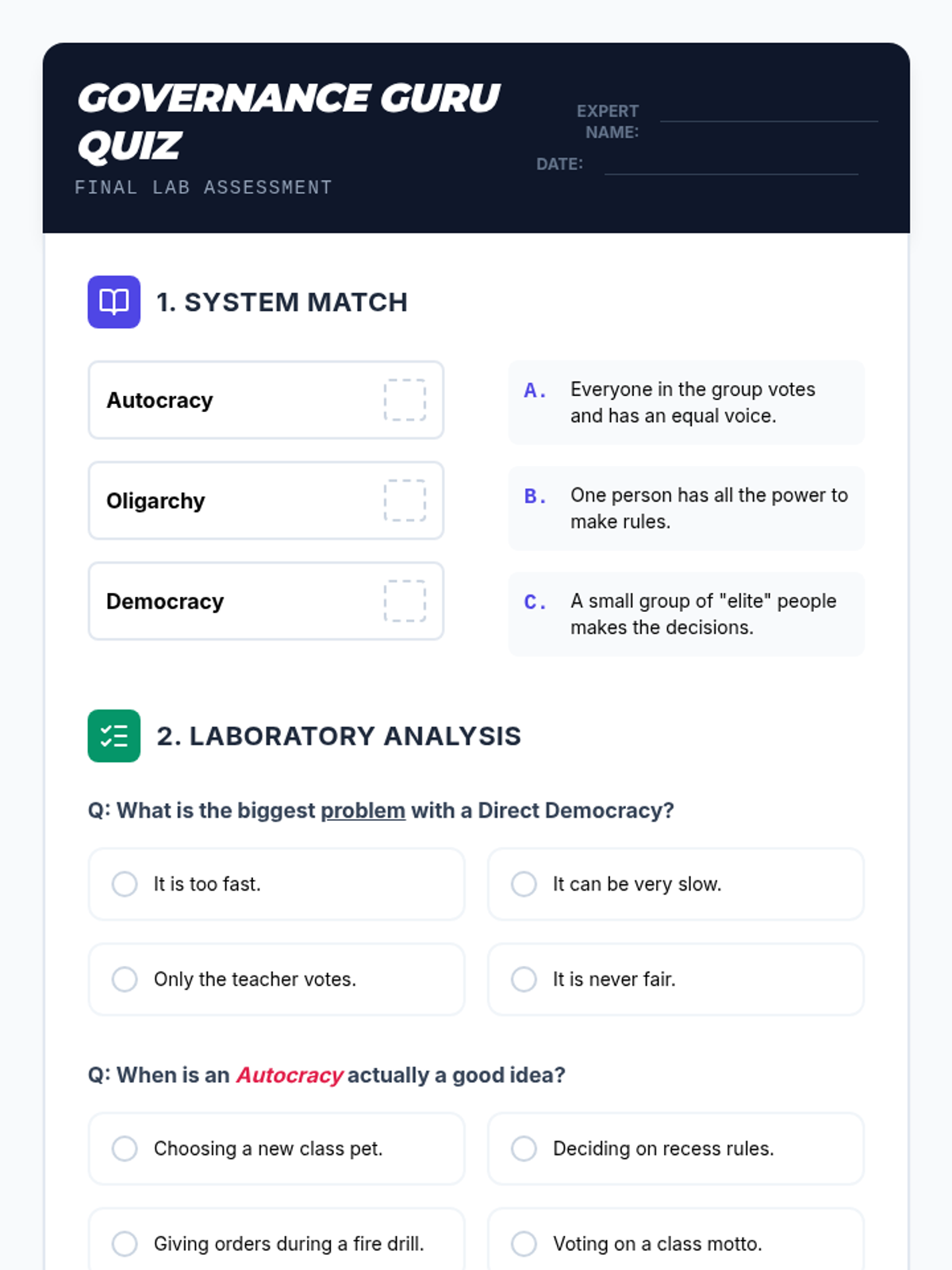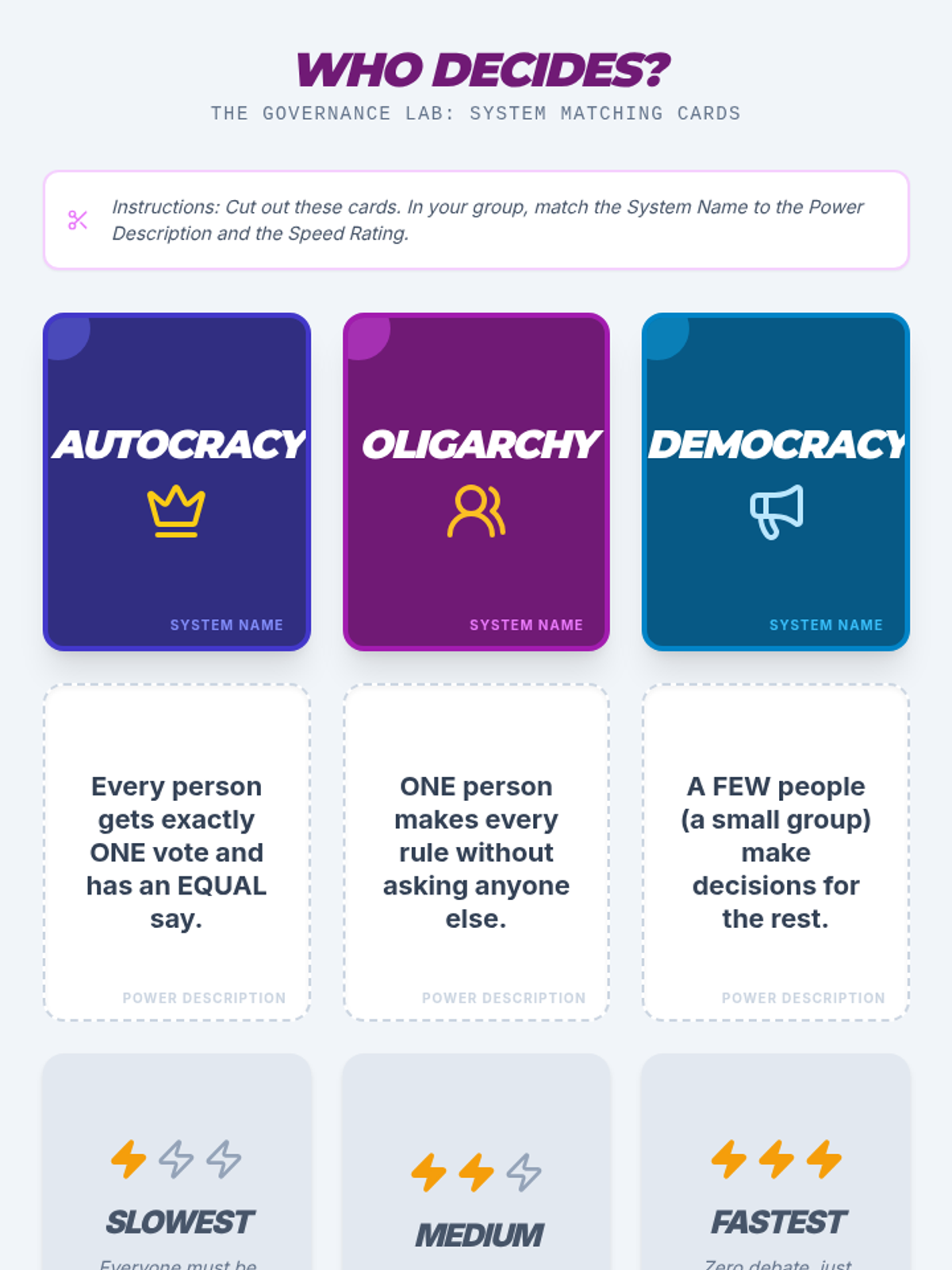 A 3rd Grade Social Studies unit exploring autocracy, oligarchy, and democracy through experiential simulations, helping students understand how decision-making structures impact community fairness and efficiency.