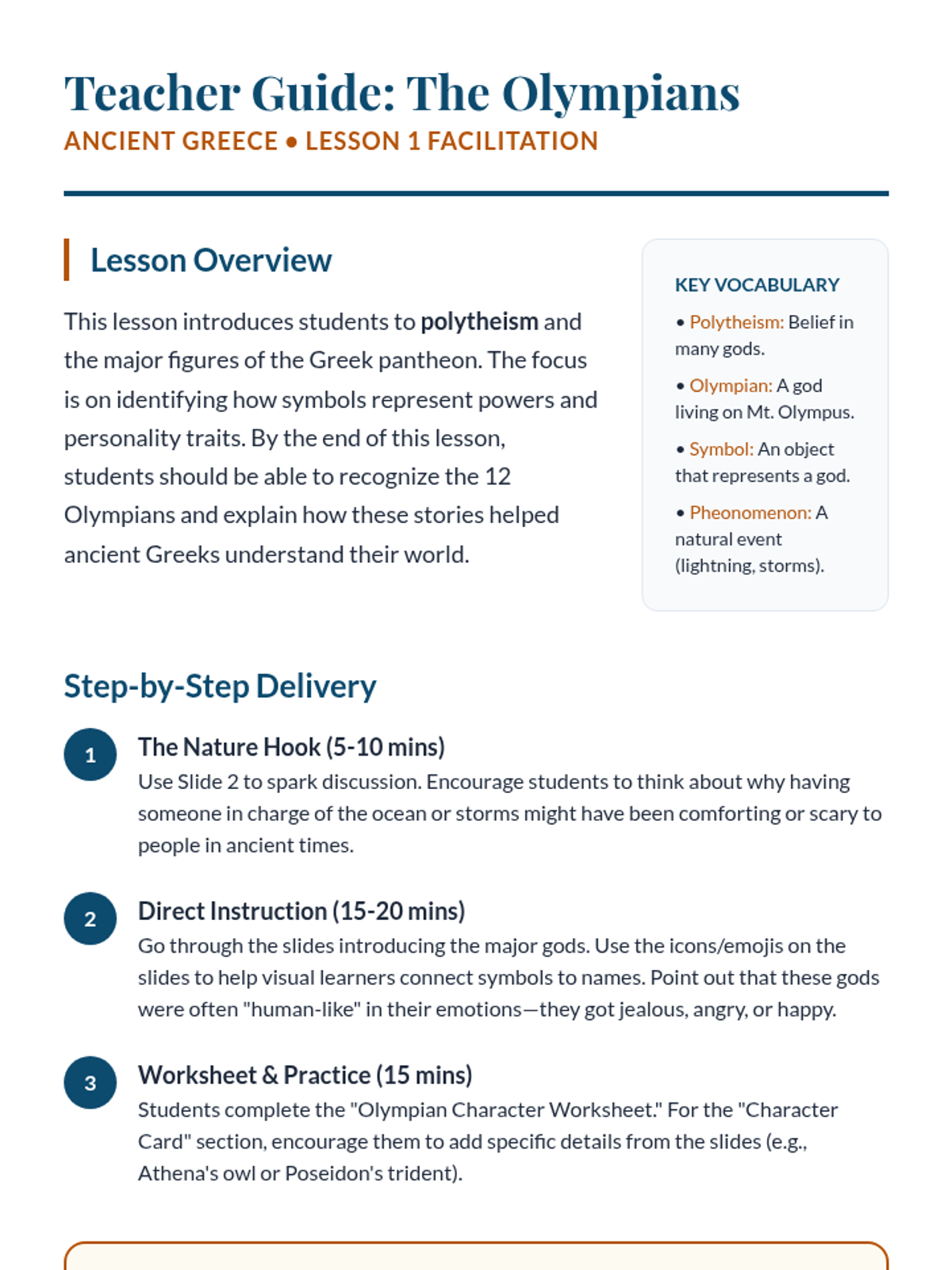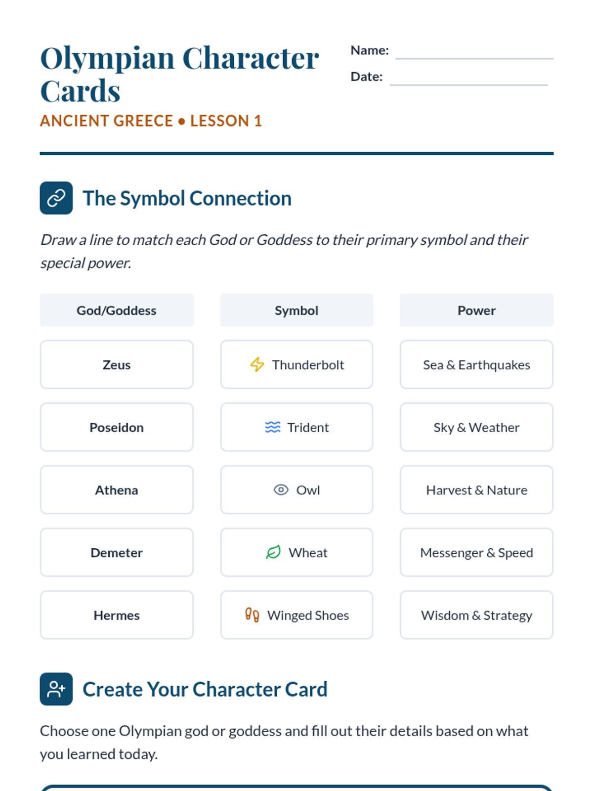 A comprehensive 5-lesson unit for 3rd grade students exploring Ancient Greek culture through the lens of mythology, fables, and art. Students learn how ancient people used stories to explain the world and establish moral values, culminating in the creation of their own original myths.