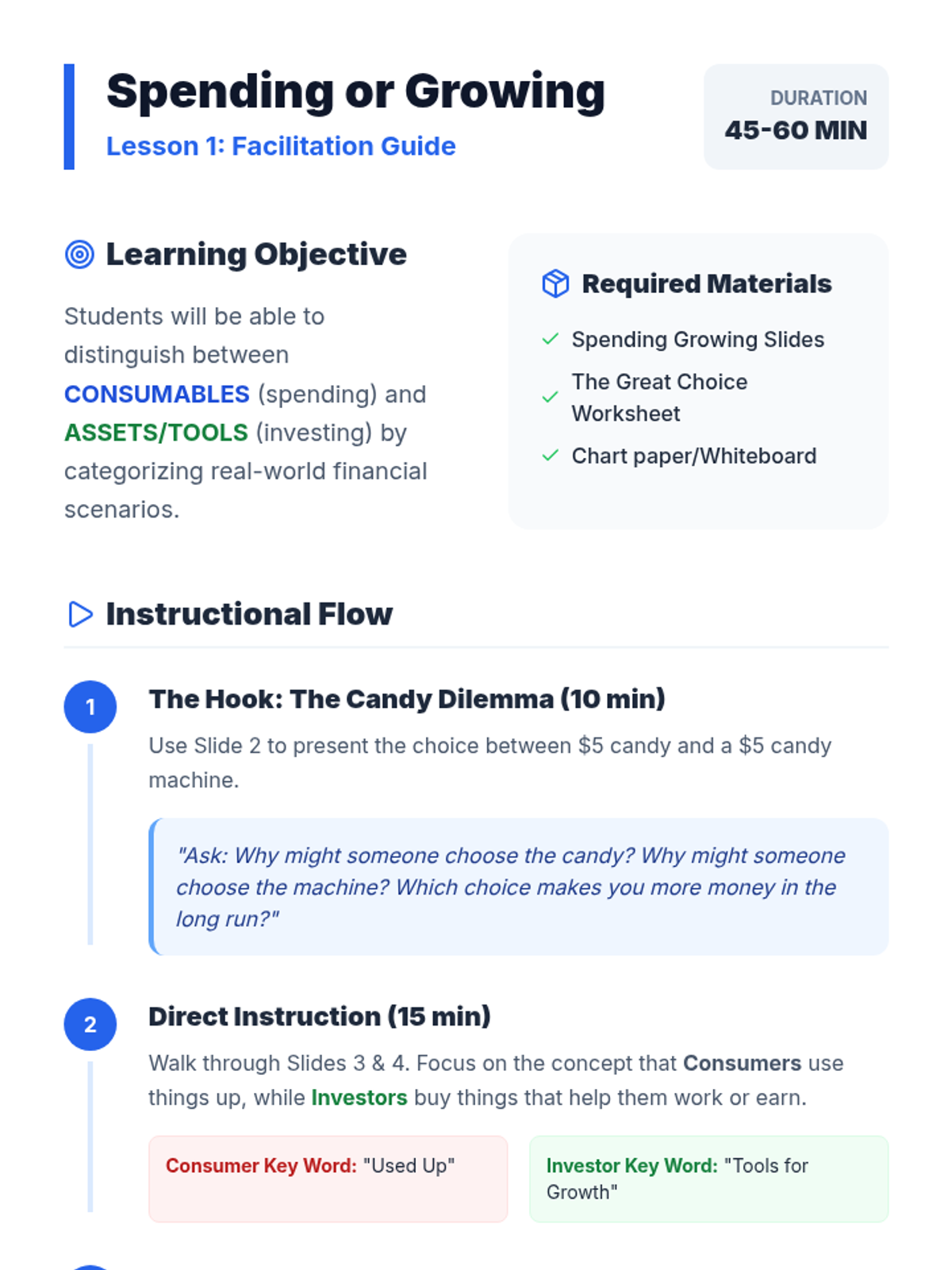 A 3rd-grade economics sequence that introduces students to investment, risk, resource allocation, and market principles through project-based learning. Students transition from being consumers to aspiring entrepreneurs who plan and pitch their own business investments.
