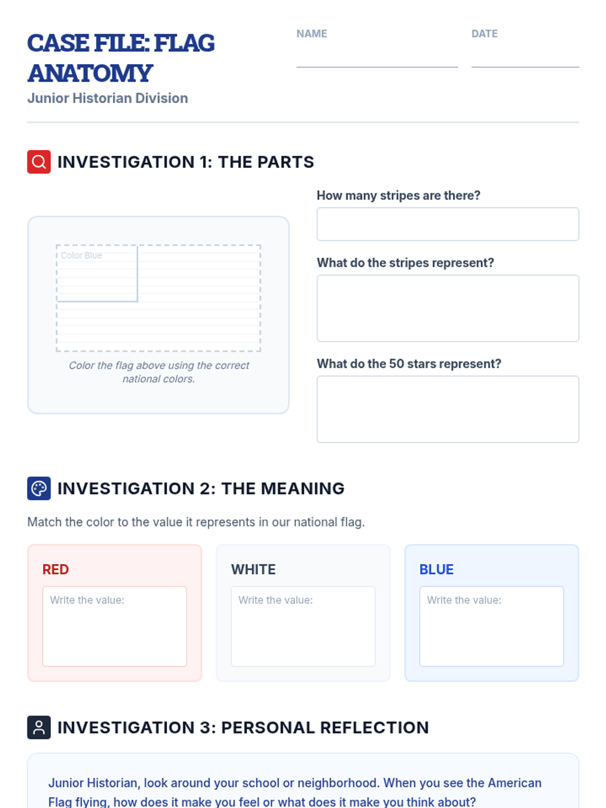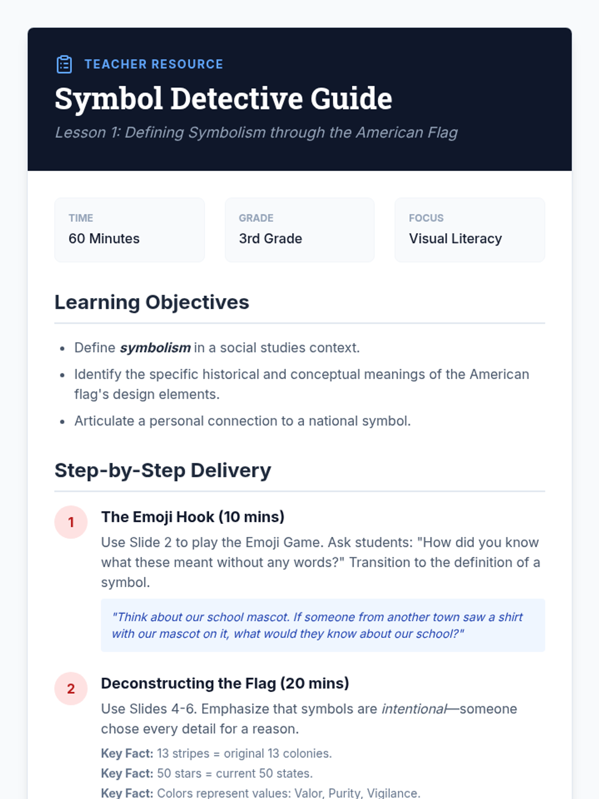 Students act as junior historians to investigate the origins and meanings behind the United States' most recognizable symbols and landmarks. They explore the American Flag, the Statue of Liberty, the Great Seal, and D.C. landmarks before creating their own museum exhibit.