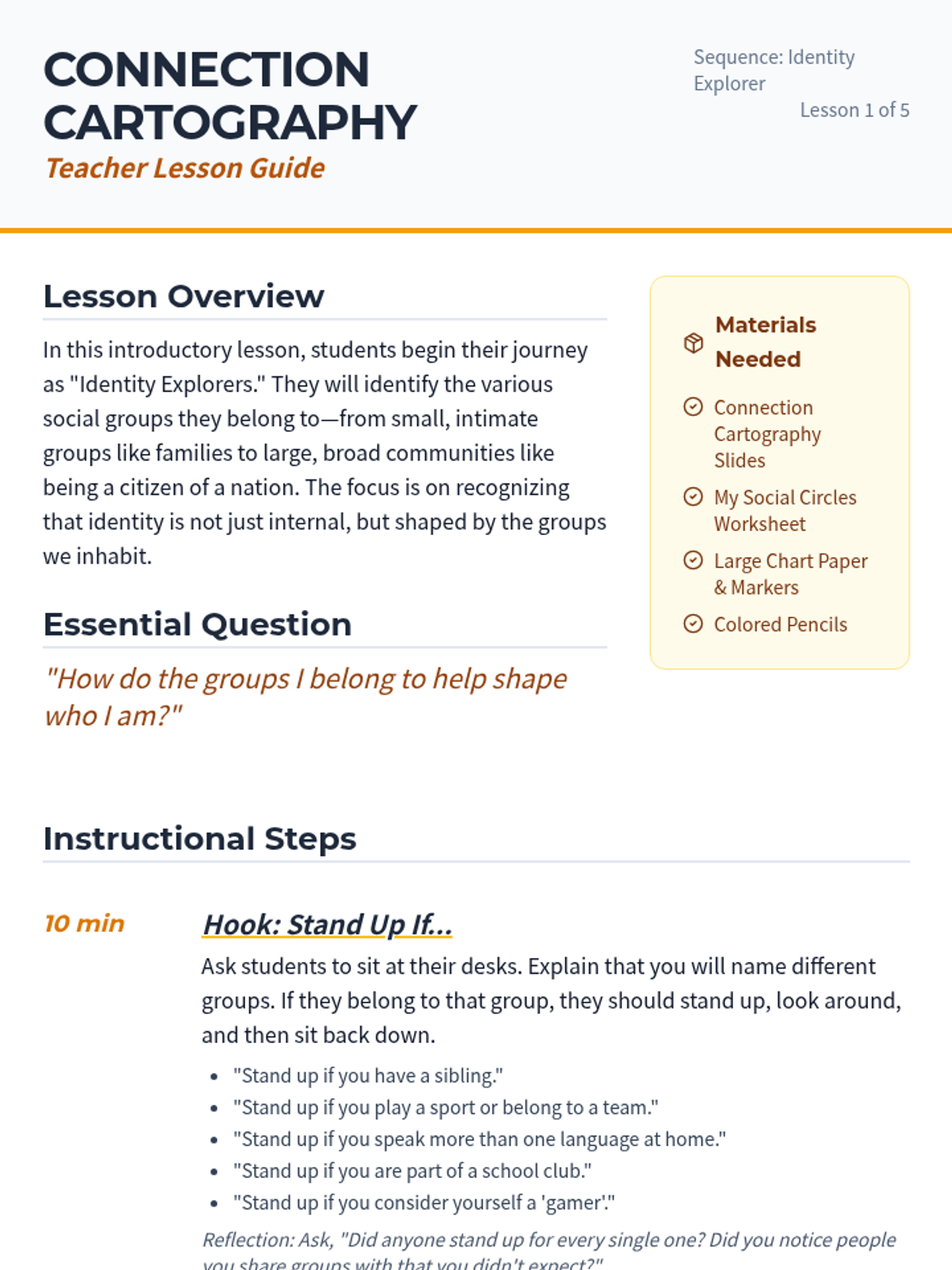 This project-based sequence explores how social groups and communities influence individual identity. Students investigate the various 'circles' they belong to—family, school, clubs, and cultural groups—and analyze how these memberships shape their values and behaviors. The learning journey culminates in the creation of a 'Social Identity Map' that visualizes their connections.