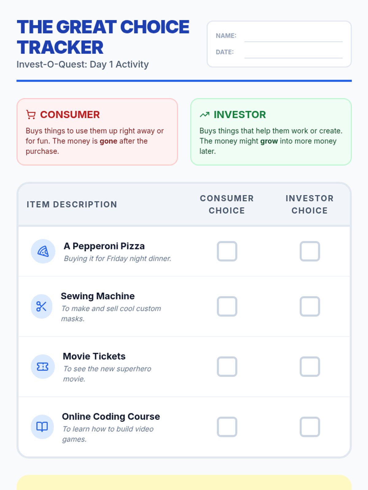 Students navigate a simulated classroom economy to learn budgeting, opportunity cost, and the difference between needs and wants through games and real-world scenarios.