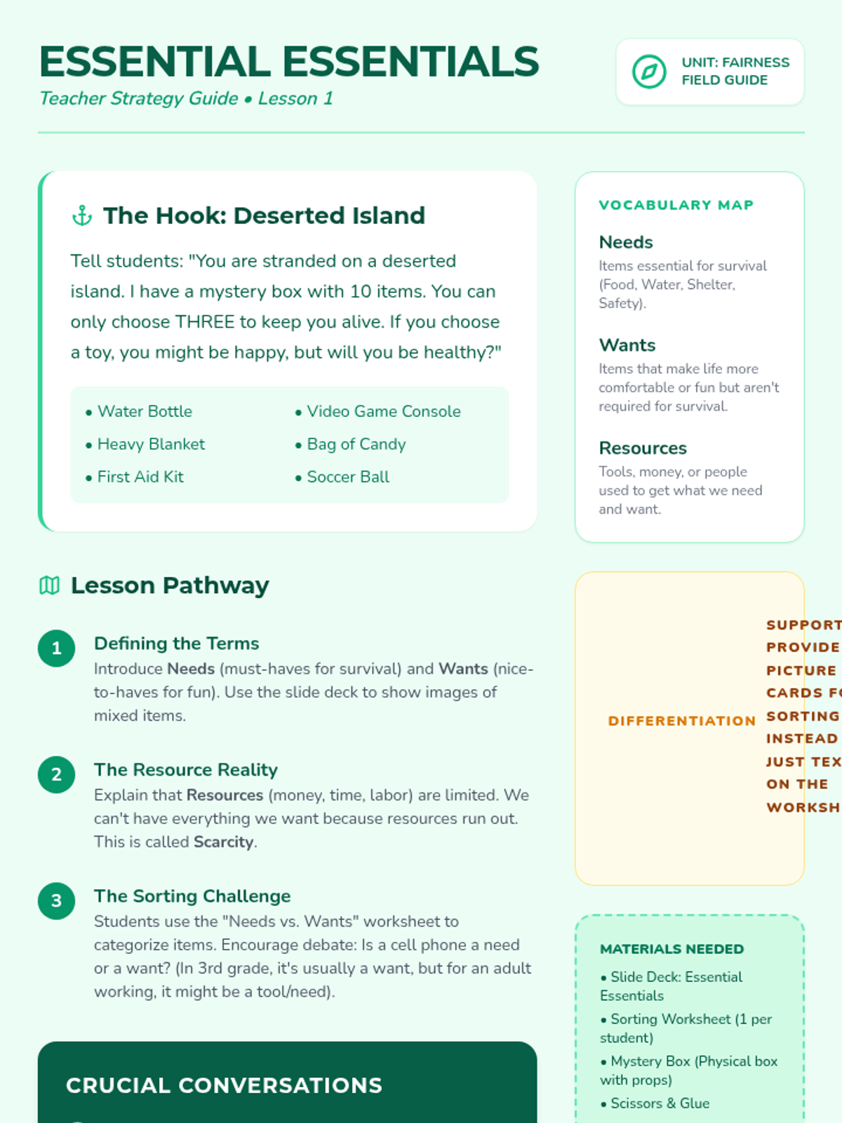 A 5-lesson Social Studies sequence for 3rd graders exploring the core concepts of needs vs. wants, resource distribution, and economic inequality through interactive simulations and community-focused problem-solving.