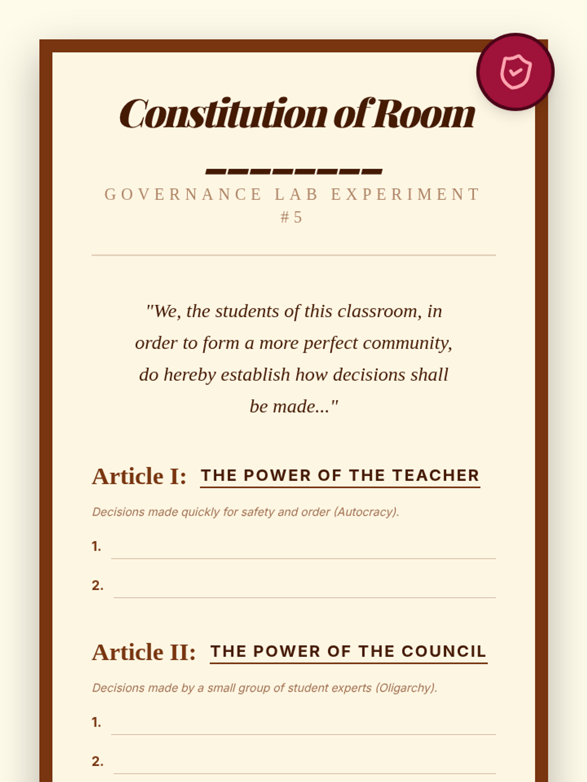 Students explore the concept of constitutional frameworks by drafting a 'Classroom Constitution.' They learn how written rules prevent confusion, define rights and responsibilities, and limit the power of leaders, culminating in a formal ratification ceremony.