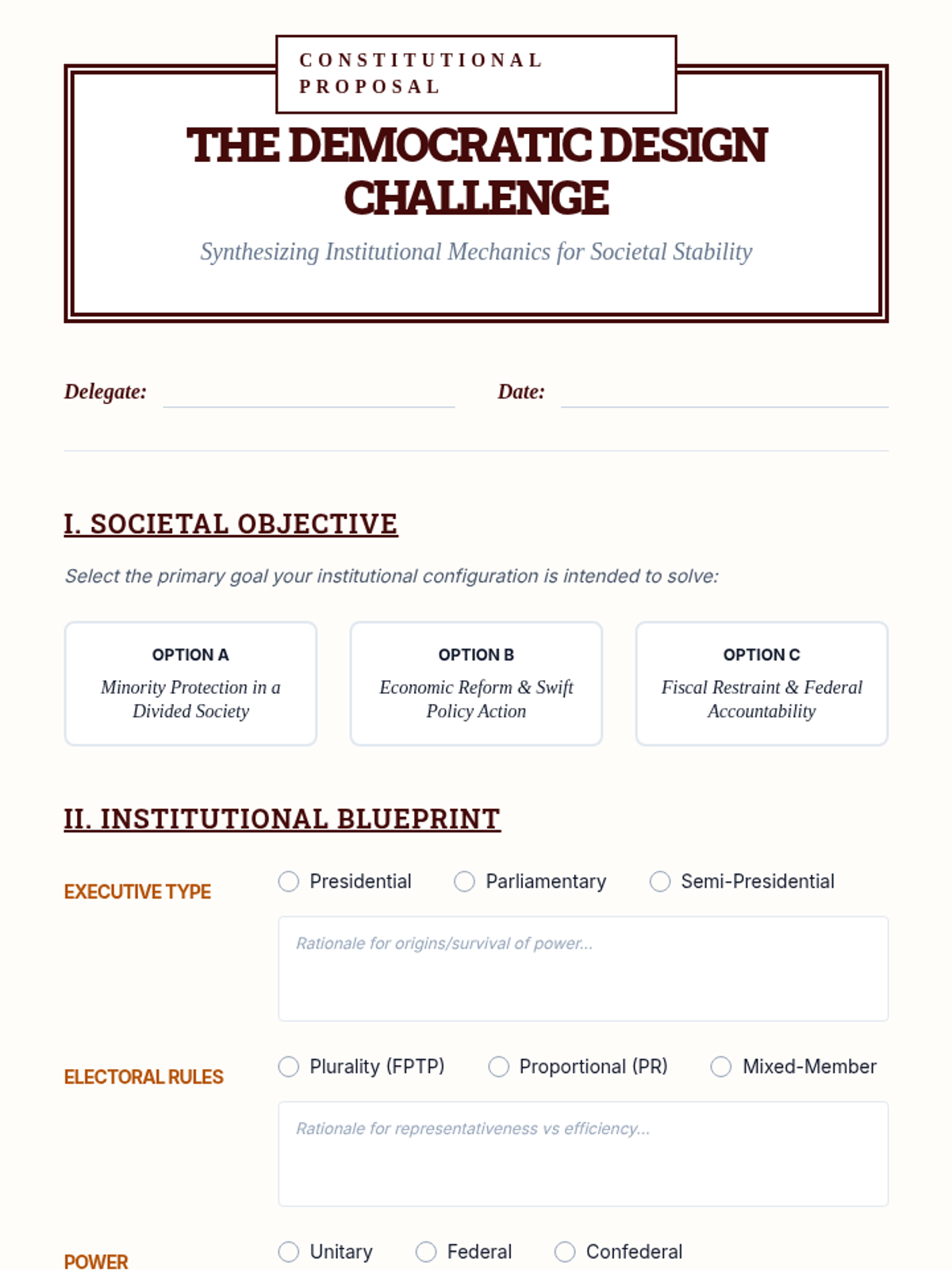 An undergraduate-level exploration of the institutional mechanics of democracy, comparing executive-legislative relations, electoral systems, and power distributions. Students analyze how structural choices impact political stability, representation, and policy outcomes.