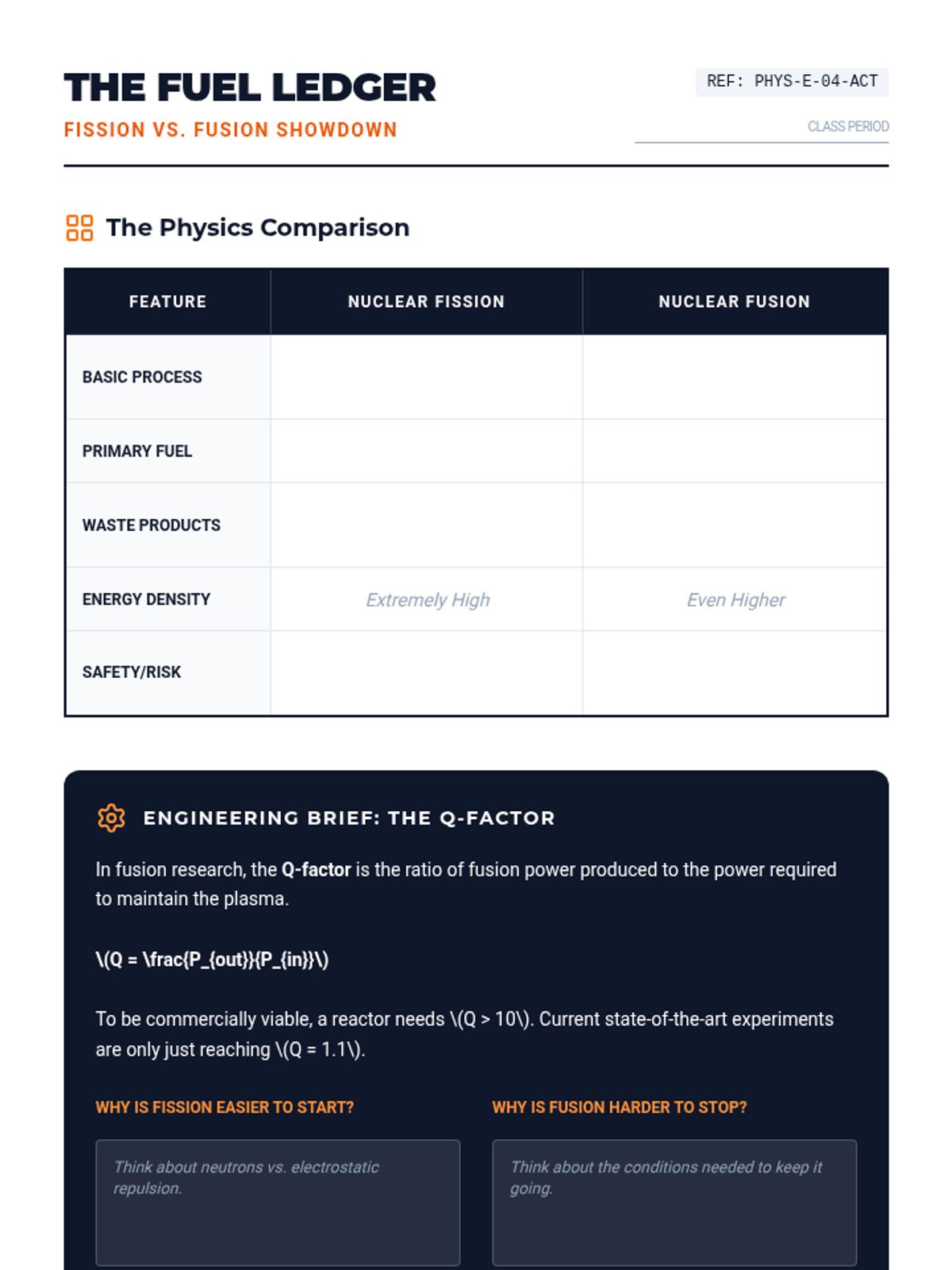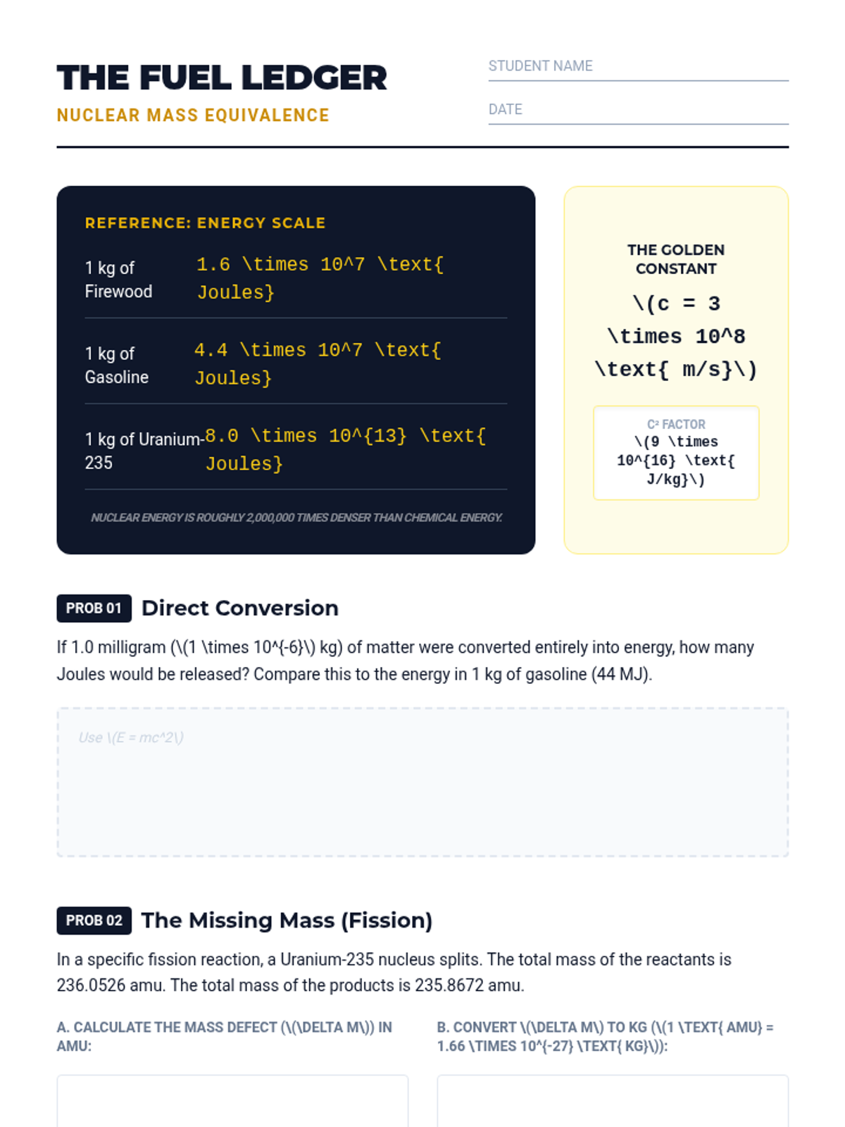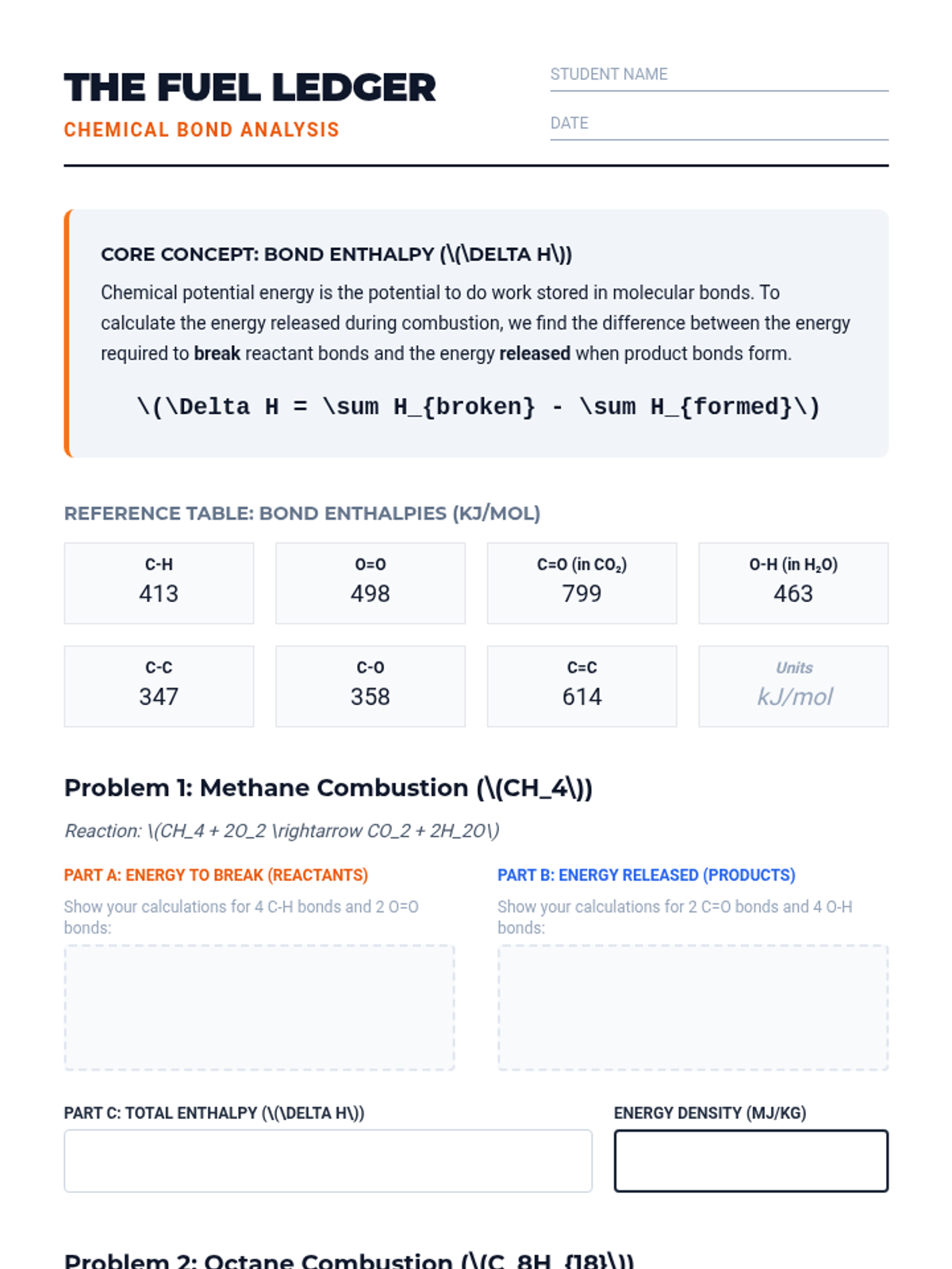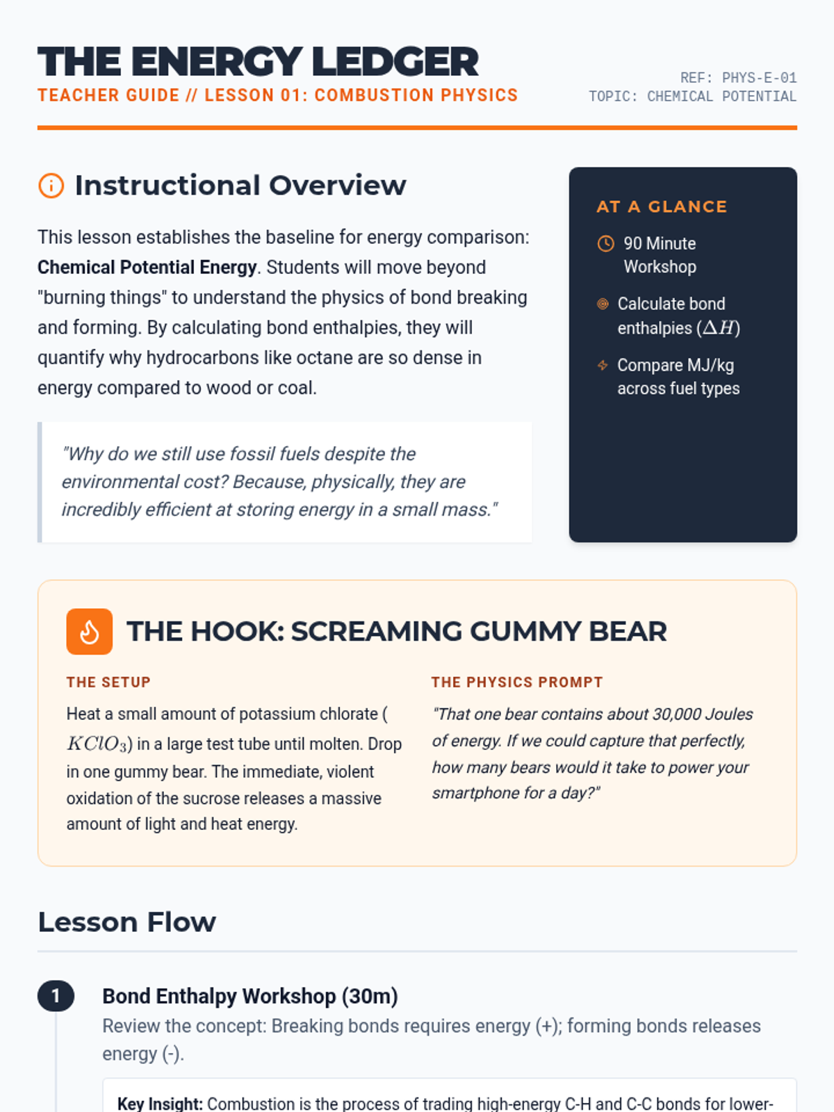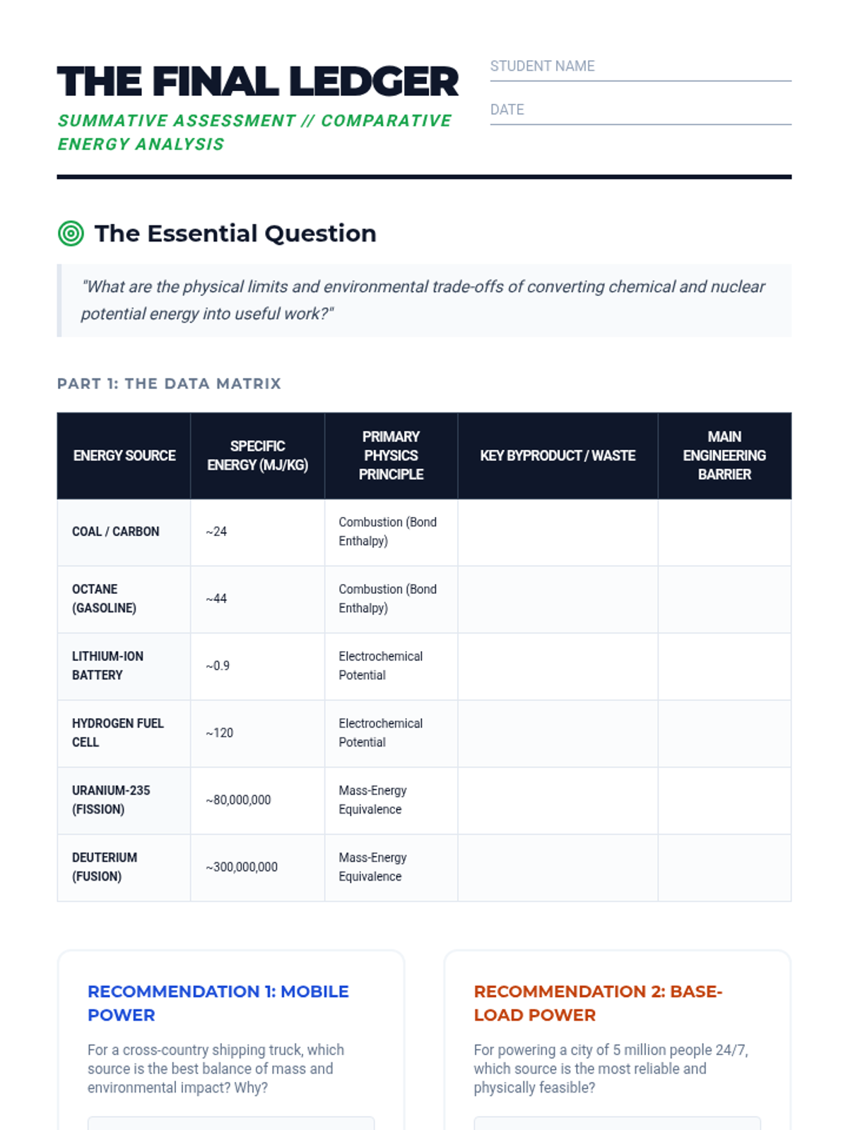 A comprehensive 11th-grade physics sequence comparing chemical and nuclear energy sources. Students analyze energy density, bond enthalpies, mass-energy equivalence, and lifecycle impacts to evaluate the future of global energy production.