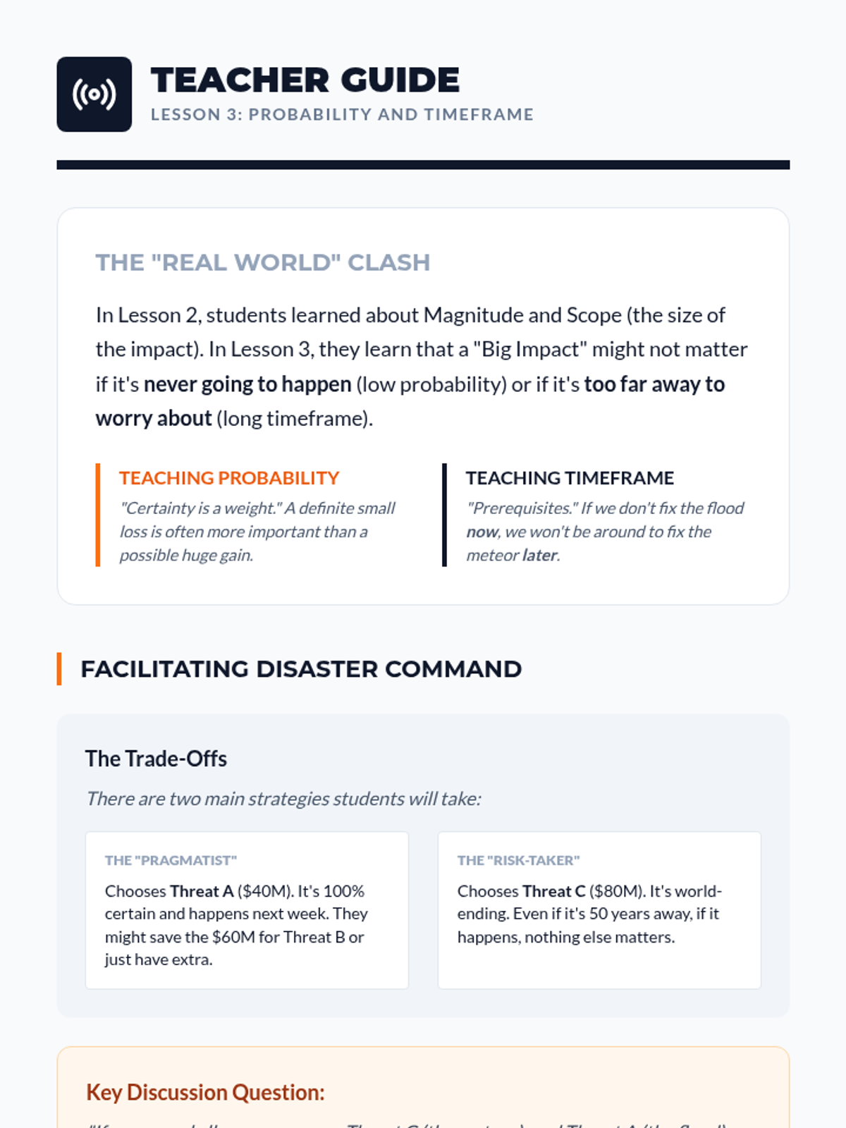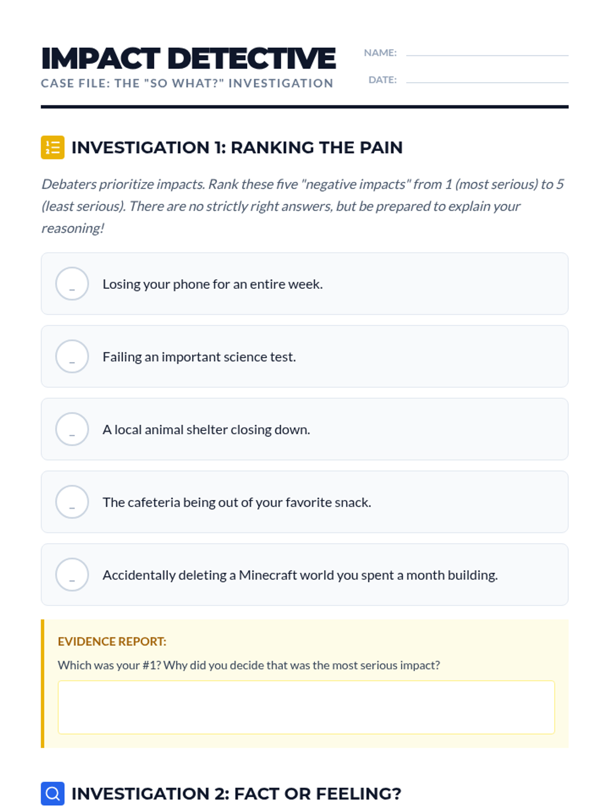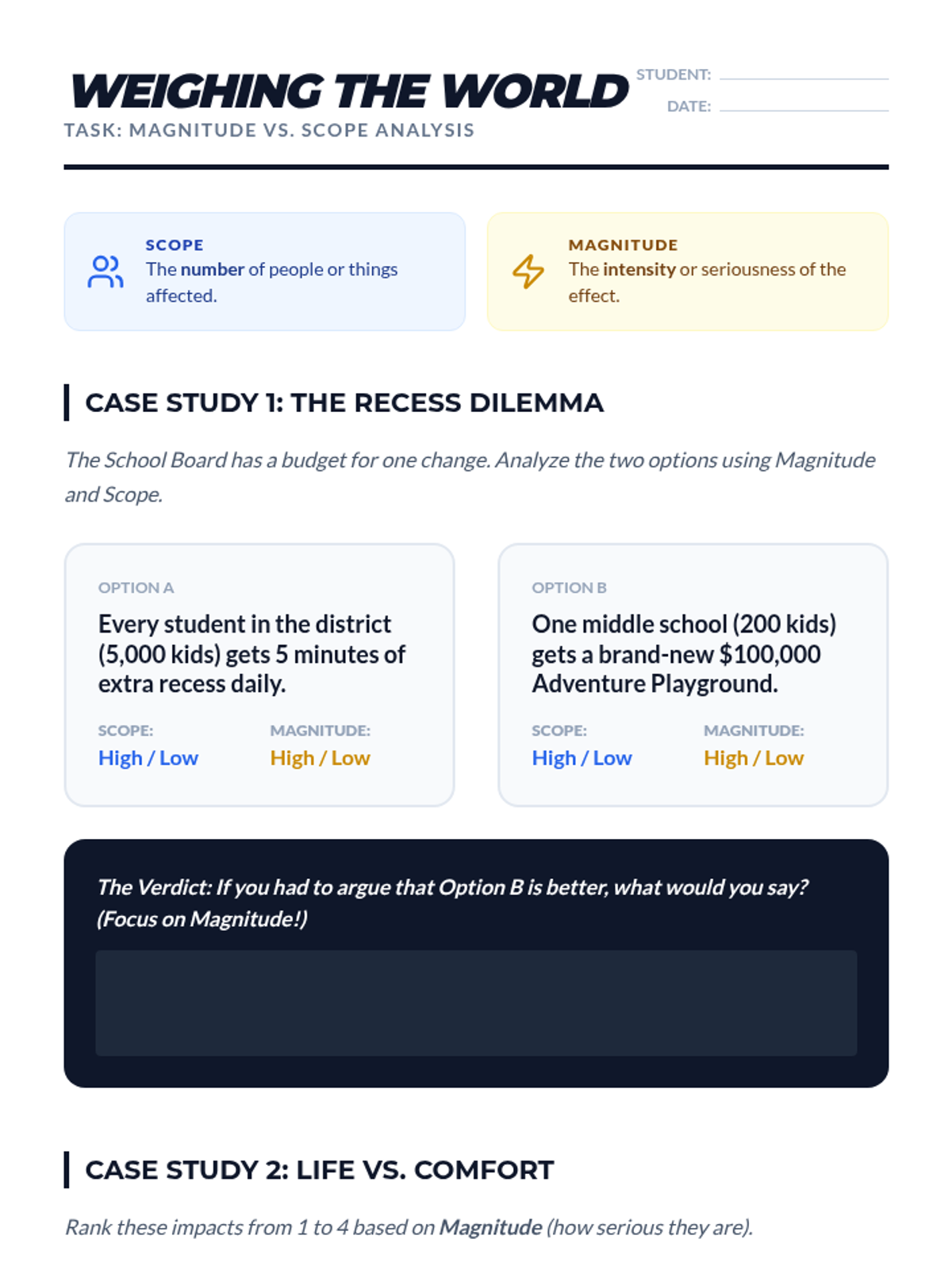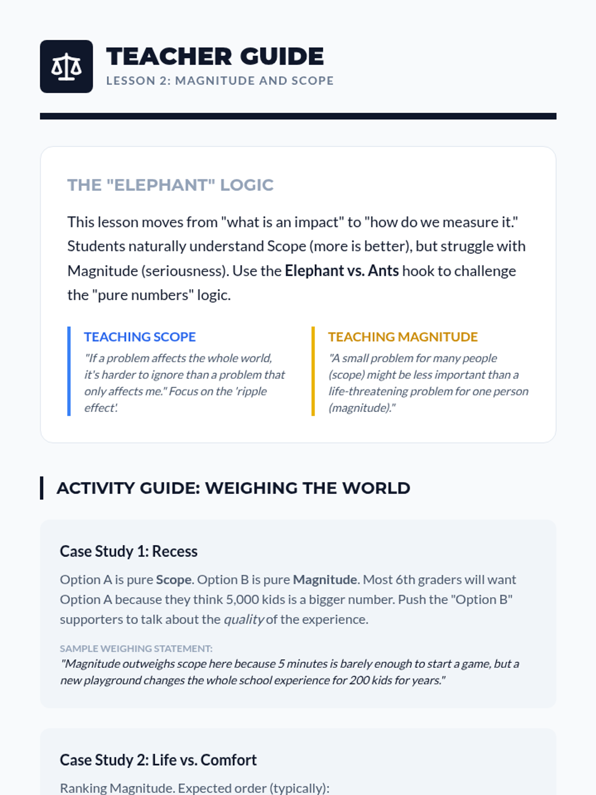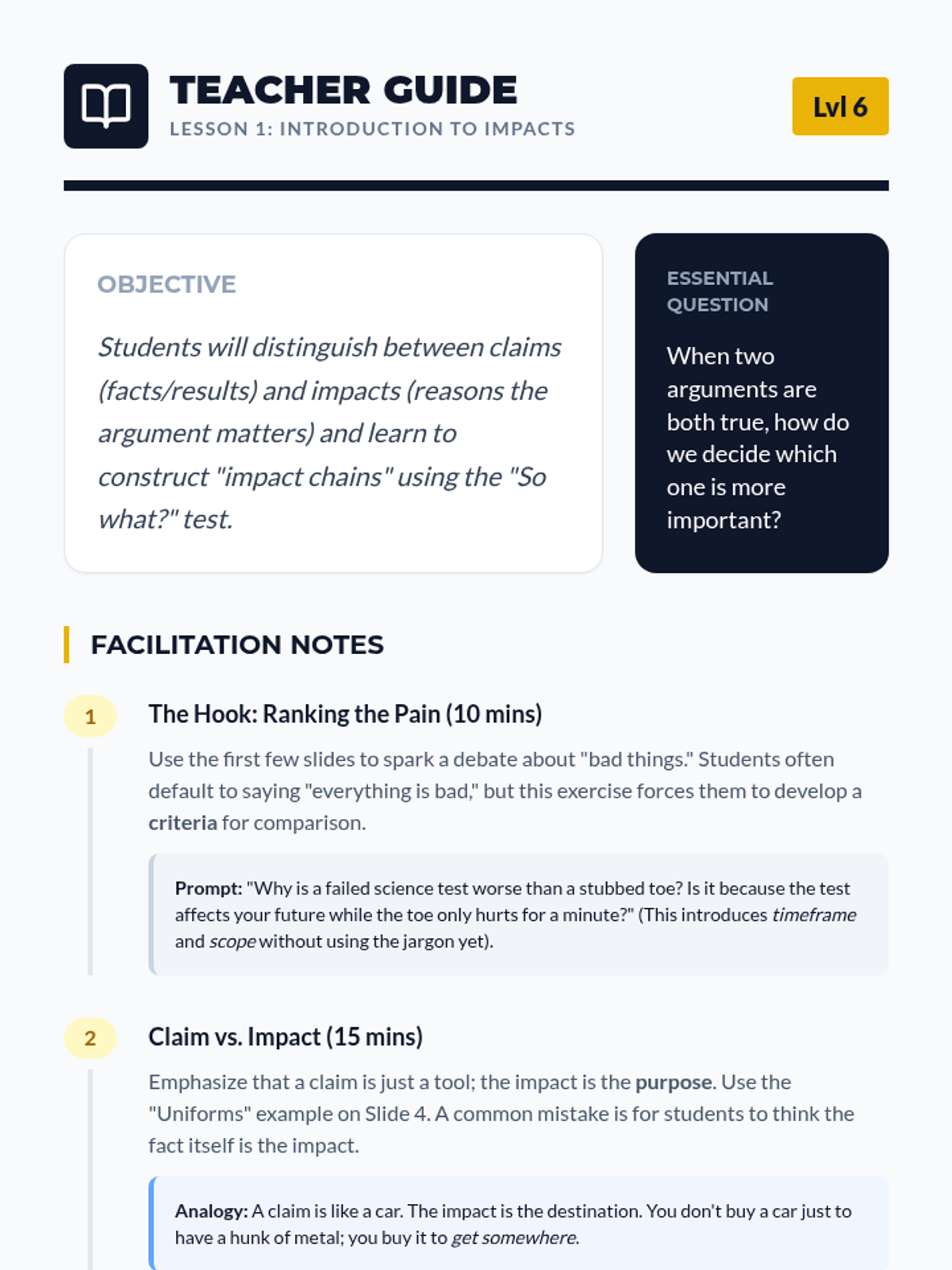 This sequence teaches 6th-grade students the fundamentals of Impact Calculus in debate. Students move from distinguishing claims from impacts to using the metrics of Magnitude, Scope, Probability, and Timeframe to weigh competing arguments and write persuasive comparative statements.