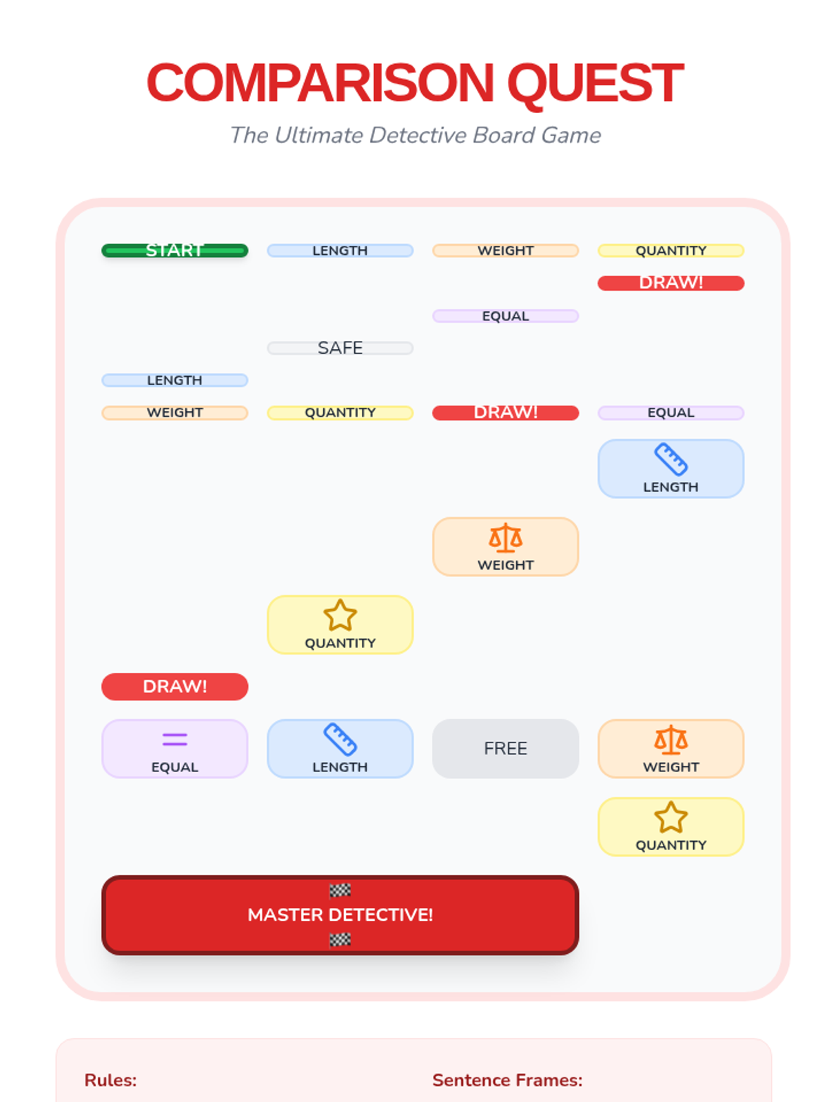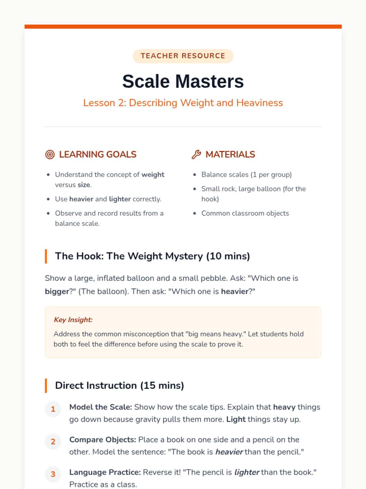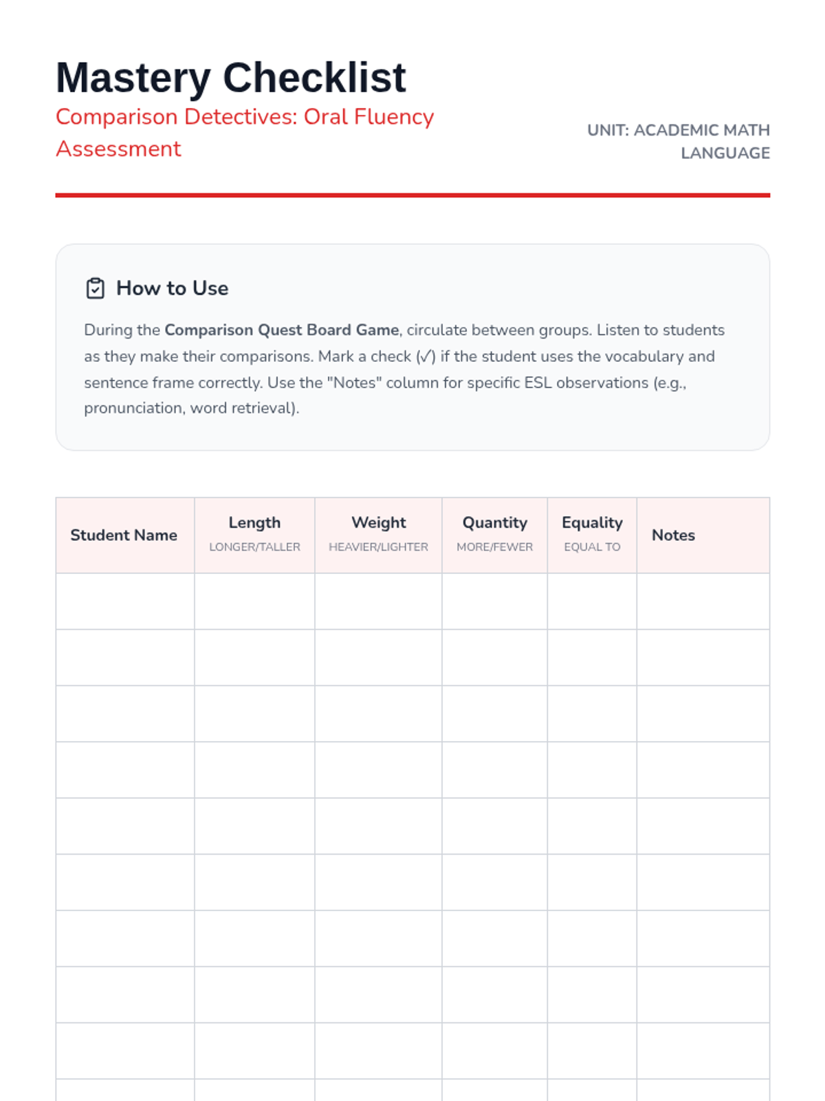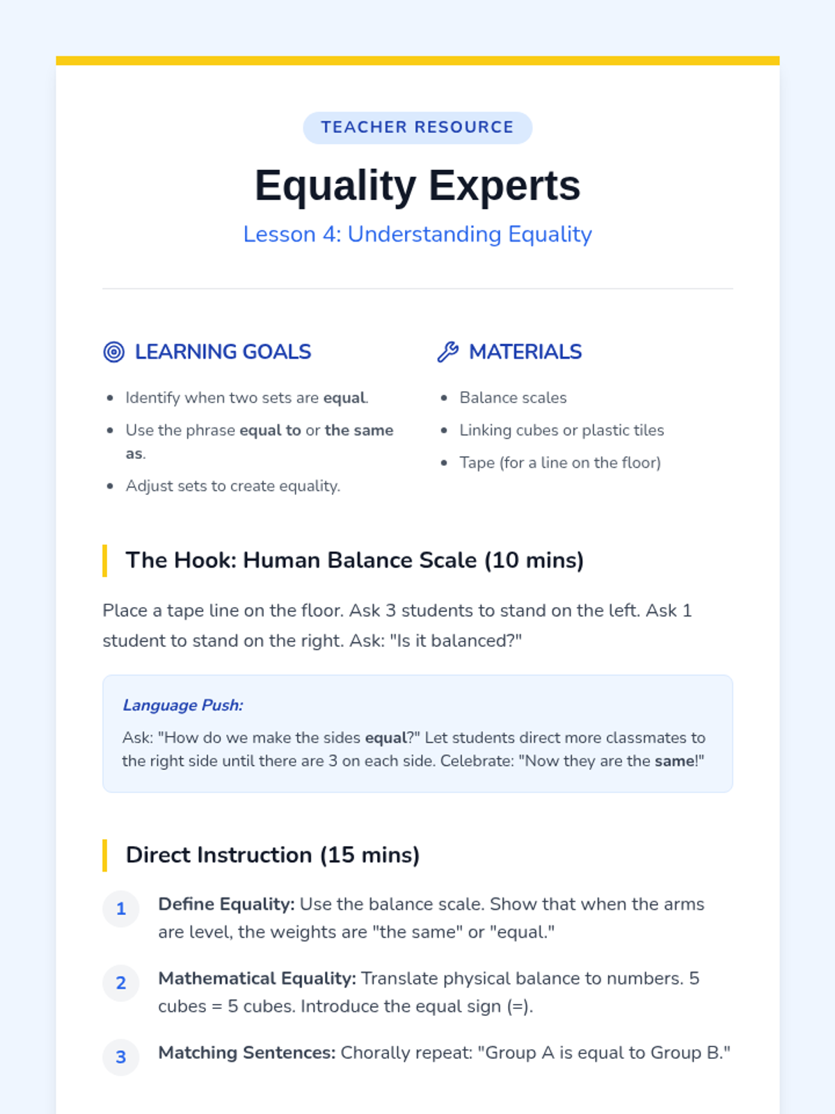 A first-grade ESL sequence focusing on academic language for mathematical comparisons. Students progress from physical attributes like length and weight to abstract concepts of quantity and equality, using structured sentence frames and hands-on activities.