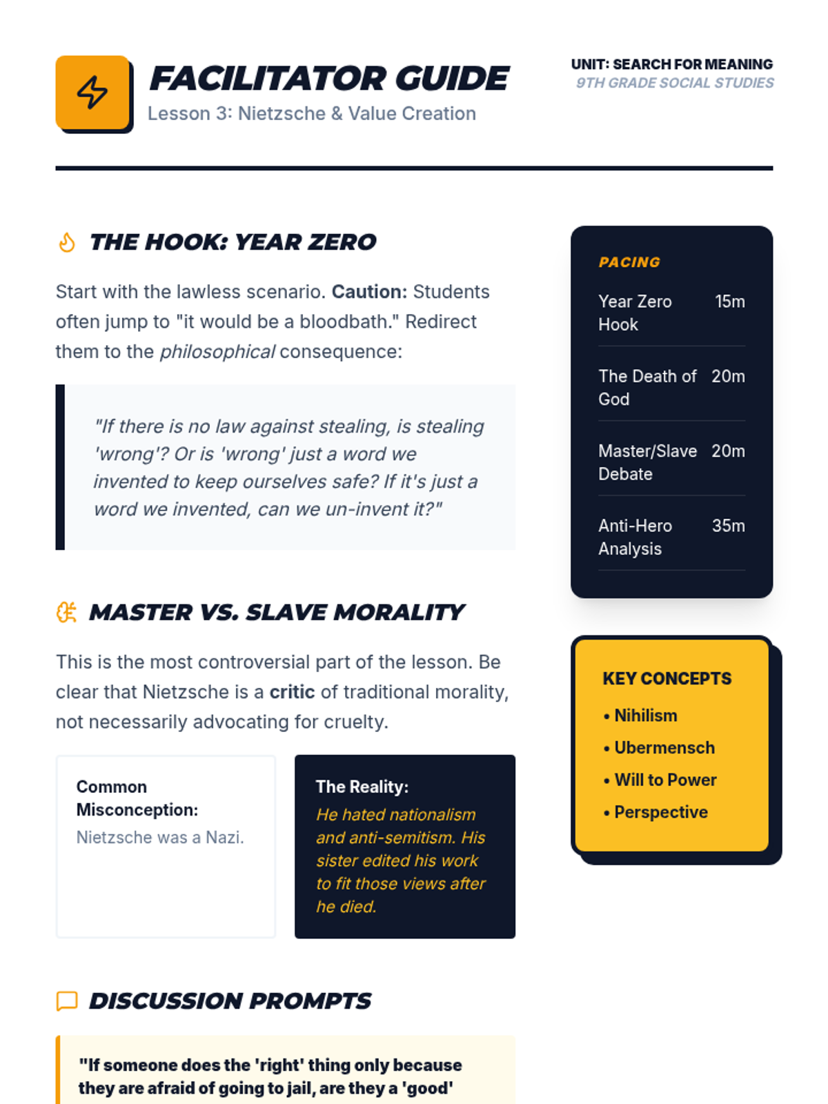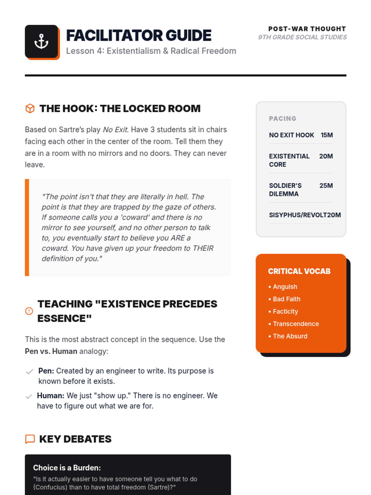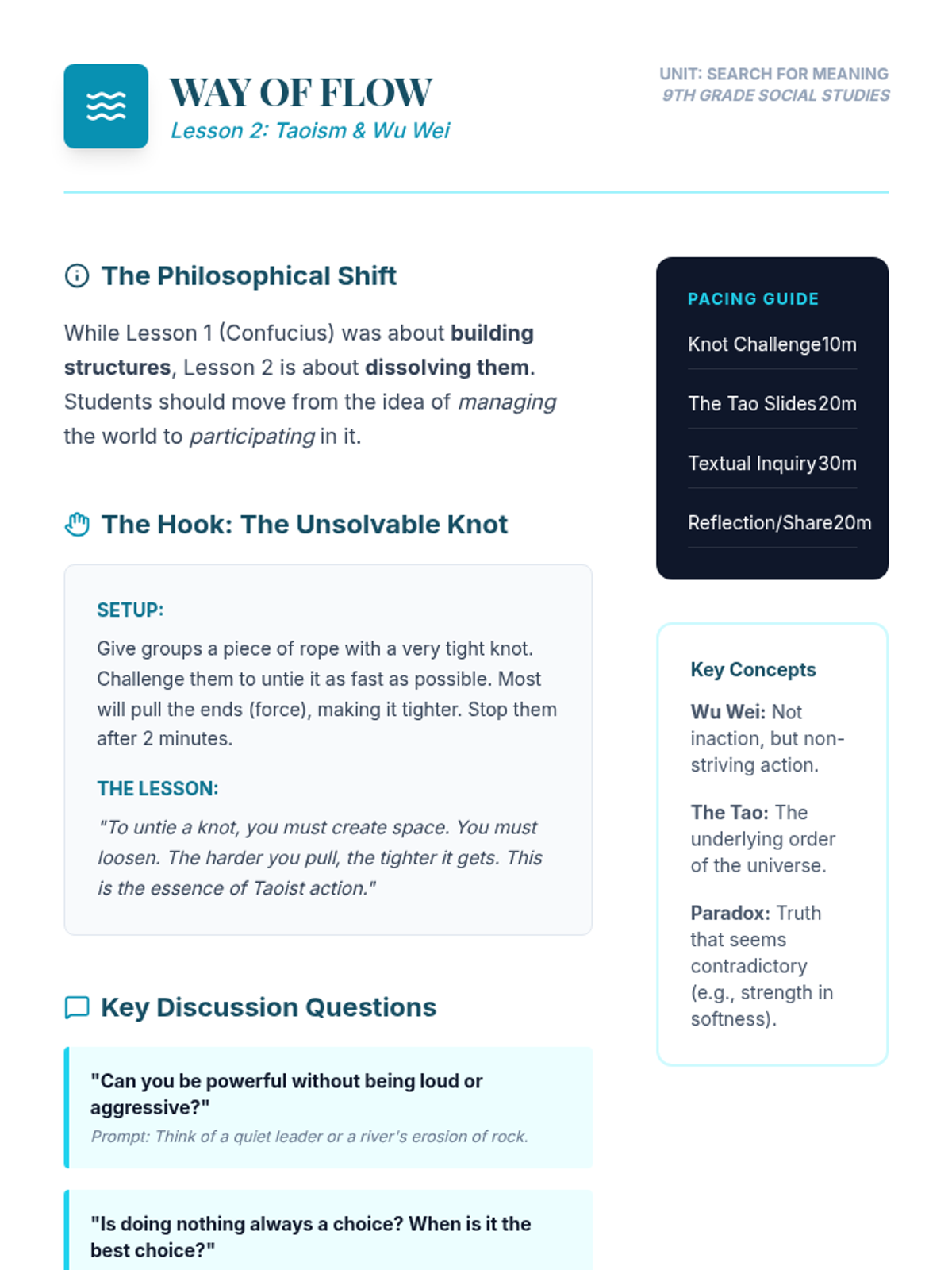 A 9th-grade Social Studies sequence exploring Eastern traditions and Western Existentialism to investigate whether meaning is discovered or created. Students progress from external systems of social order to internal constructions of individual freedom.