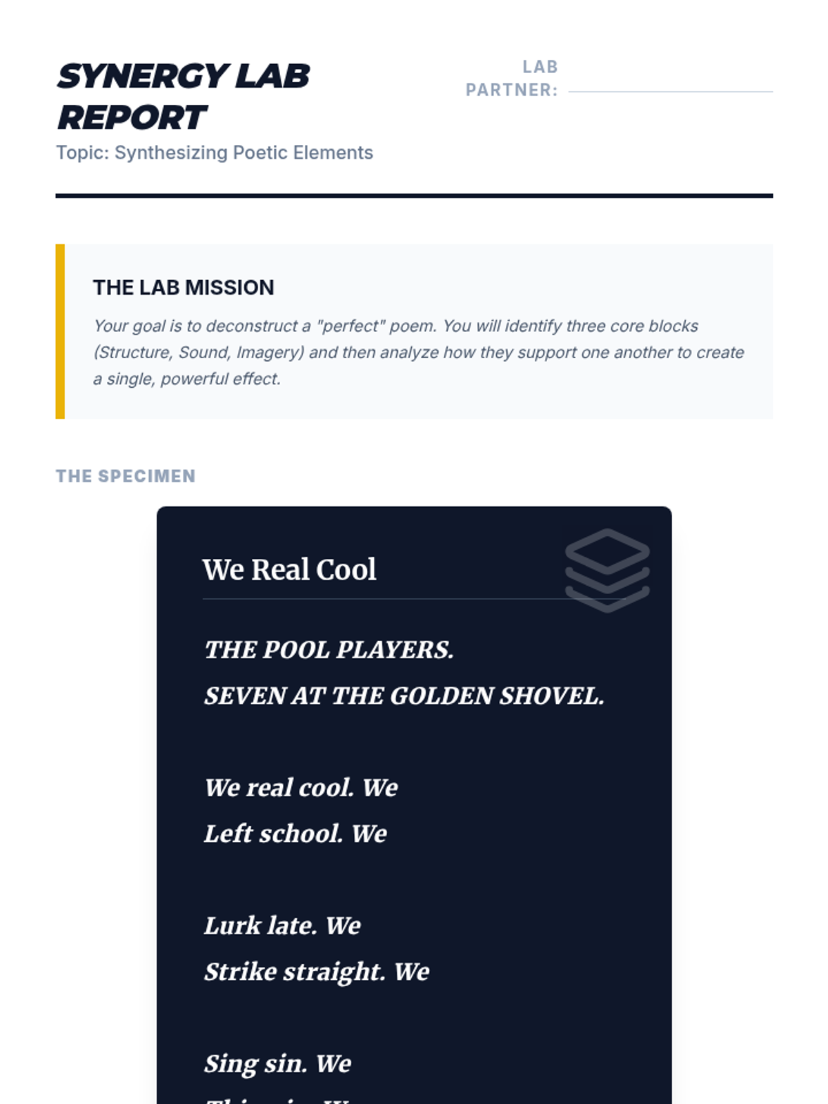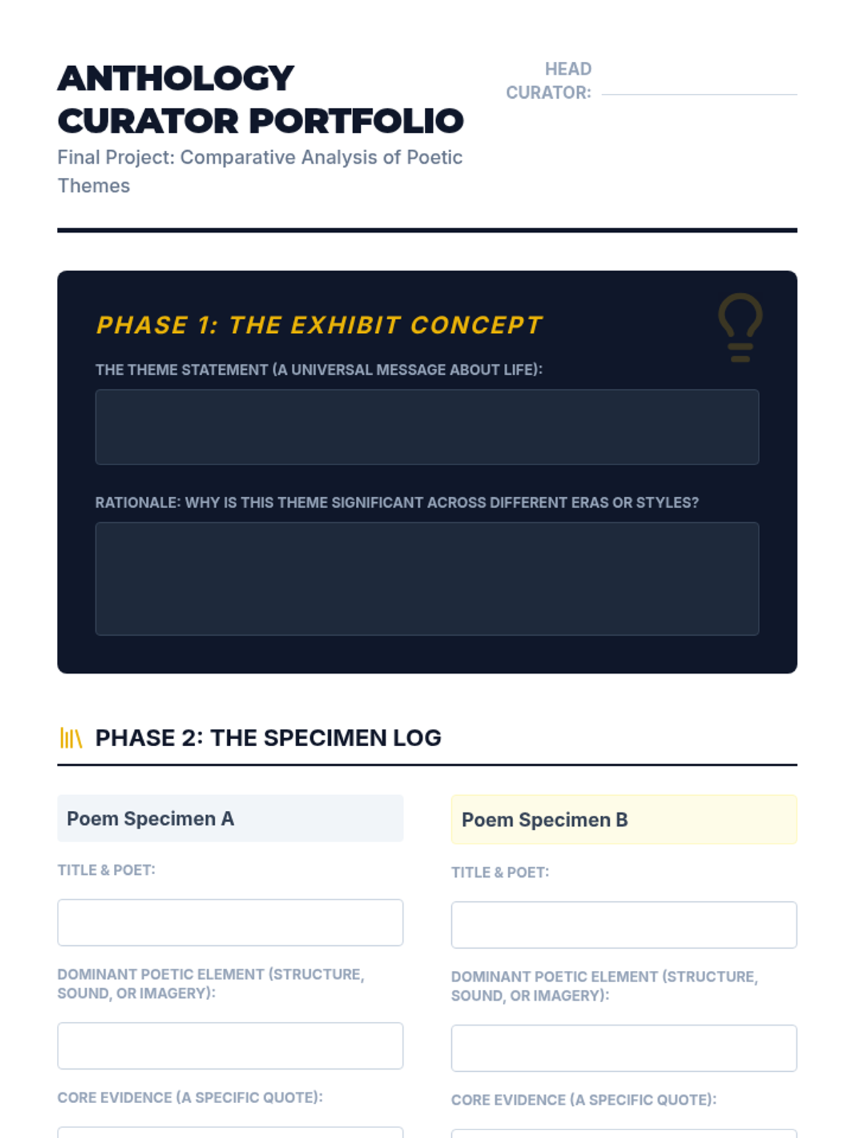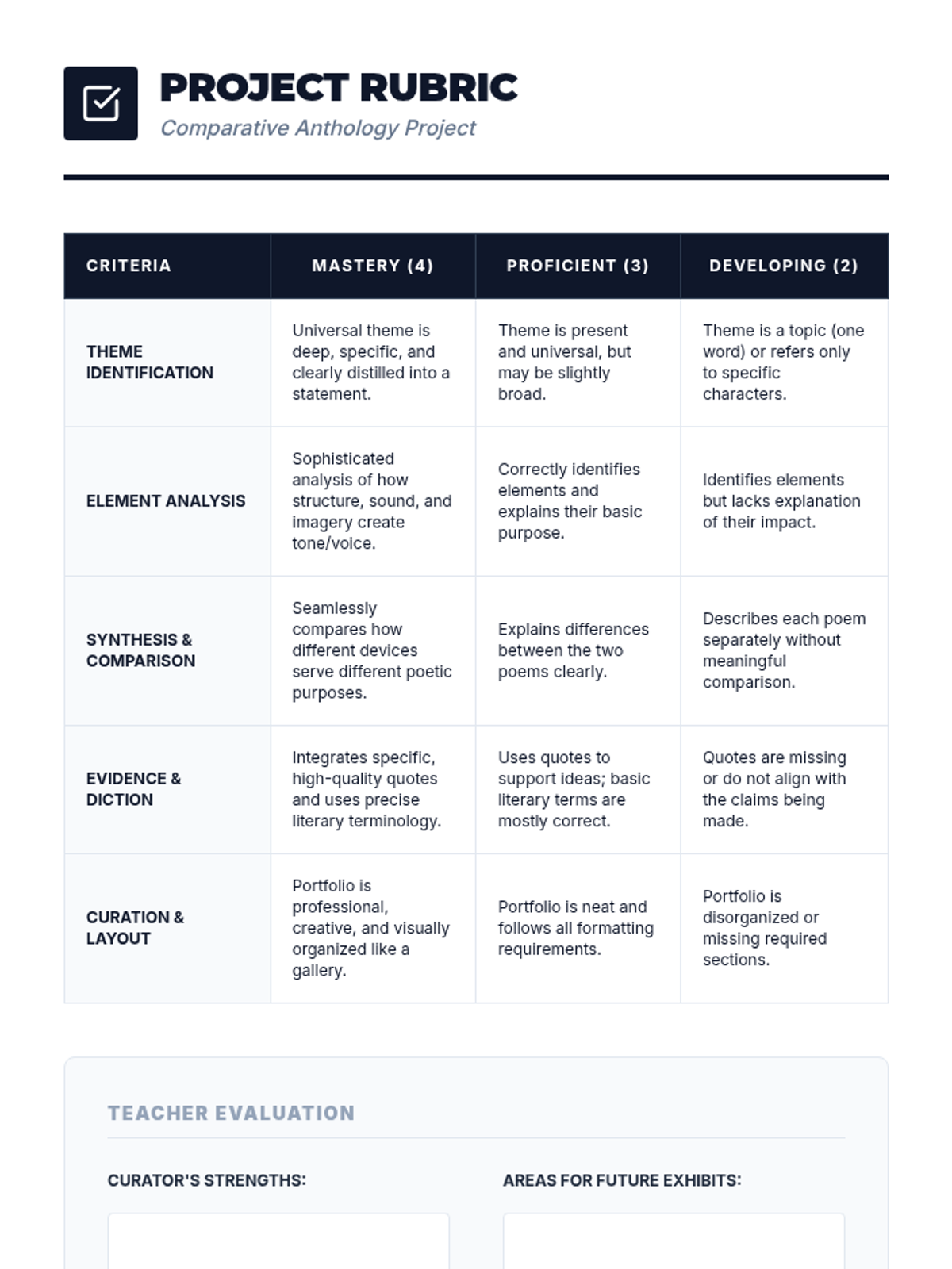 An 8th Grade ELA sequence focused on comparing poetic themes across different eras and styles. Students analyze how structure, tone, imagery, and voice work together to create unique perspectives on universal topics, culminating in a comparative anthology project.
