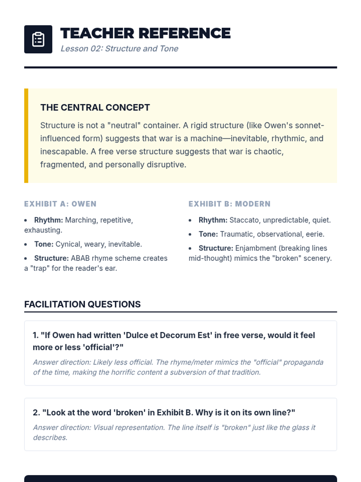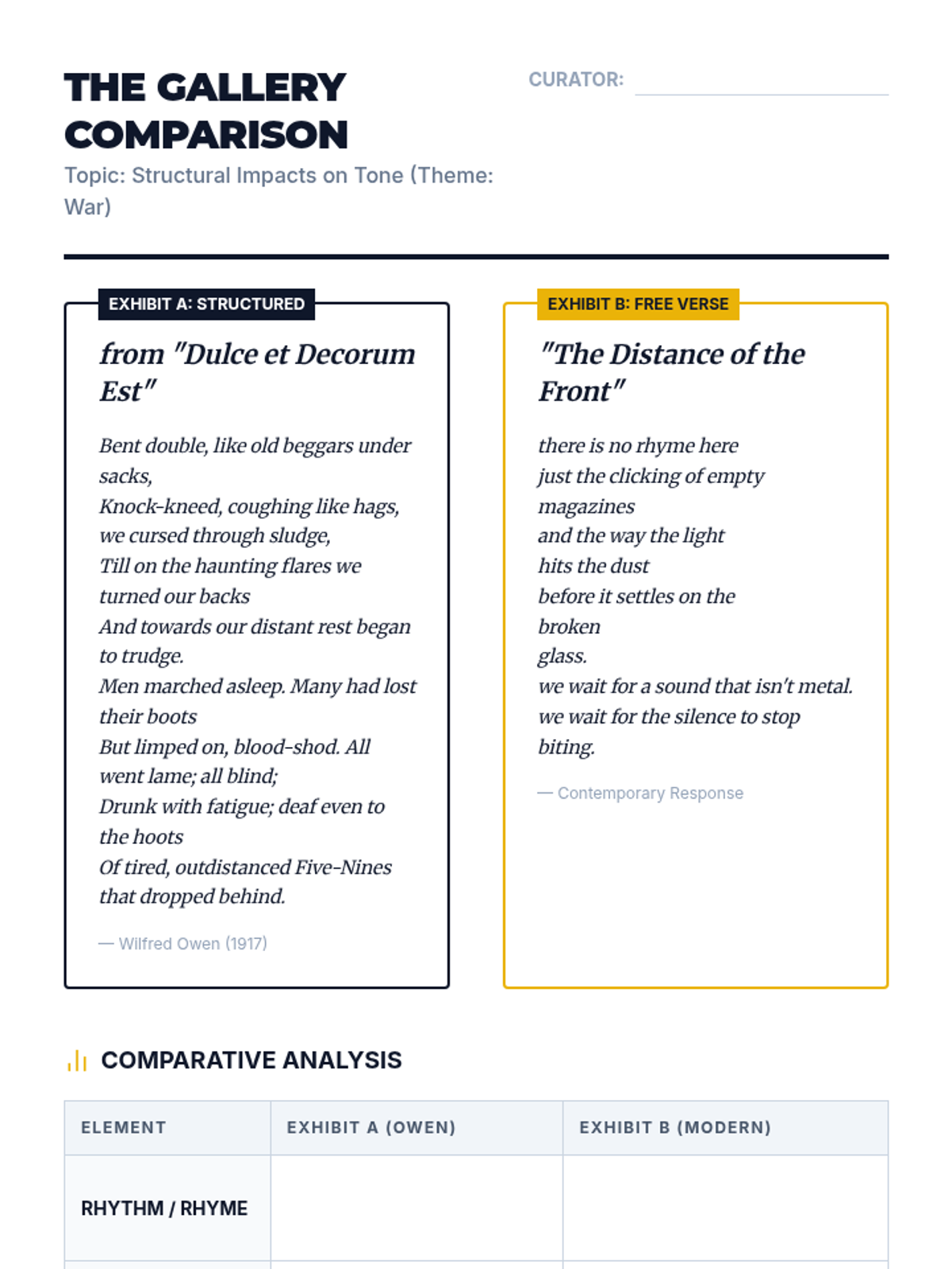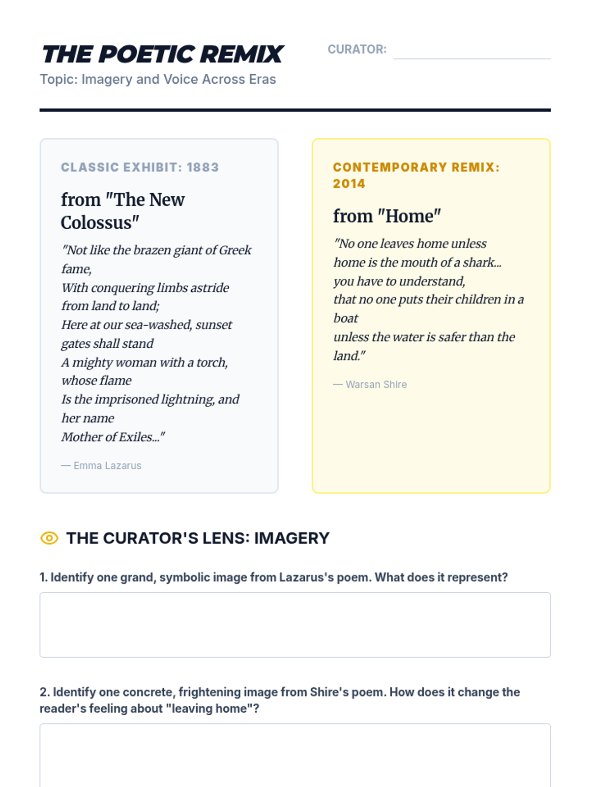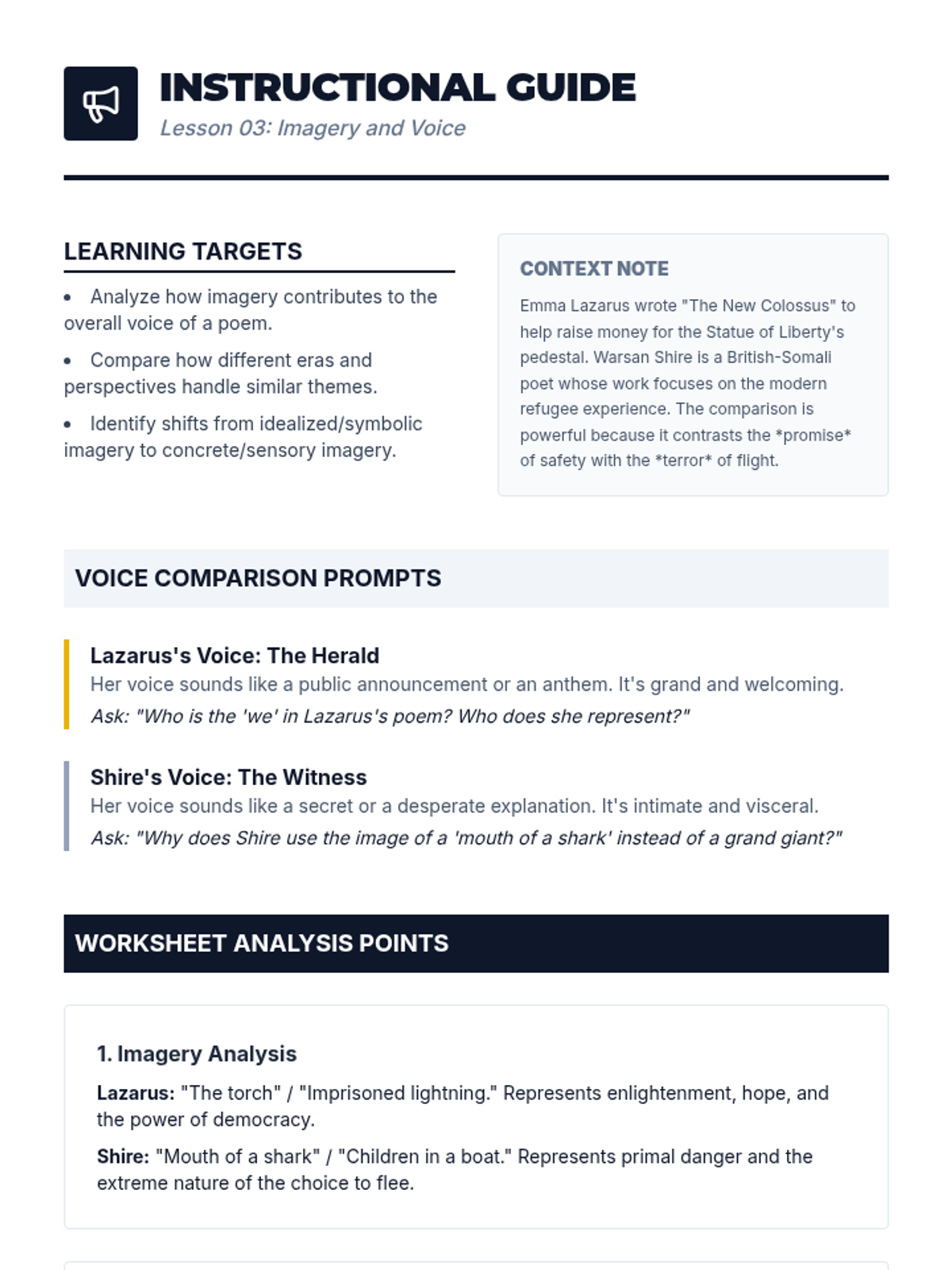 An 8th Grade ELA sequence focused on comparing poetic themes across different eras and styles. Students analyze how structure, tone, imagery, and voice work together to create unique perspectives on universal topics, culminating in a comparative anthology project.